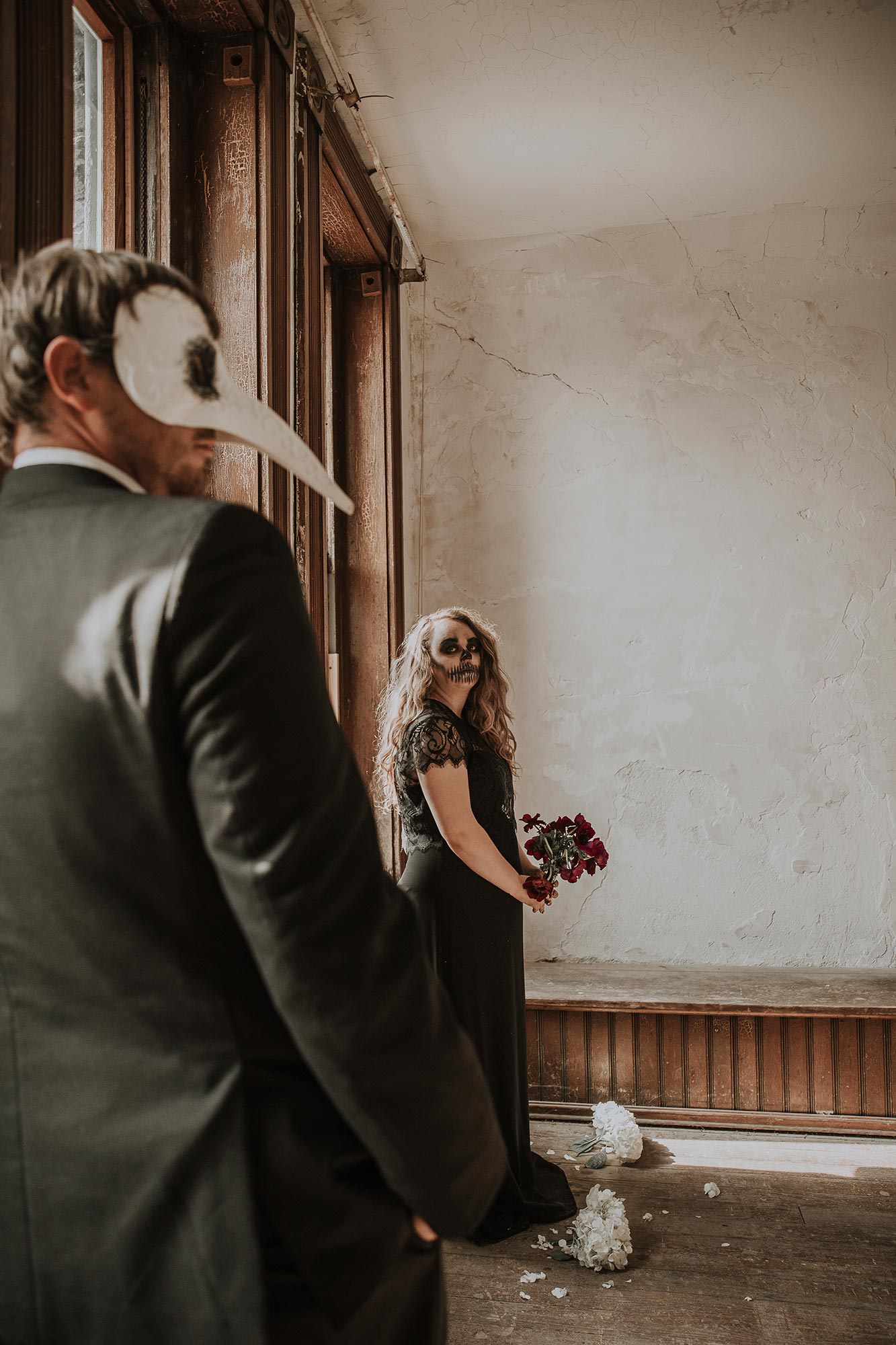 Forevermore Weddings decided to shine a little light on a dark place with their version of a monster fairy tale. Even a monster deserves love! Their vision tells the story of a “normal” man who loves a female “monster” regardless of her darkness. Finding her encourages him to find his true self symbolized by him putting on his mask to match her. Building their own happily ever after.
