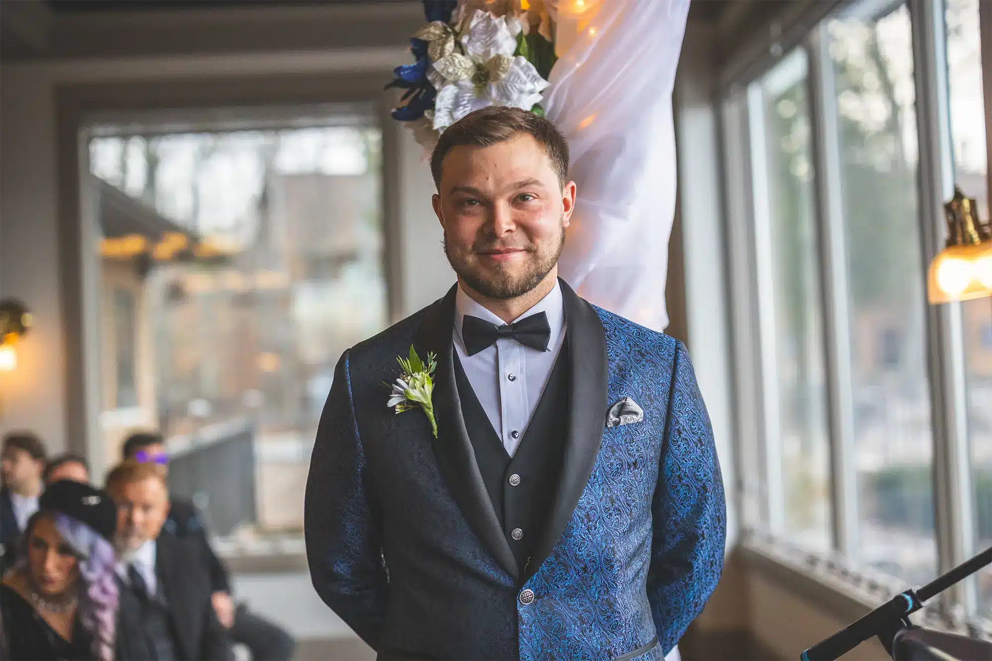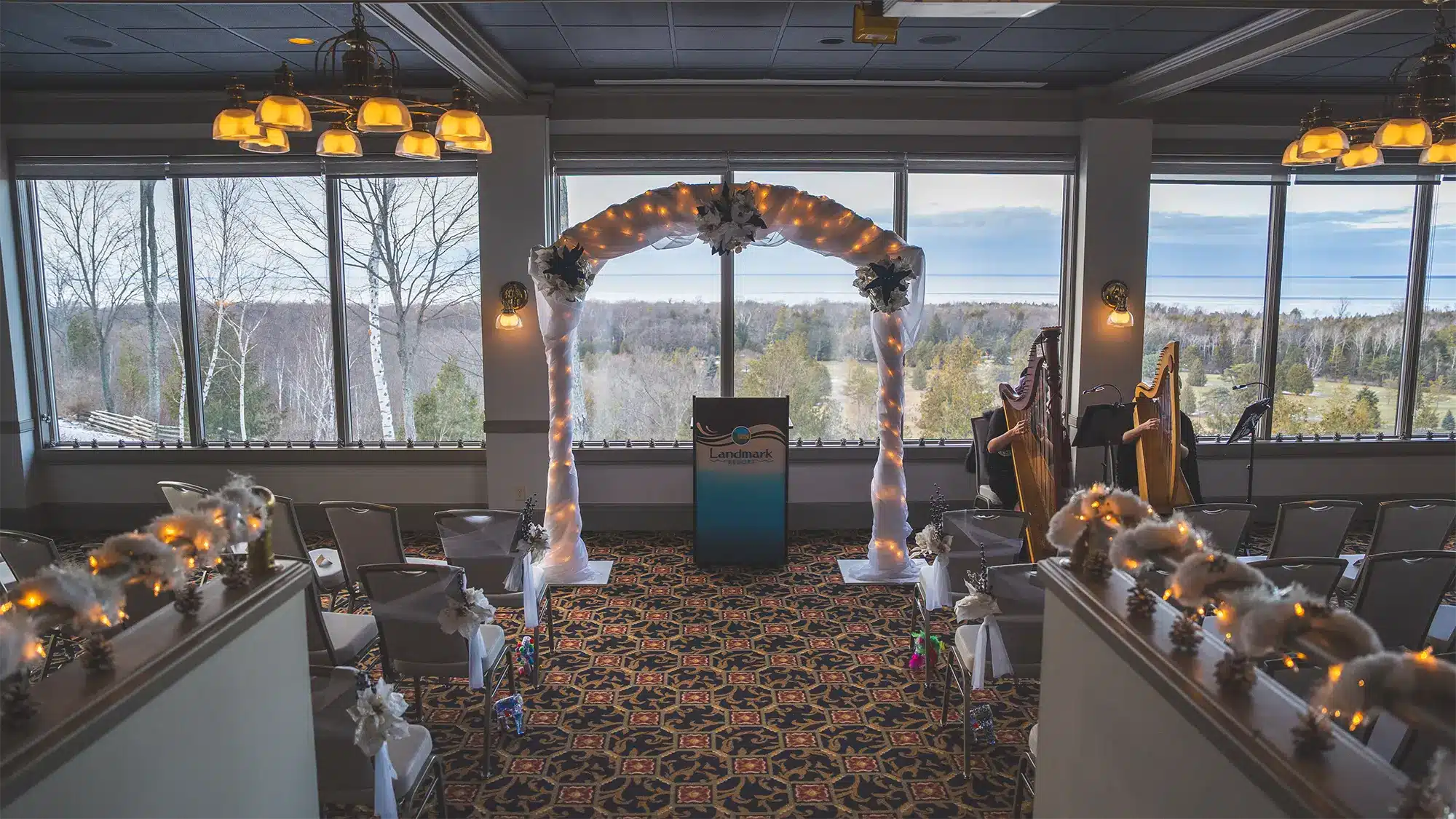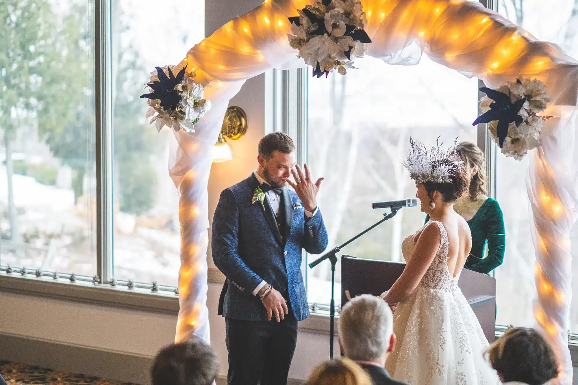 The ceremony took place in the State Room at the Landmark Resort in Door County, with views straight out of a postcard. Alexa and Maxim decorated the room themselves with festive string lights, white garlands, and pinecones.