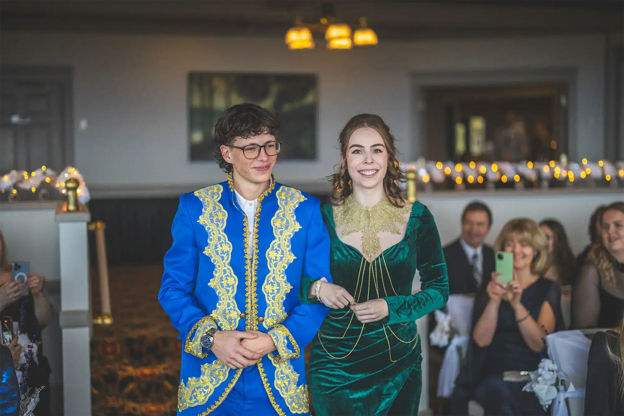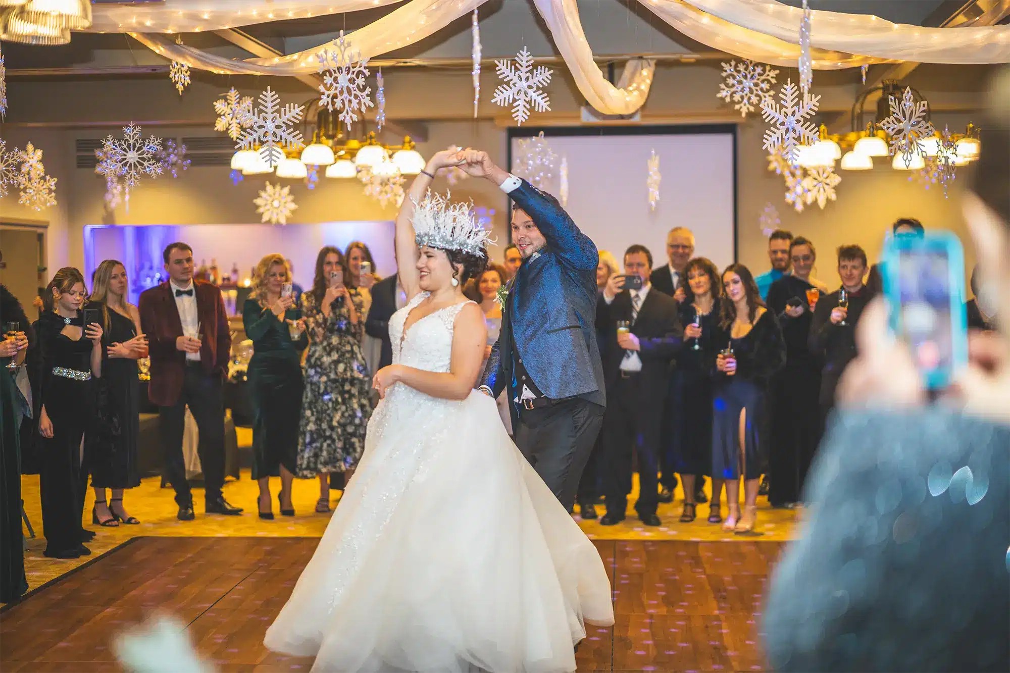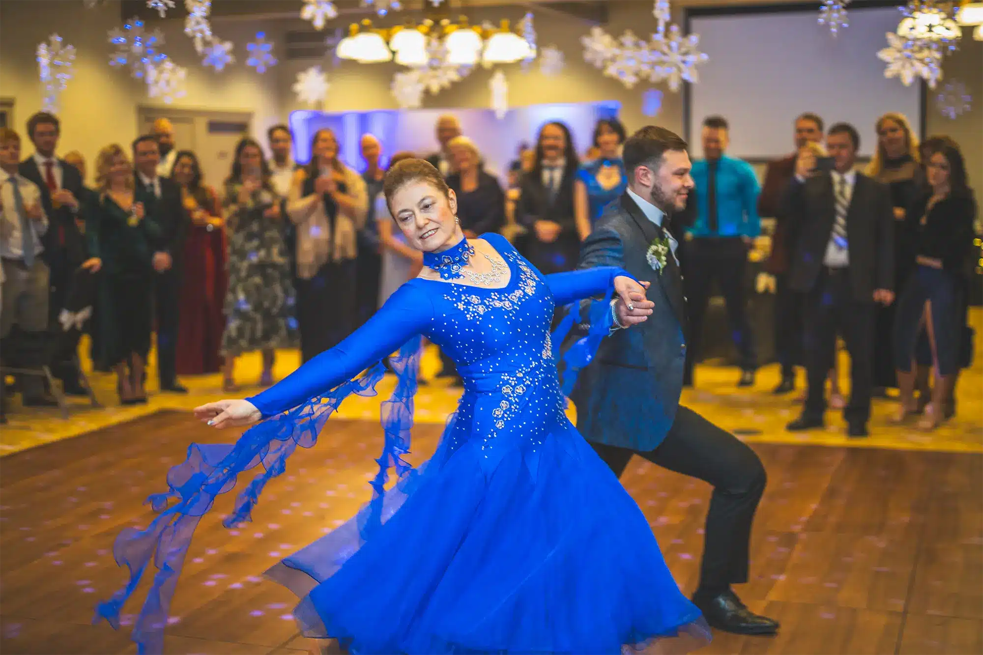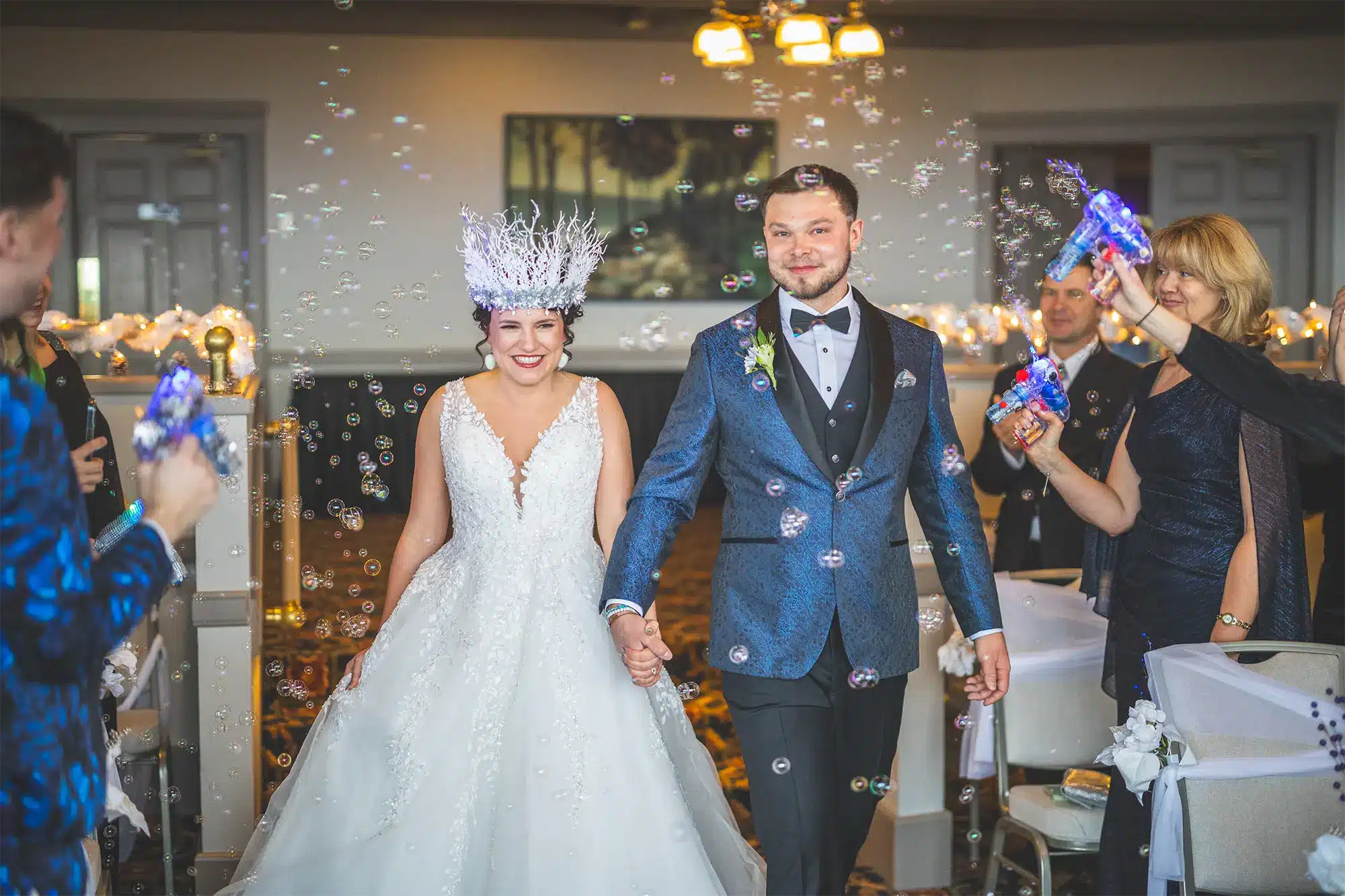 The couple’s wedding vibe was “Extravagant Winter” — a mix of royal blue, gold, silver, and forest green that made the entire space feel both magical and warm. The décor was truly a labor of love: 120 handmade snowflakes hung from the ceiling, and birch tree centerpieces softly glowed across the room. Every detail was created with the help of family and friends, adding even more meaning to the celebration.
