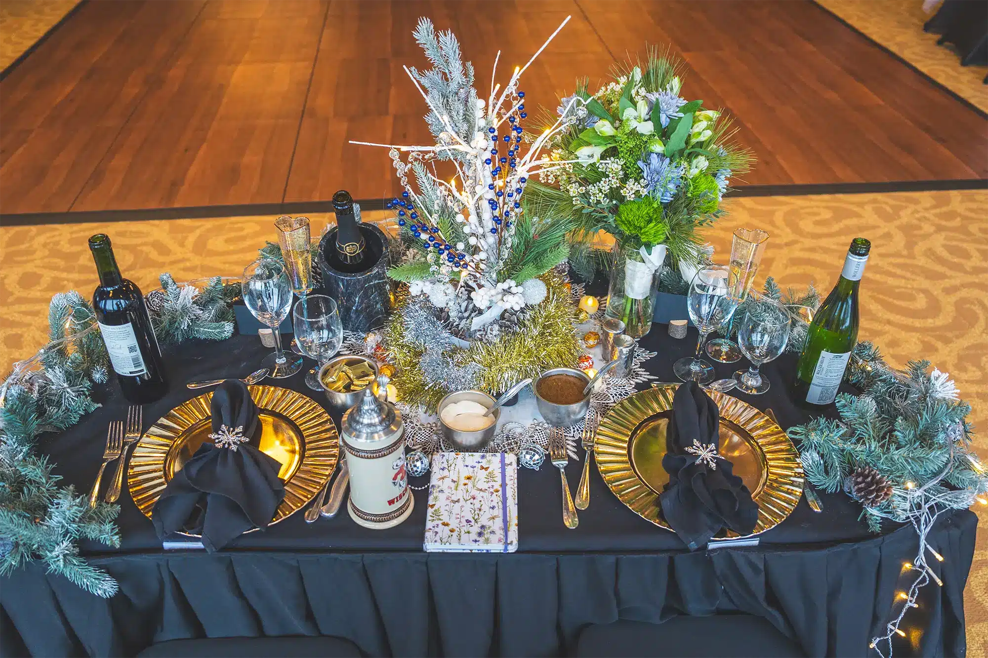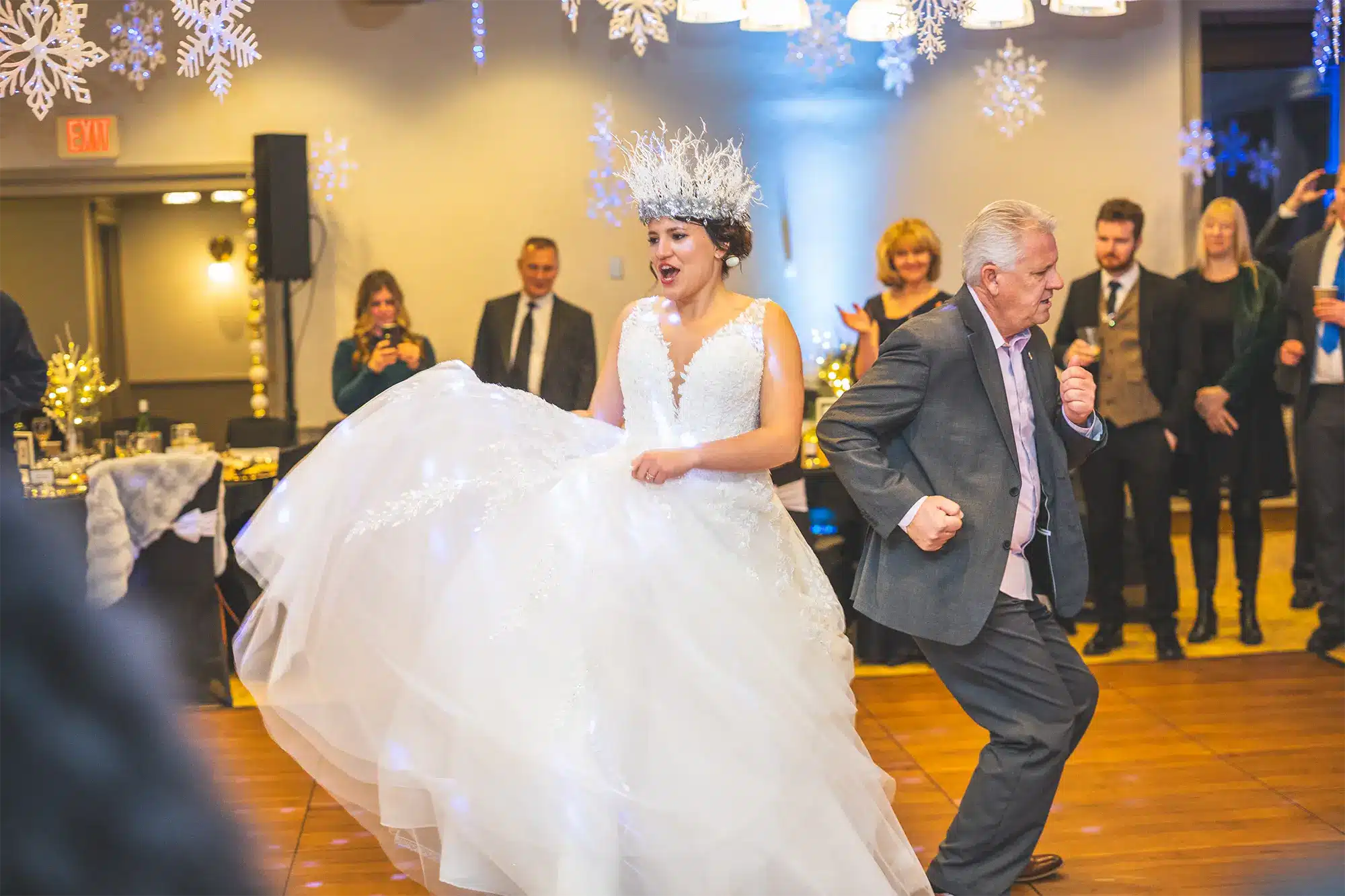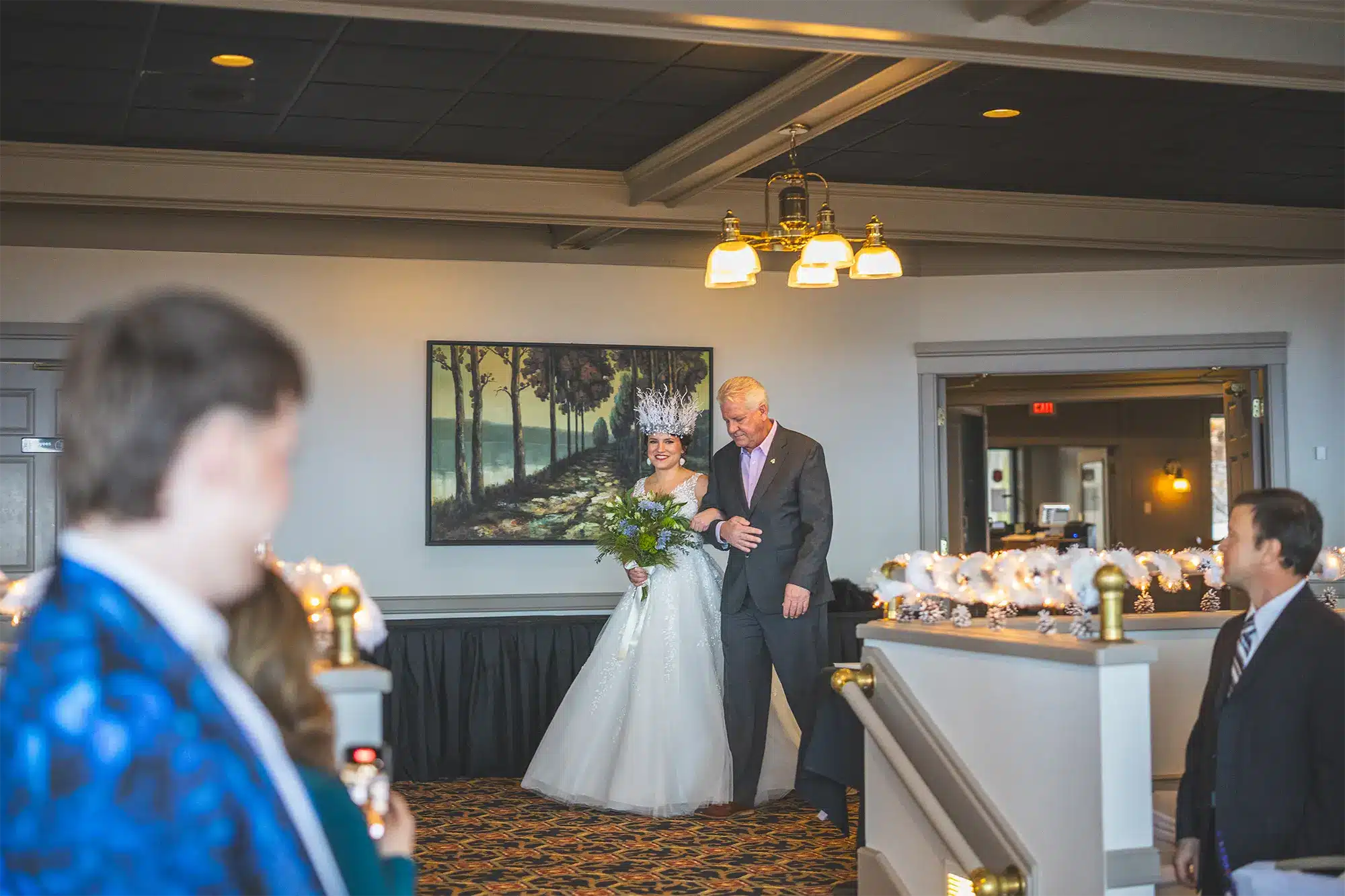 The couple’s wedding vibe was “Extravagant Winter” — a mix of royal blue, gold, silver, and forest green that made the entire space feel both magical and warm. The décor was truly a labor of love: 120 handmade snowflakes hung from the ceiling, and birch tree centerpieces softly glowed across the room. Every detail was created with the help of family and friends, adding even more meaning to the celebration.