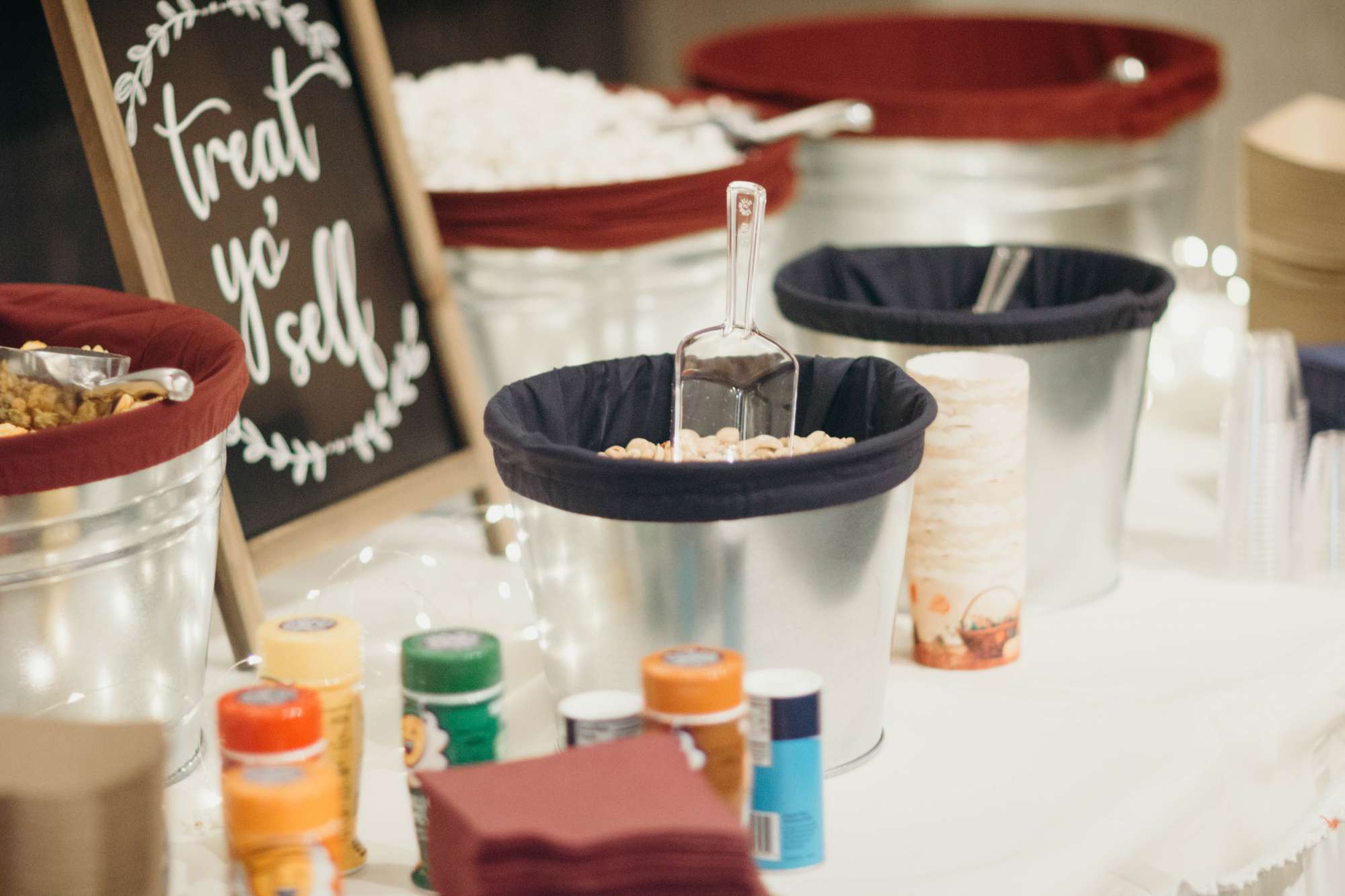 Dinner, catered by Van Abel’s, was a traditional family-style meal of broasted chicken, ham, tossed salad, and mashed potatoes with gravy. There were also assorted dessert bars to cap off the meal. “We had two types of beer available, and instead of wedding cake, we went with cupcakes. We also offered a popcorn and snack bar during the reception. This had a few types of popcorn, pretzels, peanuts, and M&Ms.”