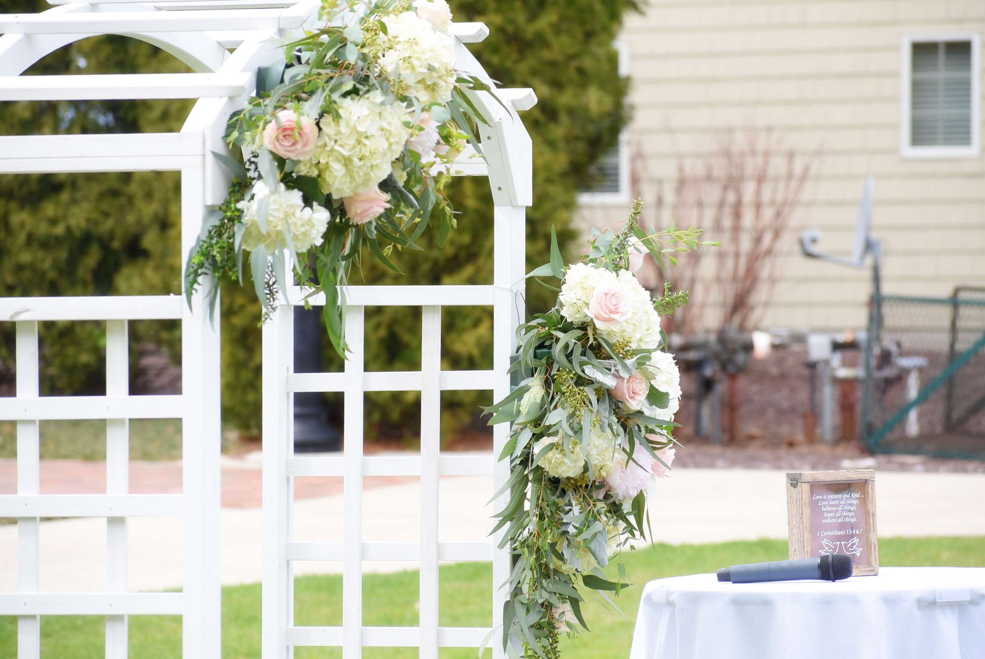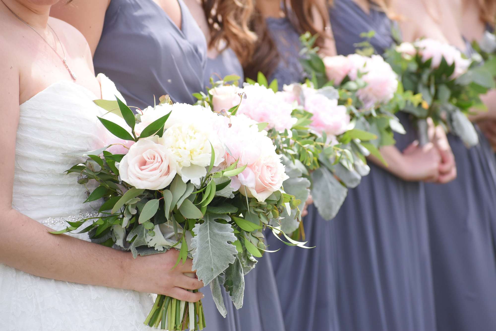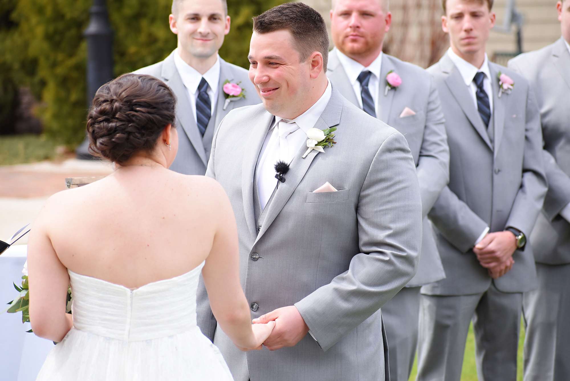 To help bring a fairytale feeling to life, Jordan and Ashtin worked with Buds N Blooms for flowers — ”peonies, hydrangeas, and roses. It was just gorgeous!” The color scheme of the day was soft tones of light pink, grey, and greenery. For photos throughout the day, there was no need to leave Stone Harbor. “We were also able to get pictures with our two sweet dogs that are no longer with us today. That meant so much.”