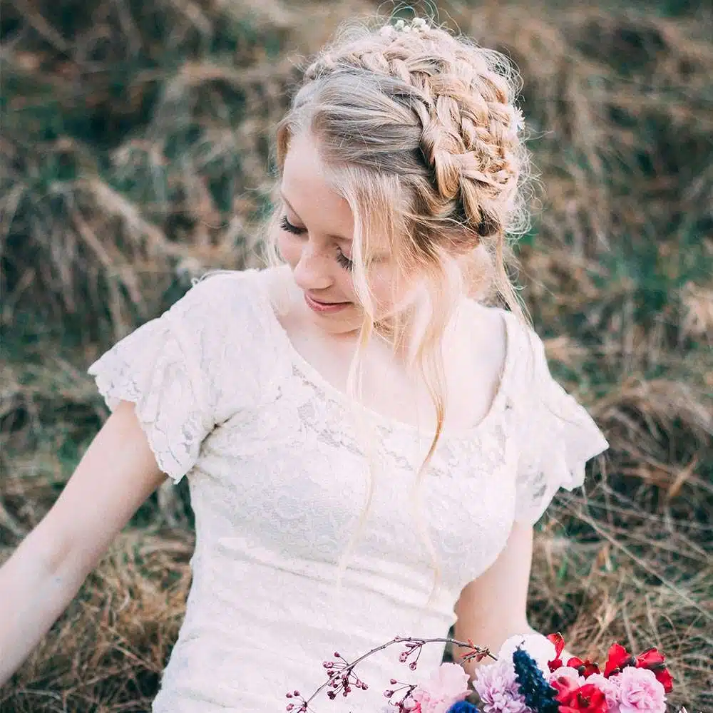 Braids and crown braids in particular are also popular this year. Plaits add texture and create a romantic vibe. And you can wear them messy or sleek to achieve your desired look that matches the style of your wedding.