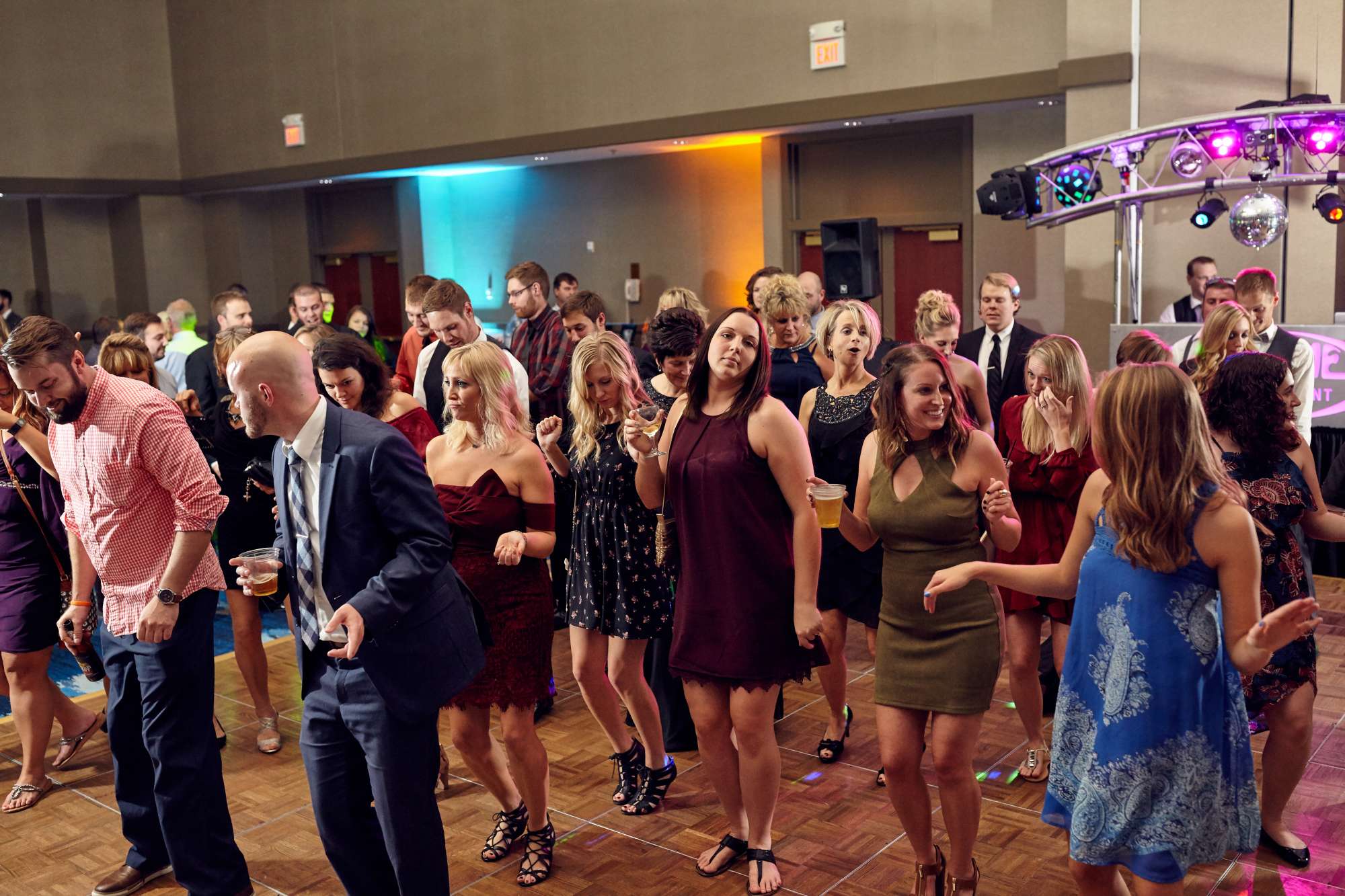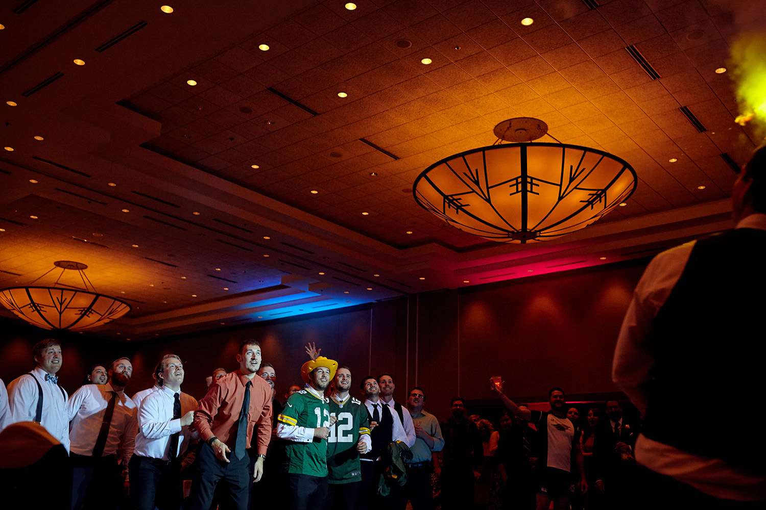 Another highlight of the night for Brian and Cortney was their Packers-themed Grand March. “We walked out to ‘Bang the Drum All Day,’ a classic played at Lambeau Field. We loved getting to have fun with our wedding party!” Cortney says she also enjoyed just soaking in the scene: “I loved getting to share in the memories with my new husband and watch the slideshow of our lives growing up. My final favorite of the day was getting to look around at all of our guests having fun and feeling so blessed that they chose to share this day with us.”