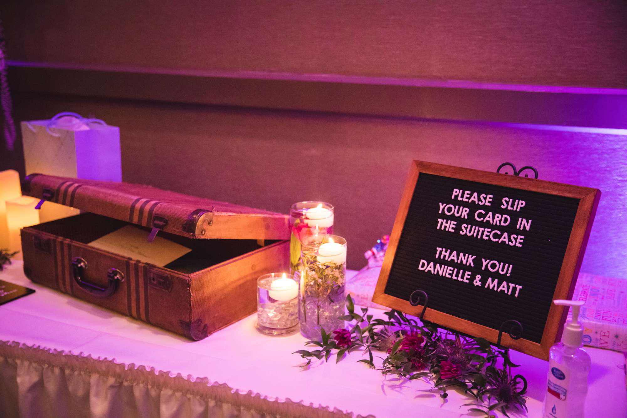 For their wedding reception at the Radisson Green Bay, Danielle and Matt embraced a travel theme in the decor. “Matt and I love to travel and plan to continue to do so throughout our lifetime,” Danielle says. To weave travel into the day, the couple used Danielle’s grandma’s suitcase as the card box, a travel journal as the guest book, and incorporated travel quotes throughout. “Family was also emphasized with our memory table, which included wedding photos of our living and deceased grandparents, along with our parents’ wedding photos.”