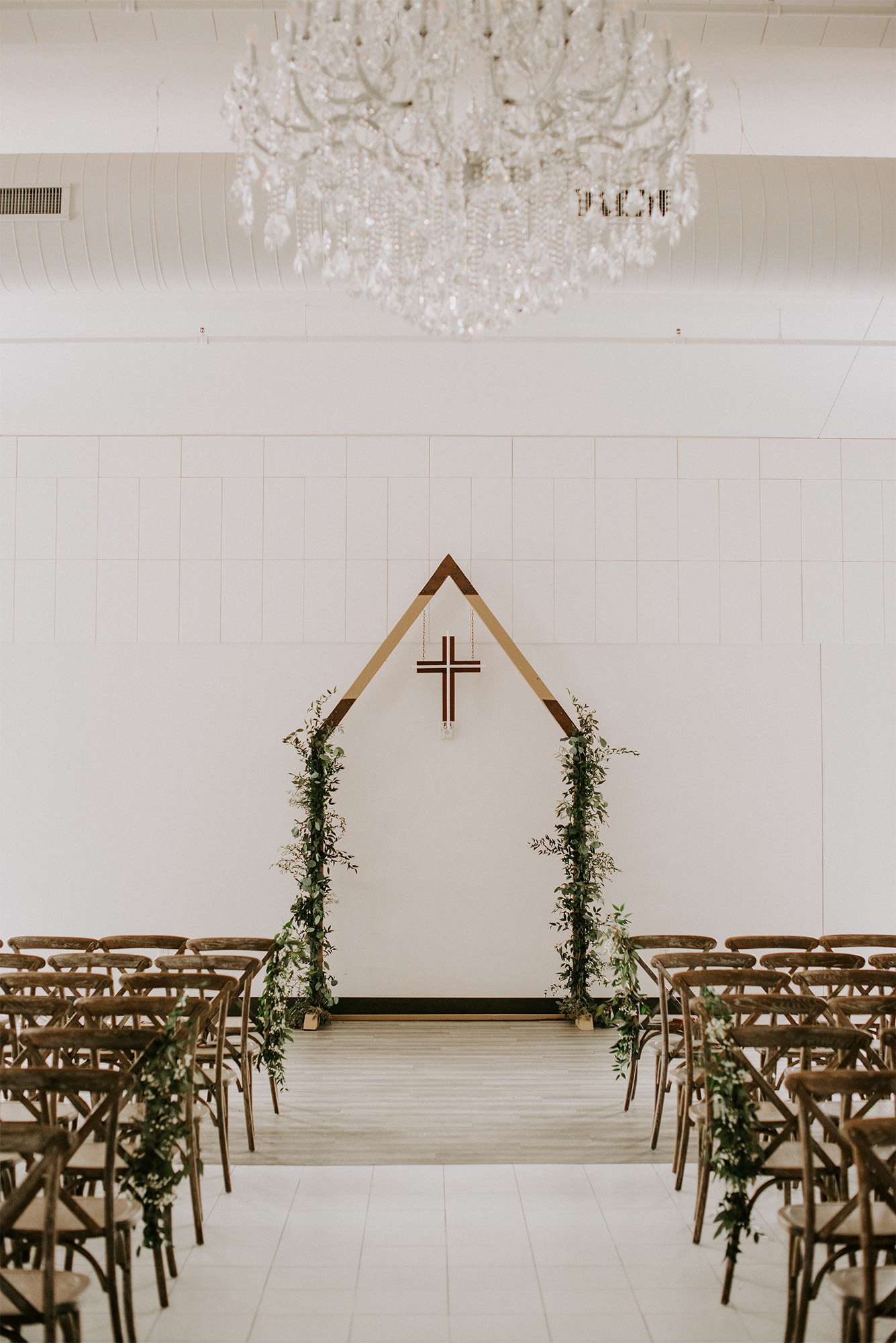 The biggest DIY for the wedding was a ceremony arch that Kaitlyn’s Uncle Chuck made with the help of her dad. It was nearly 11-feet tall and was able to house a large cross inside during the ceremony, then swap in a fun neon sign during the reception. Greenery added to the arch was the perfect finishing touch. “All pictures turned out incredible with the arch as a focal point in the background with the sentimental value of having it made by family.”