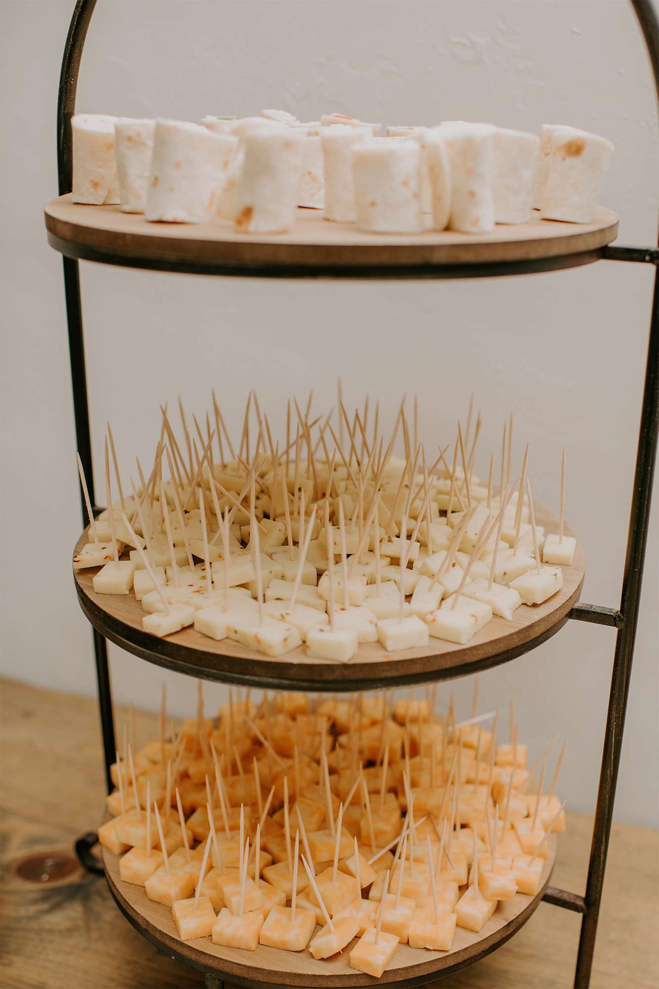 The bride and groom opted for a 3:00 ceremony with the cocktail hour starting right at 3:30 until 5:30. They loved having everything in one place. For dinner, there was a pig roast which became barbecue pork sandwiches, plus broasted chicken, macaroni and cheese, mashed potatoes, pasta salad, coleslaw, and more. There was a faux wedding cake for pictures, plus custom cookies for guests to enjoy. “We had them individually wrapped so people could take them home as a wedding favor to eat later or they could open it and eat it right away.”
