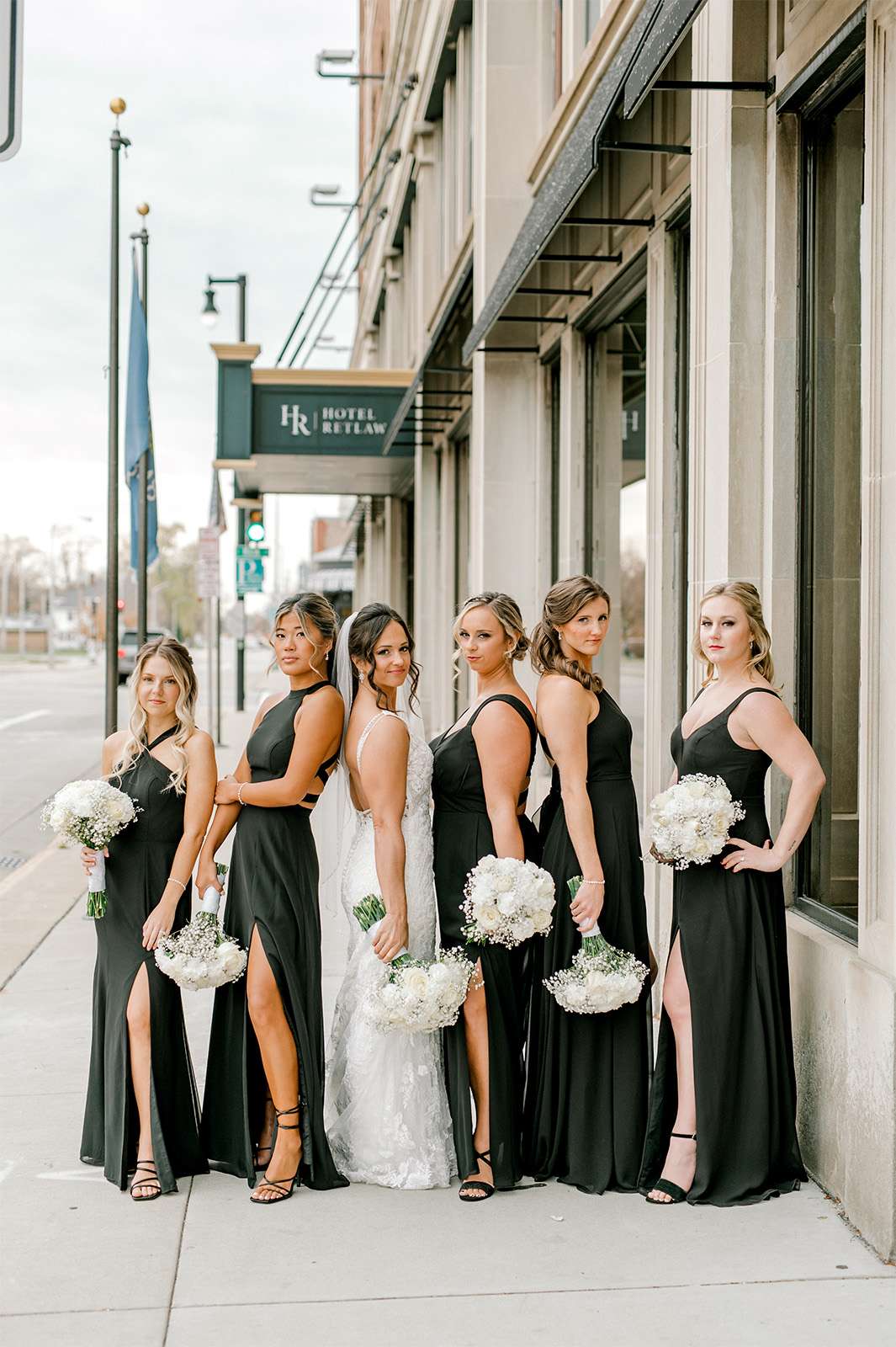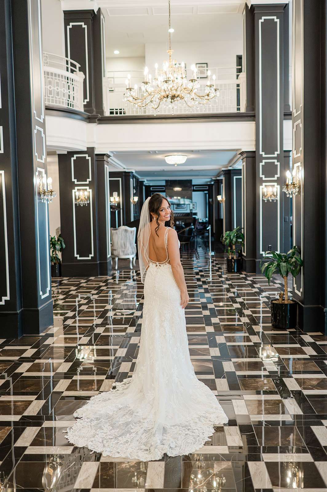 About a year prior to the wedding, Emily Kettner Photography shot the couple’s engagement photos. She was the perfect choice to document the wedding day. The Hotel Retlaw served a magnificent backdrop. The glamorous art-deco lobby offers crystal chandeliers, porcelain-tiled floors and black and white panels adorning the pillars and doors. The couple took photos in front of the hotel, in the lobby, and on the terrace both before and after the ceremony. Austen and Giana praise Emily’s work and for really going above and beyond, posing the couple for the photos, and keeping them on their timeline. They say Emily was also great about working with their coordinator and videographer.