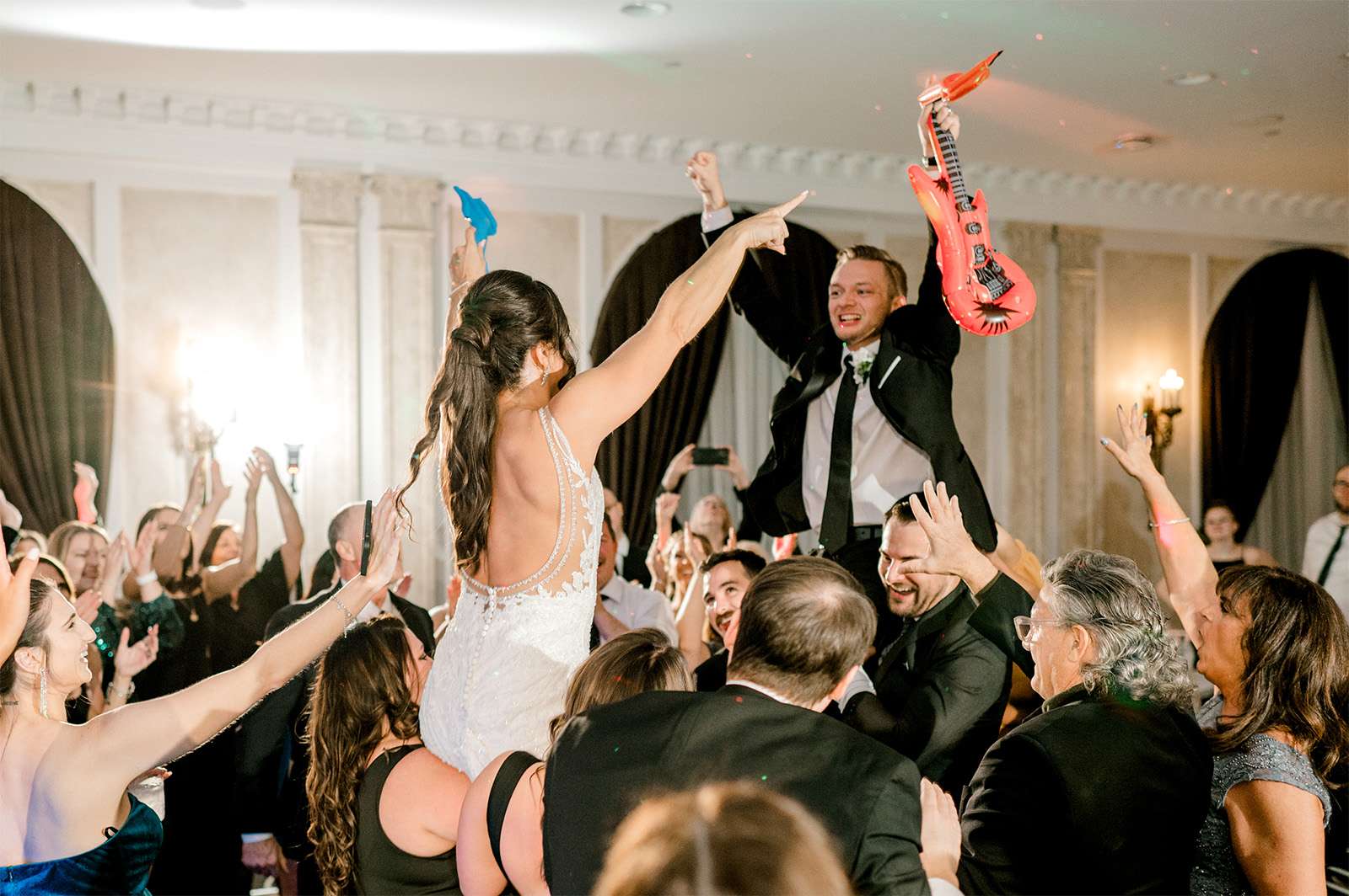 But the reception was all about the dancing. The couple choreographed their first dance which included a crowd-pleasing lift of Austen by Giana. Giana also had a first dance with her parents and then it was a big party for all on the dance floor. The bubble machine was turned on and blow-up guitars were handed out. The couples favorite moment was when they were hoisted onto the shoulders of their guests and played “air guitar”. For the rest of the night, it was all about the dancing.