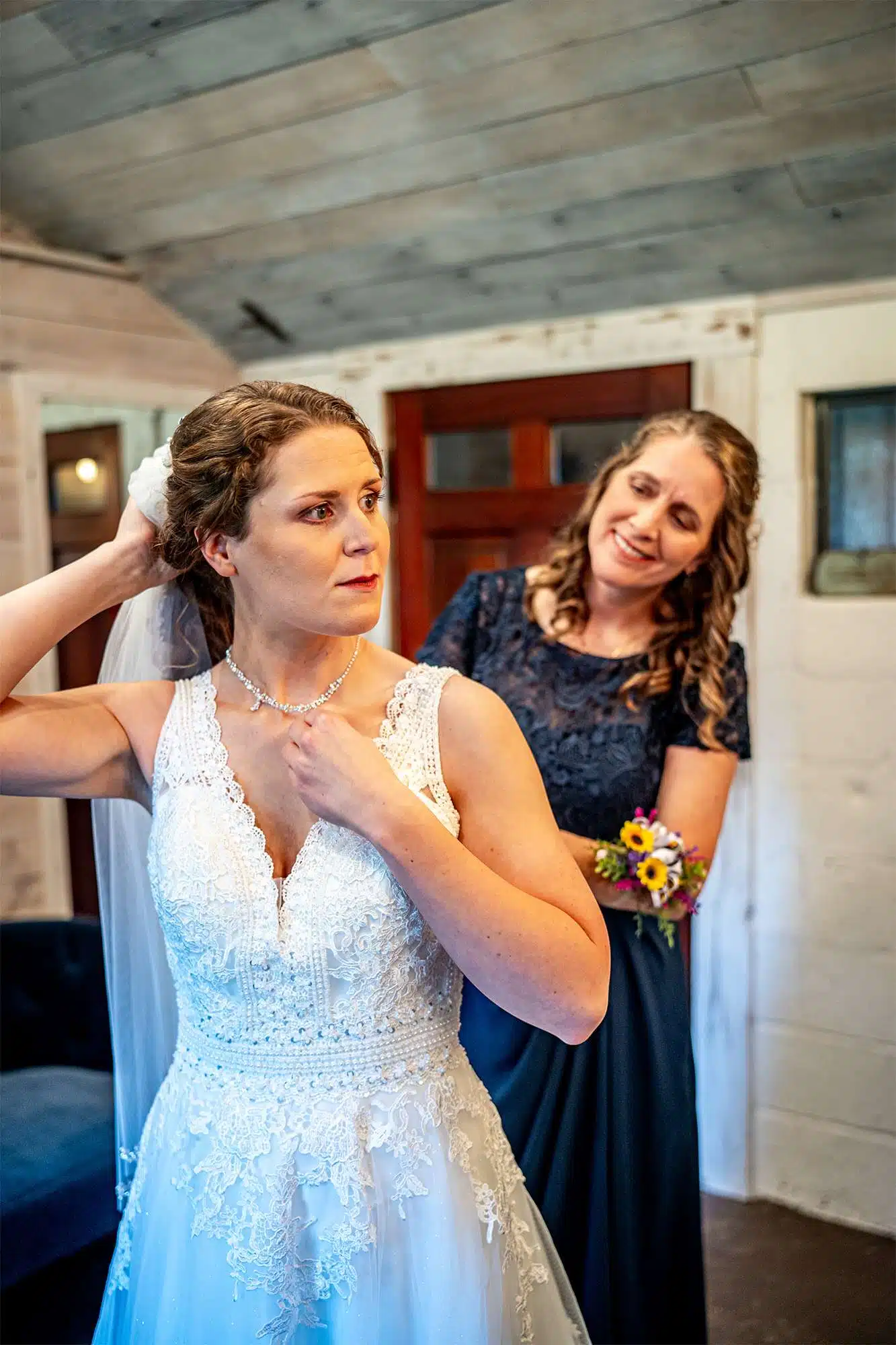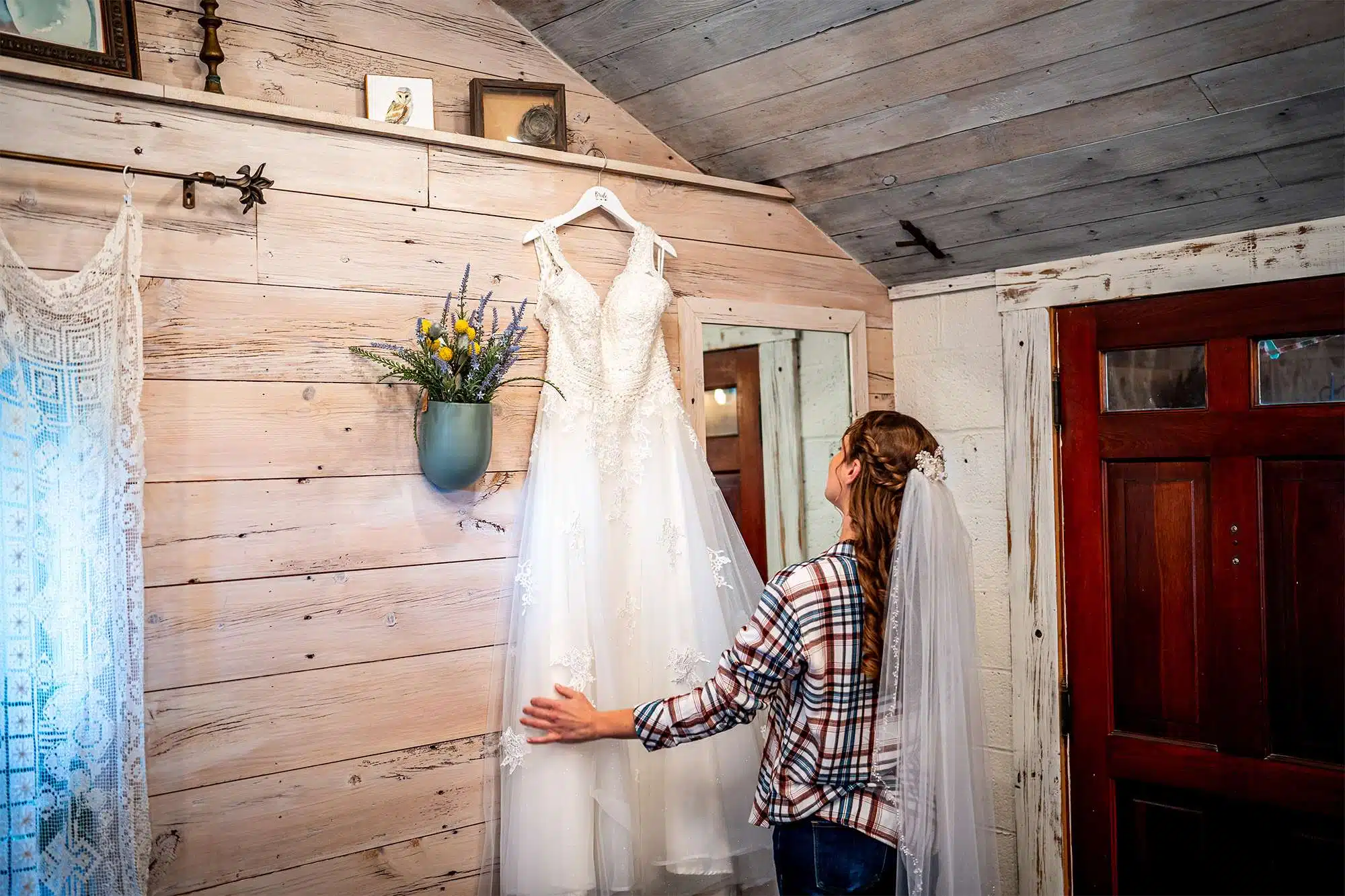 “I tried on five dresses. Everyone loved the first dress.” Erin says she compared all of the other dresses to the first one. It had the lace and beading that she wanted but ultimately felt the most comfortable and she thought it would fit well with the theme of the wedding and the venue.