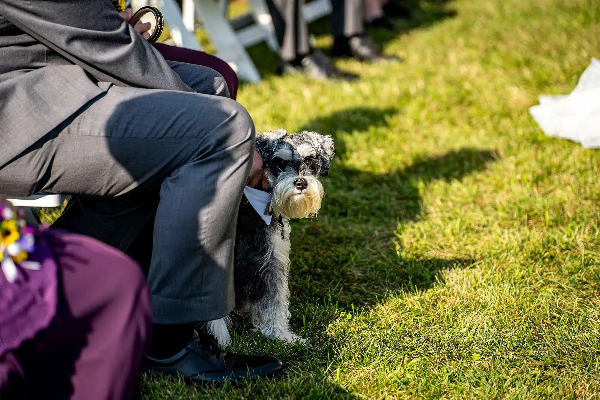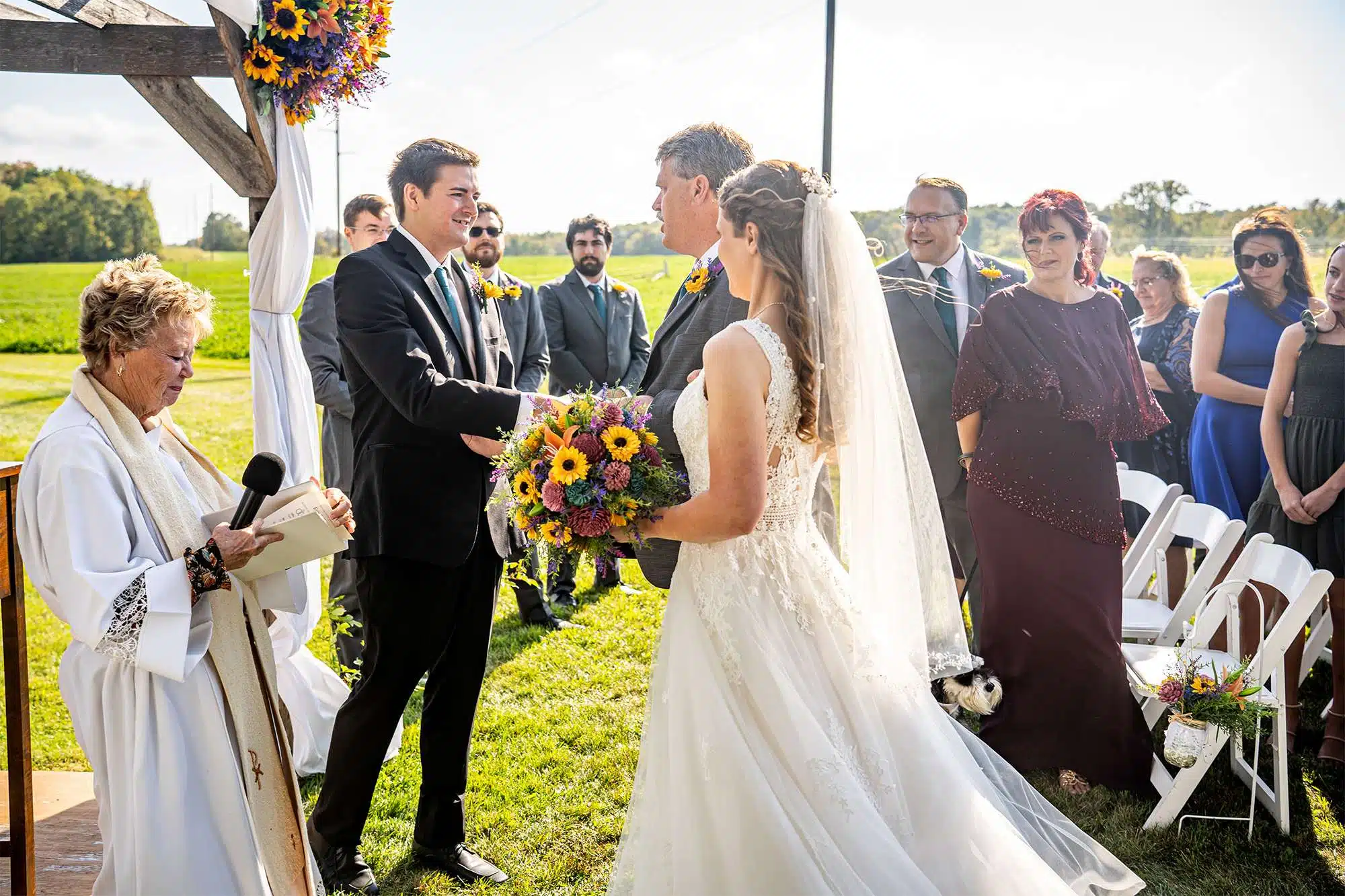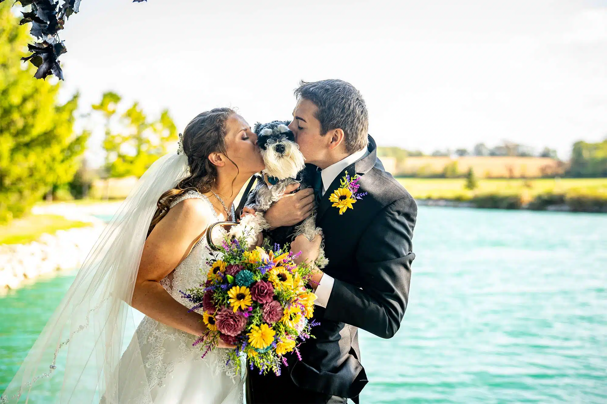 Erin and Quinten had their ceremony outdoors, by the water, at Woelfel Homestead Farm Venue. The aisle was lined with bundles of flowers containing sunflowers, lilies, carnations, and more, all set inside a decorated mason jar and hanging on small shepard’s hooks. The bride and bridesmaids carried bouquets of similar configurations. For pre-wedding music, the couple chose for the DJ to play instrumental versions of their parent’s and grandparent’s first dance songs. The couple’s miniature schnauzer, Sprecher, served as the ring bearer. Erin says one of the most memorable moments happened at the end of the ceremony. “We took the wrong que and ended up walking back up the aisle before the officiant officially pronounced our marriage!”