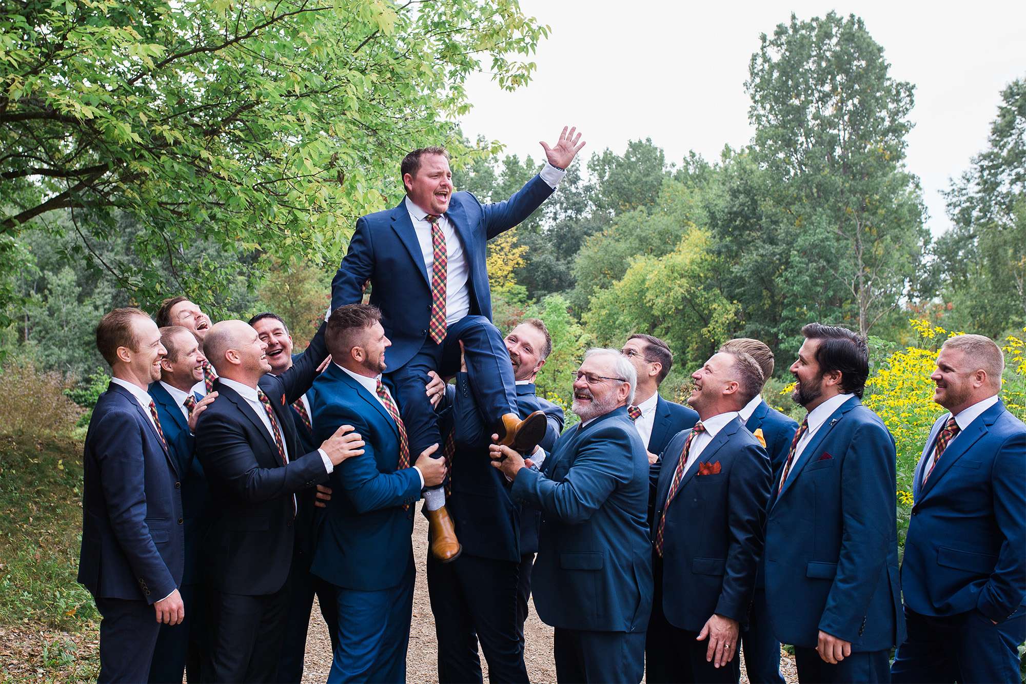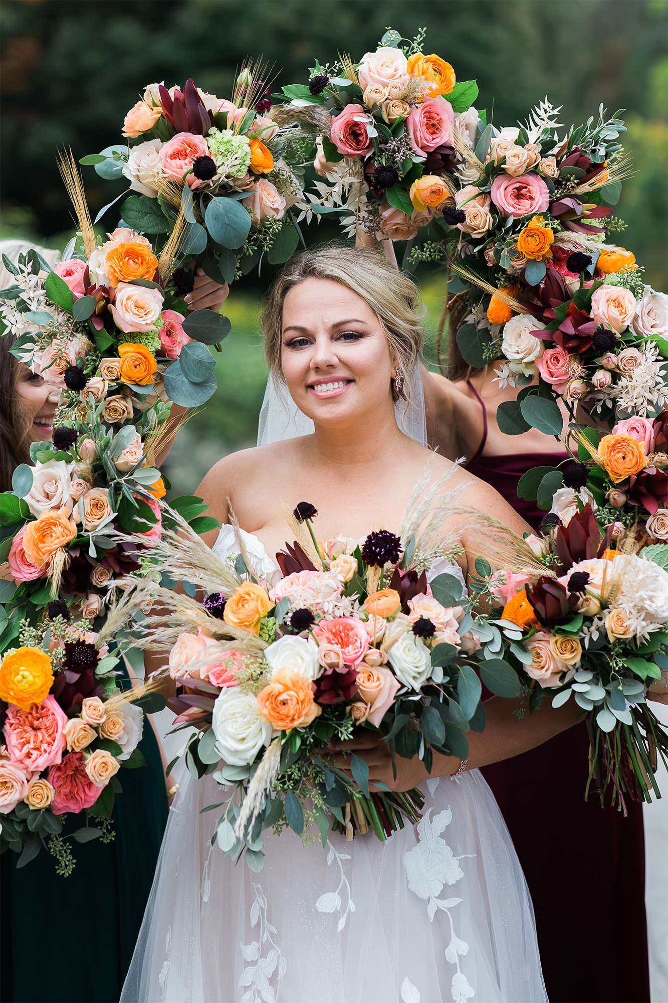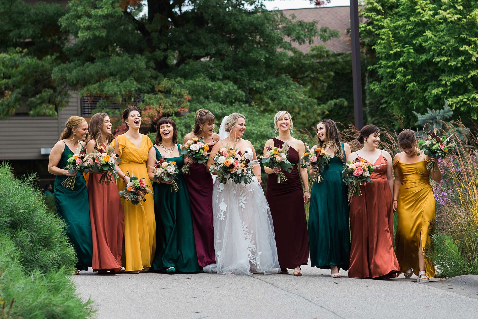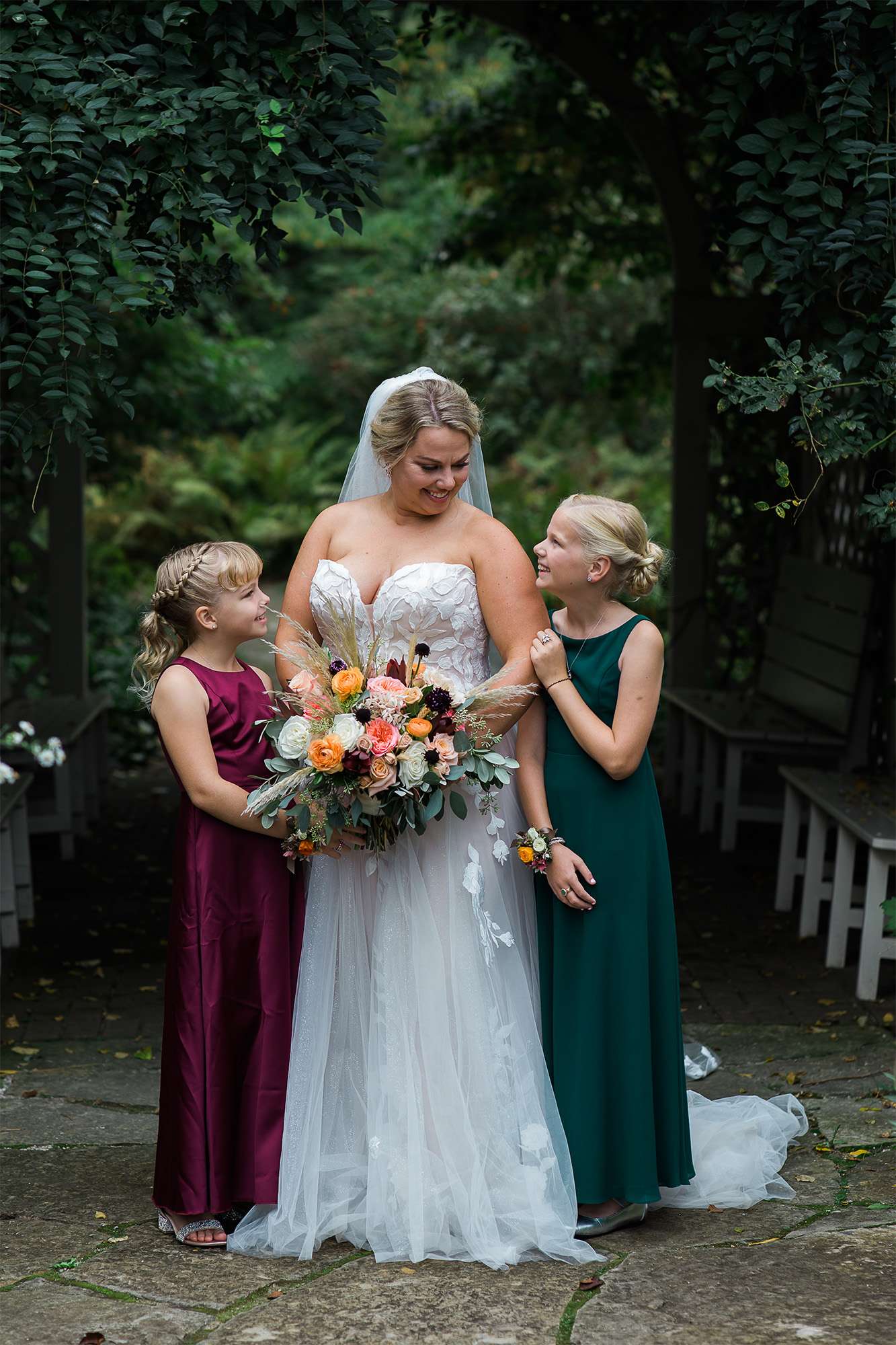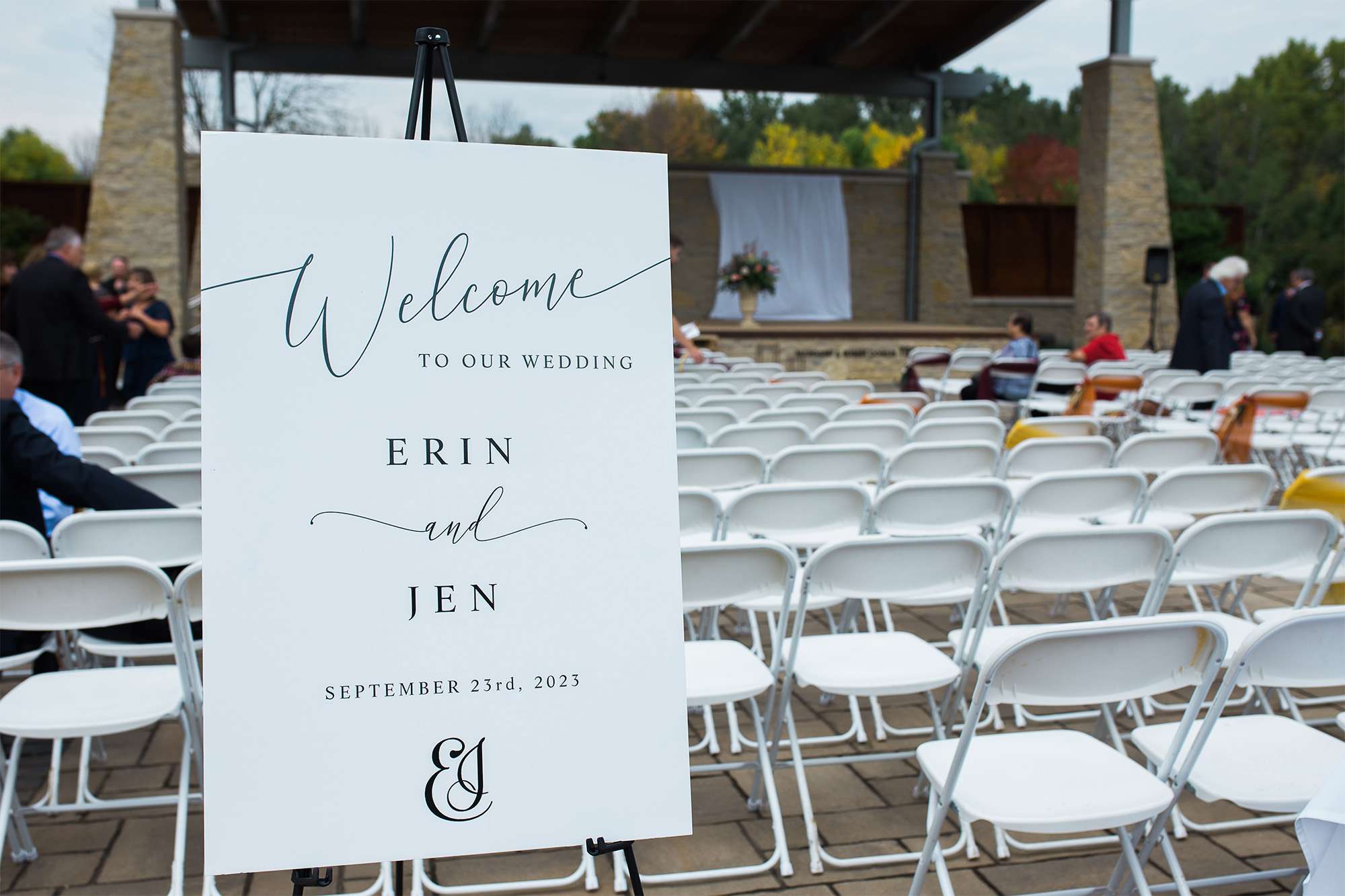 Jen and Erin got married at the Green Bay Botanical Garden. Every element of the ceremony was personalized, from writing their own vows, to Erin’s best friend serving as the officiant, to their moms reciting messages to their son and daughter, to Erin’s uncle singing a song he also performed at his parents’ wedding. In lieu of a traditional candle lighting during the unity, the entire wedding party signed a football. Buds ‘n Bloom Design Studio in Green Bay created the stunning floral arrangements.