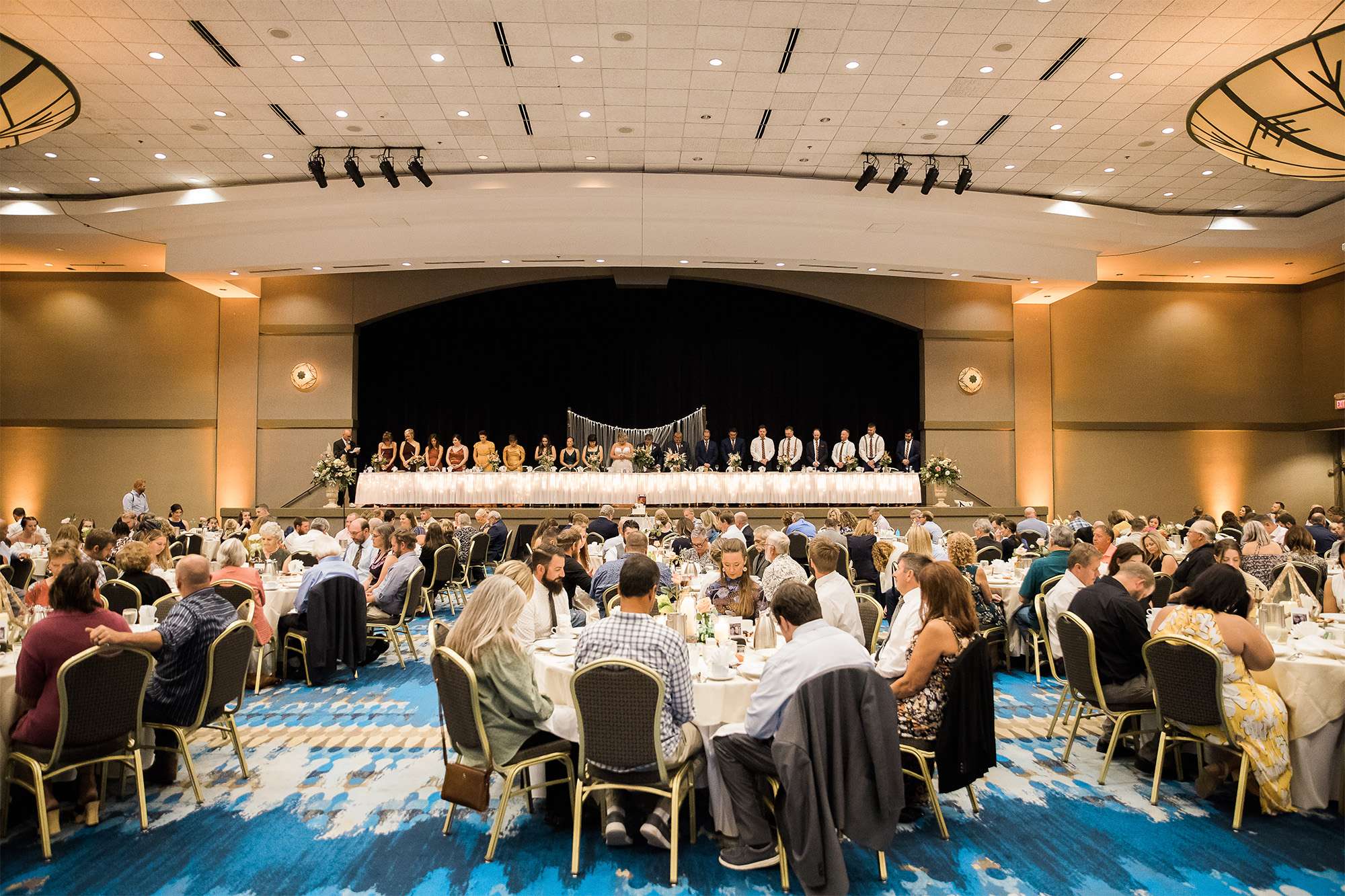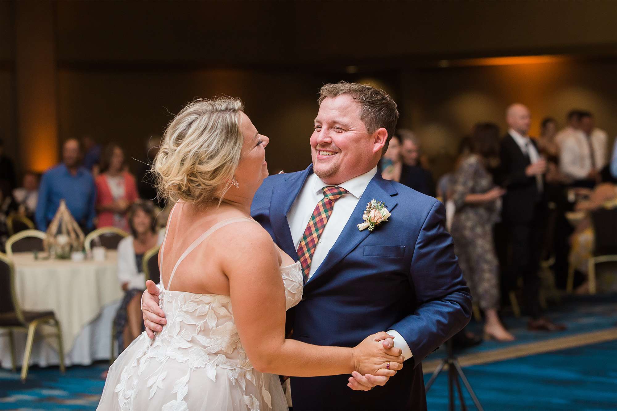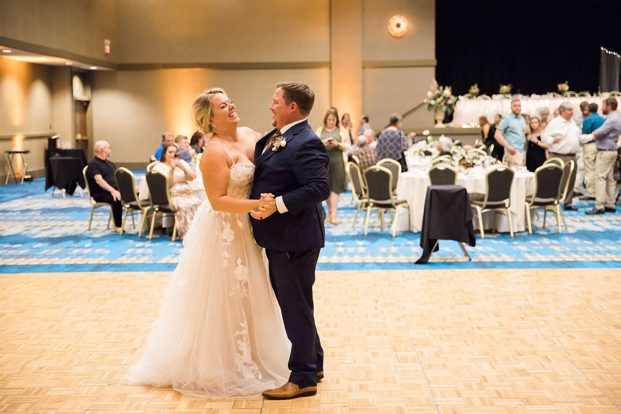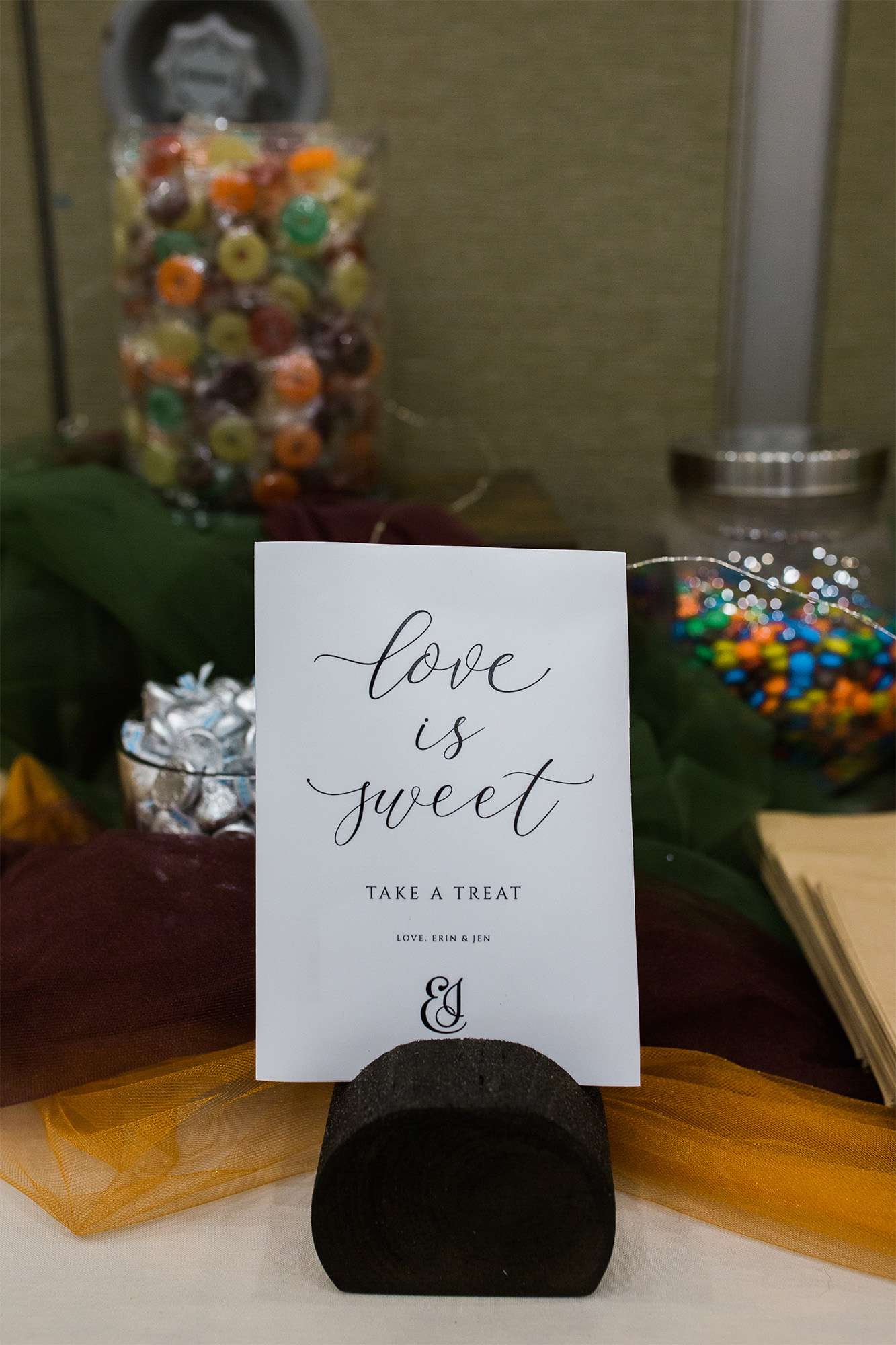 The party continued in the Three Clans Ballroom at the Oneida Hotel in Green Bay. Many of Erin’s friends and family are Green Bay Packers fans, and Jen’s friends and family are Minnesota Vikings fans, so it only made sense to have a sports-themed wedding. The DJ even played the Vikings fight song as Jen’s dad walked up to the mic for his father-of-the-bride speech. The newlyweds shared their first dance to “Mango Tree” by Zac Brown Band, the song that played when they first said “I love you” to each other.
