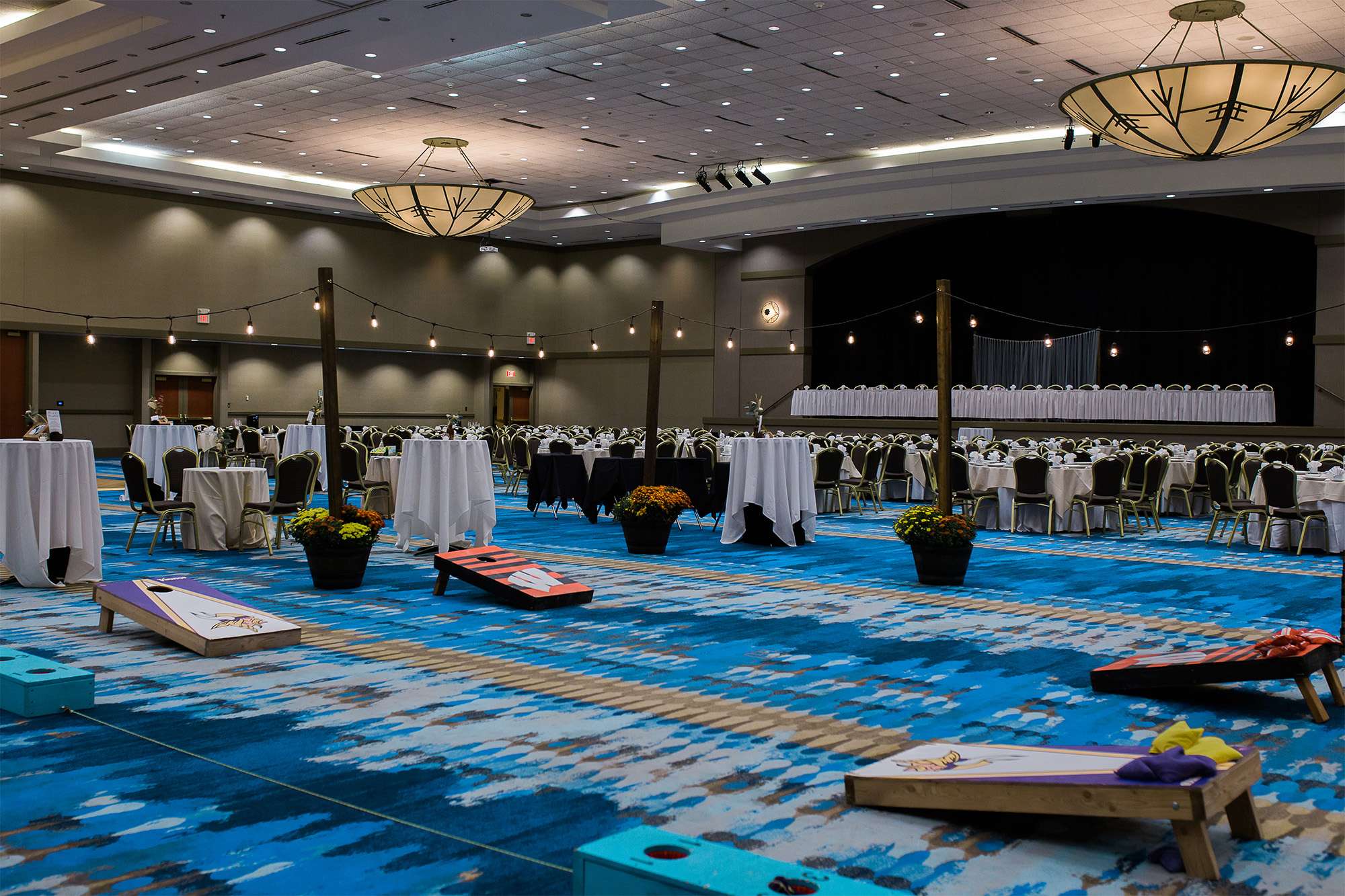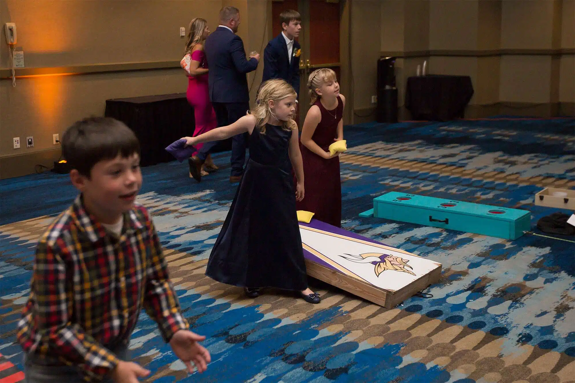 Jen and Erin created an “outdoor” setting with potted plants and light posts to section off a game area, complete with cornhole, jumbo Jenga, a coin toss, a coloring table for the kids, and a big screen TV that played college football games all night (particularly the Notre Dame vs Ohio State matchup).