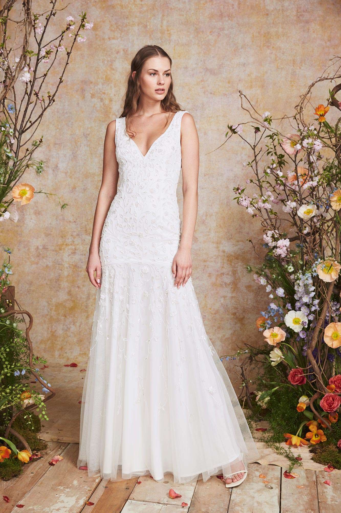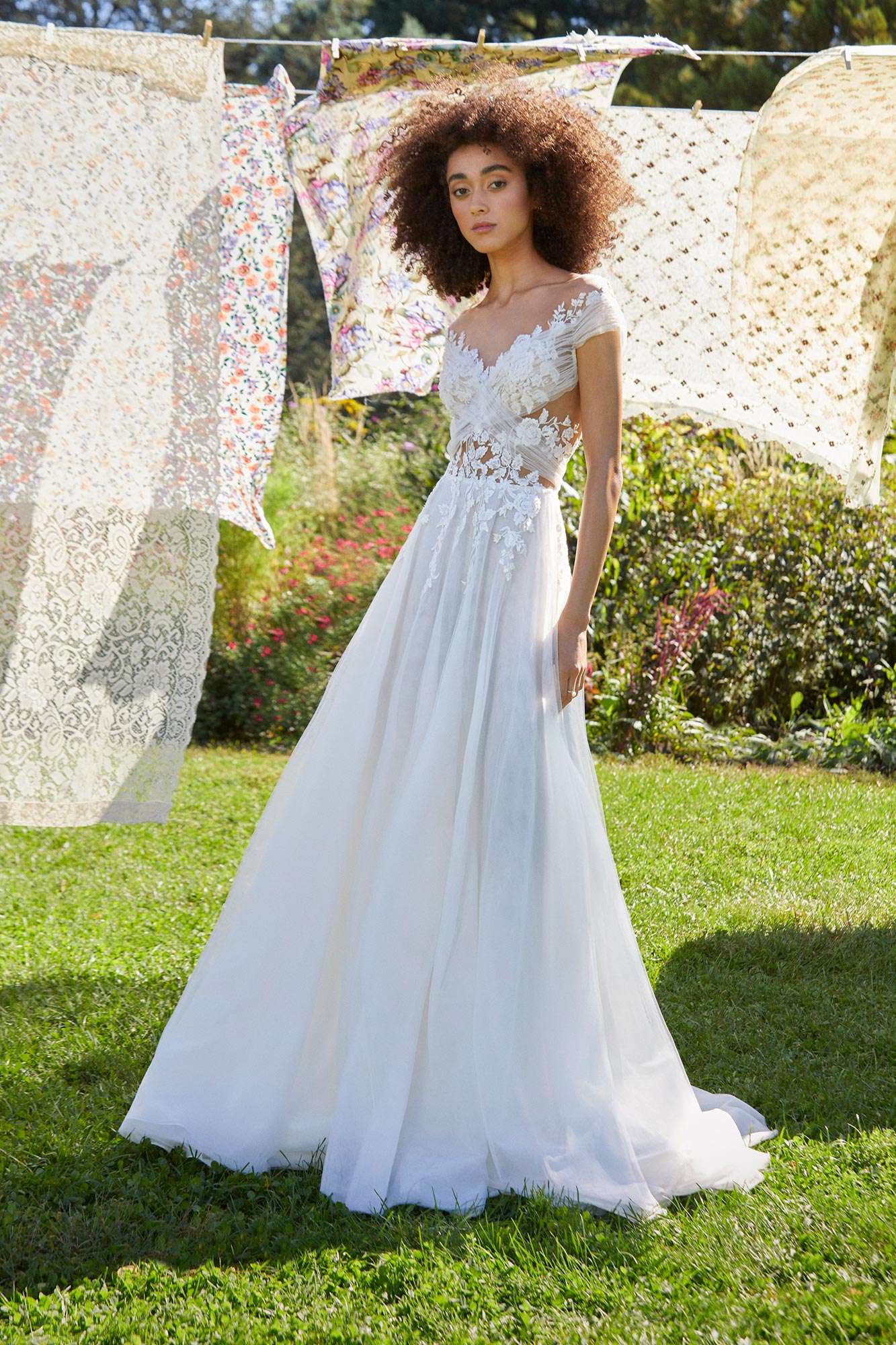Ines Di Santo created her Fall collection using childhood memories of her rich, Italian heritage. Feathery textures float on layers of ethereal tulle like the breeze on the coastal tree-line as beading glistens like sunlight reflecting on the water surface.