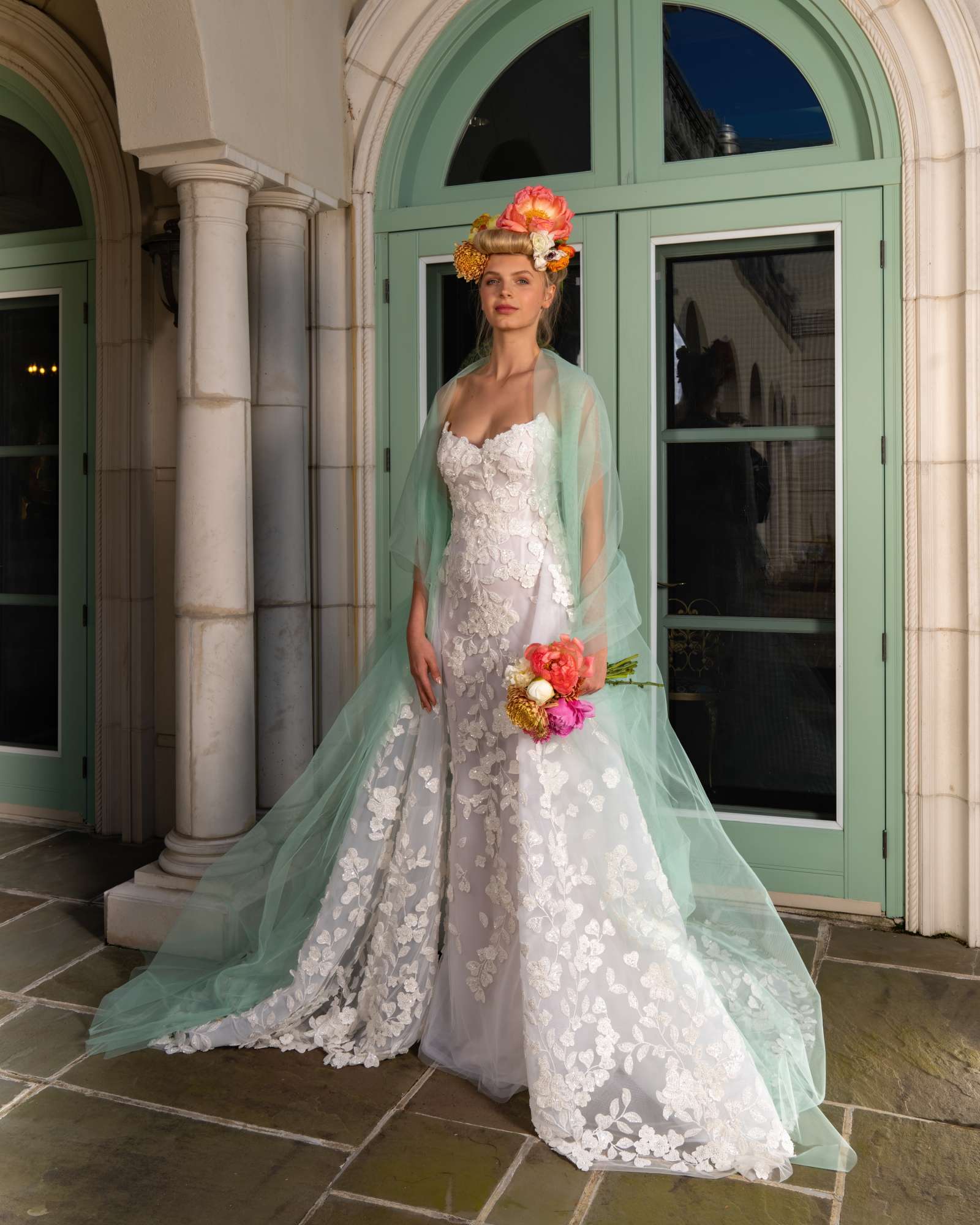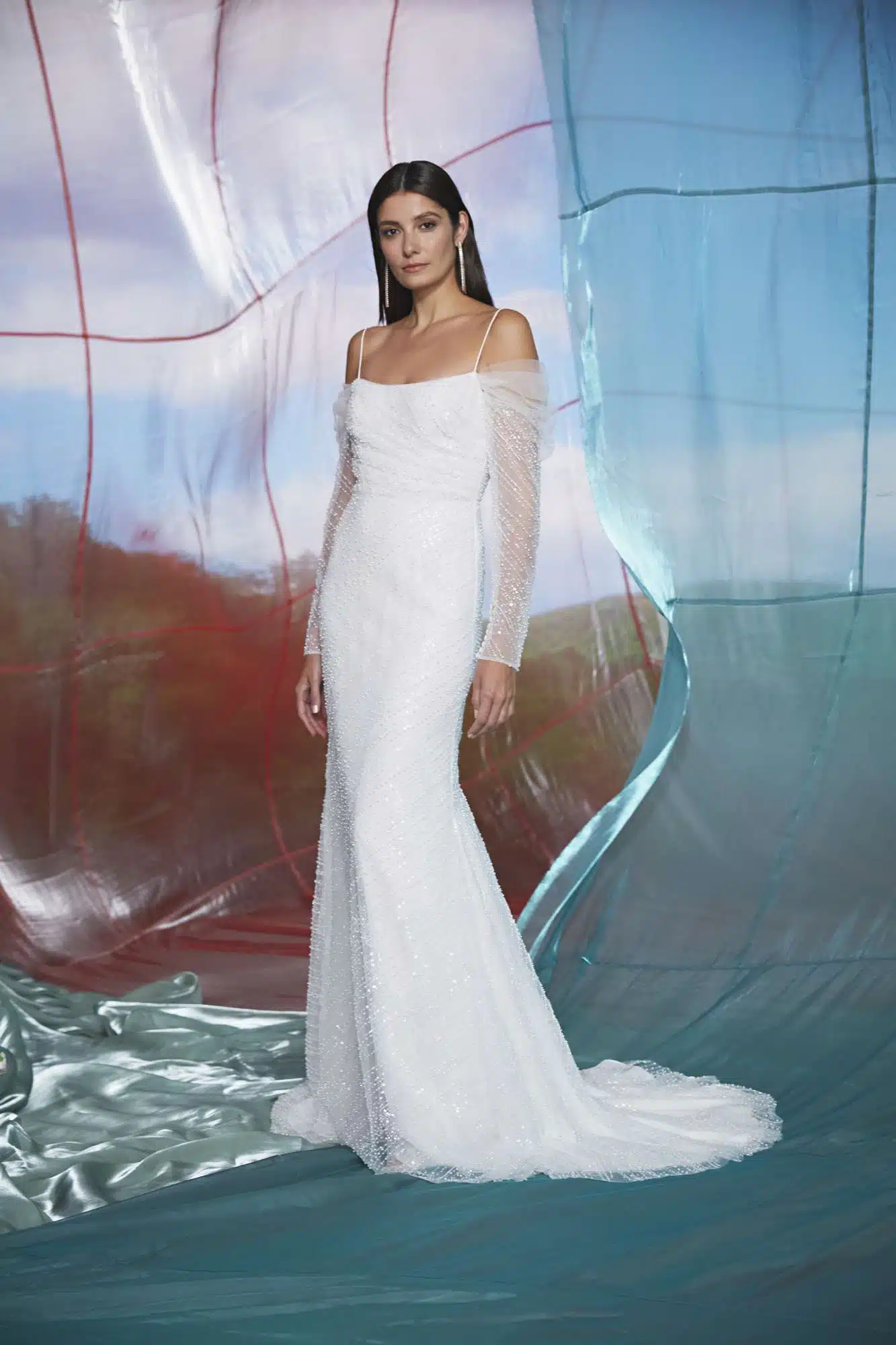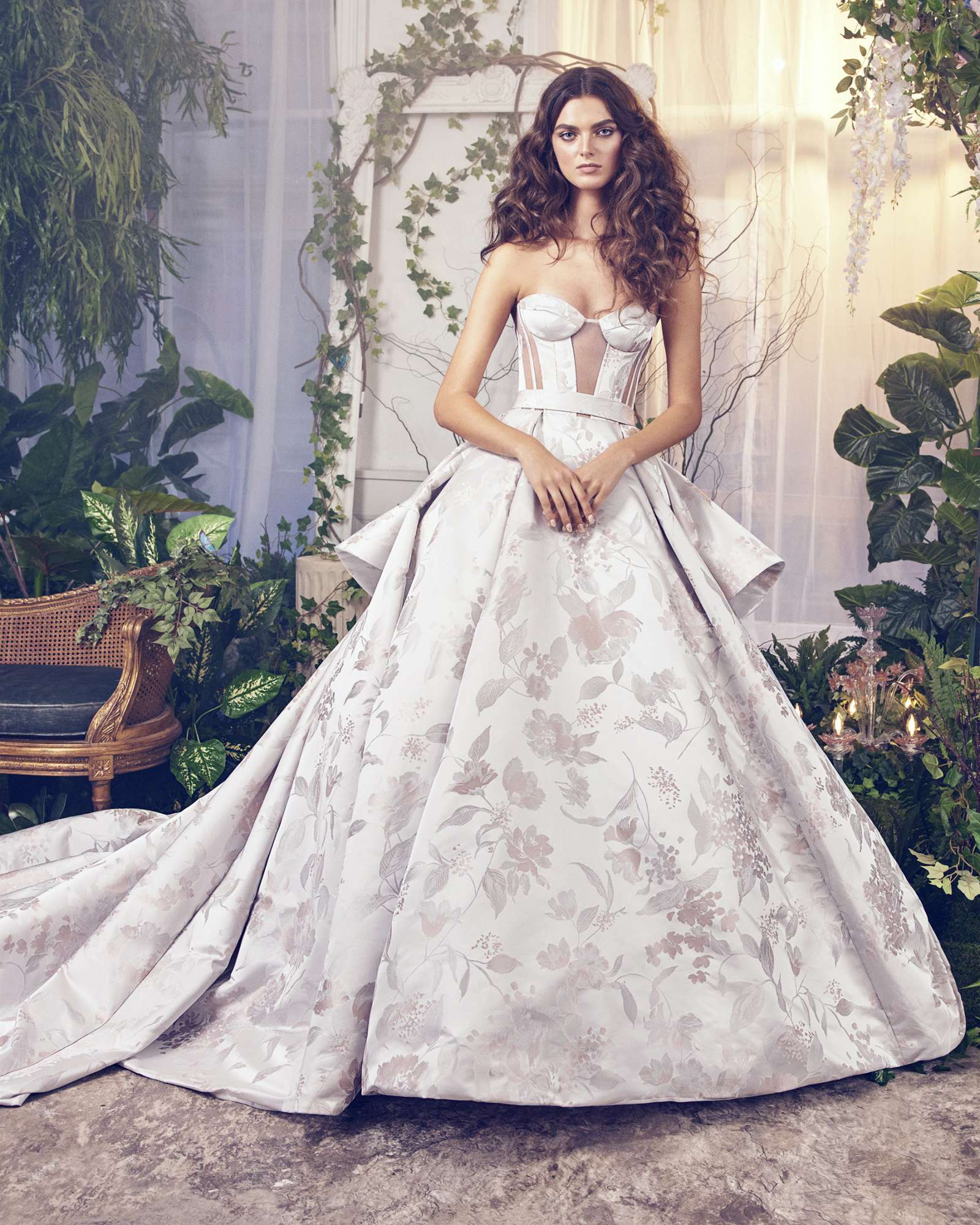 Murano Chandeliers are the centerpiece of the Ines Di Santo Bridal Collection, Illuminated Soirée. Immerse yourself in the warm glow of their light, sparkling jewel tones dancing on the ceiling like fireflies flickering in the night sky. It is a showcase of the most extravagant hand embellished details, subtly playful color choices, and unexpected textures and finishes all the while following Ines’s signature fashion, offering a study of proportion and a celebration of the feminine hourglass shape. While they combine to create a shimmering dimensional tableau, you’ll find that each gown can live as a standalone piece capable of illuminating any venue, no matter the scale, just as the chandelier that it was inspired by.