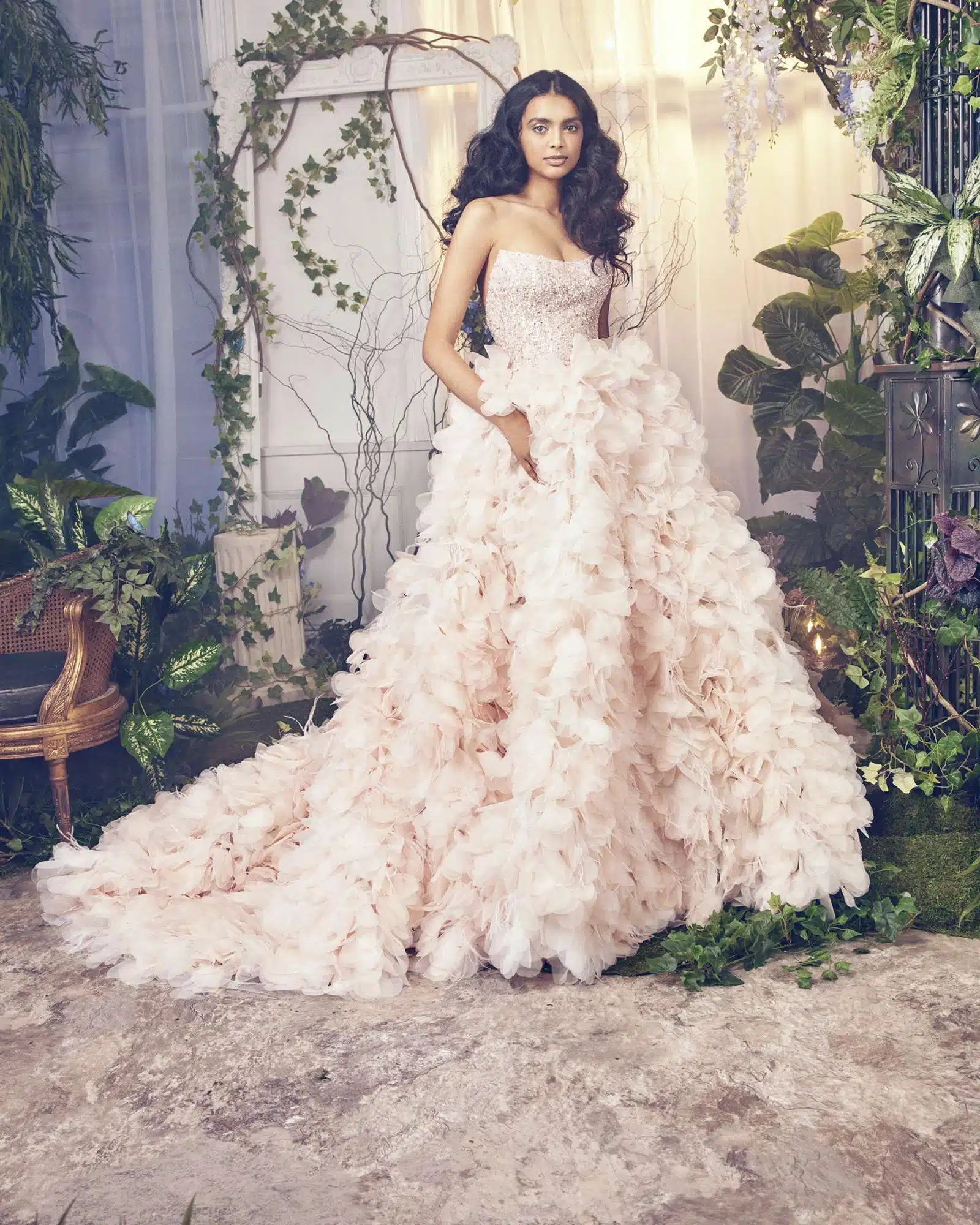 Forward-thinking and non-traditional, this season’s free spirit is evident with a fresh breadth of design. The collection nods loosely to an avian theme where voluminous appliqués and sculptural details mimic characteristics apparent in nature. Thoughtful, draped layers create dimension, while also providing a light and airy feel. Sensual cutouts for the beach, romantic ball gowns appropriate for more stately venues, and convertible accessories all coalesce with a perfectly textured mini dress, ideal for any raucous after-party. Pearlescent beading nestles on bodices while contoured tailoring, provocative plunges and a plumage of tulle radiate an exuberant vigor. Like the natural elements that inspire it, the Fall 2023 Theia Bridal Collection reflects the attitude and resiliency of the unconventional bride and boldly expands upon its modern wedding vernacular.