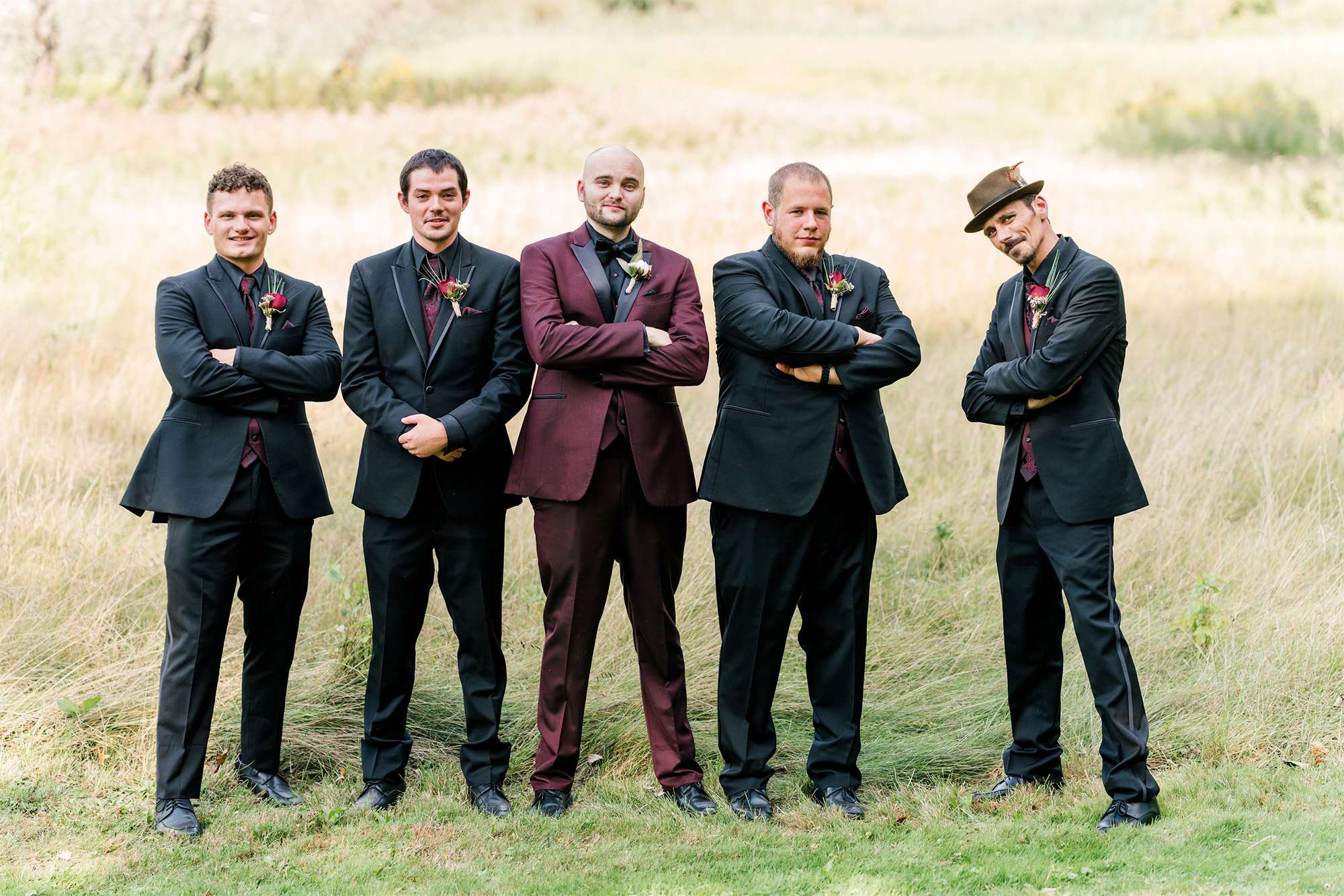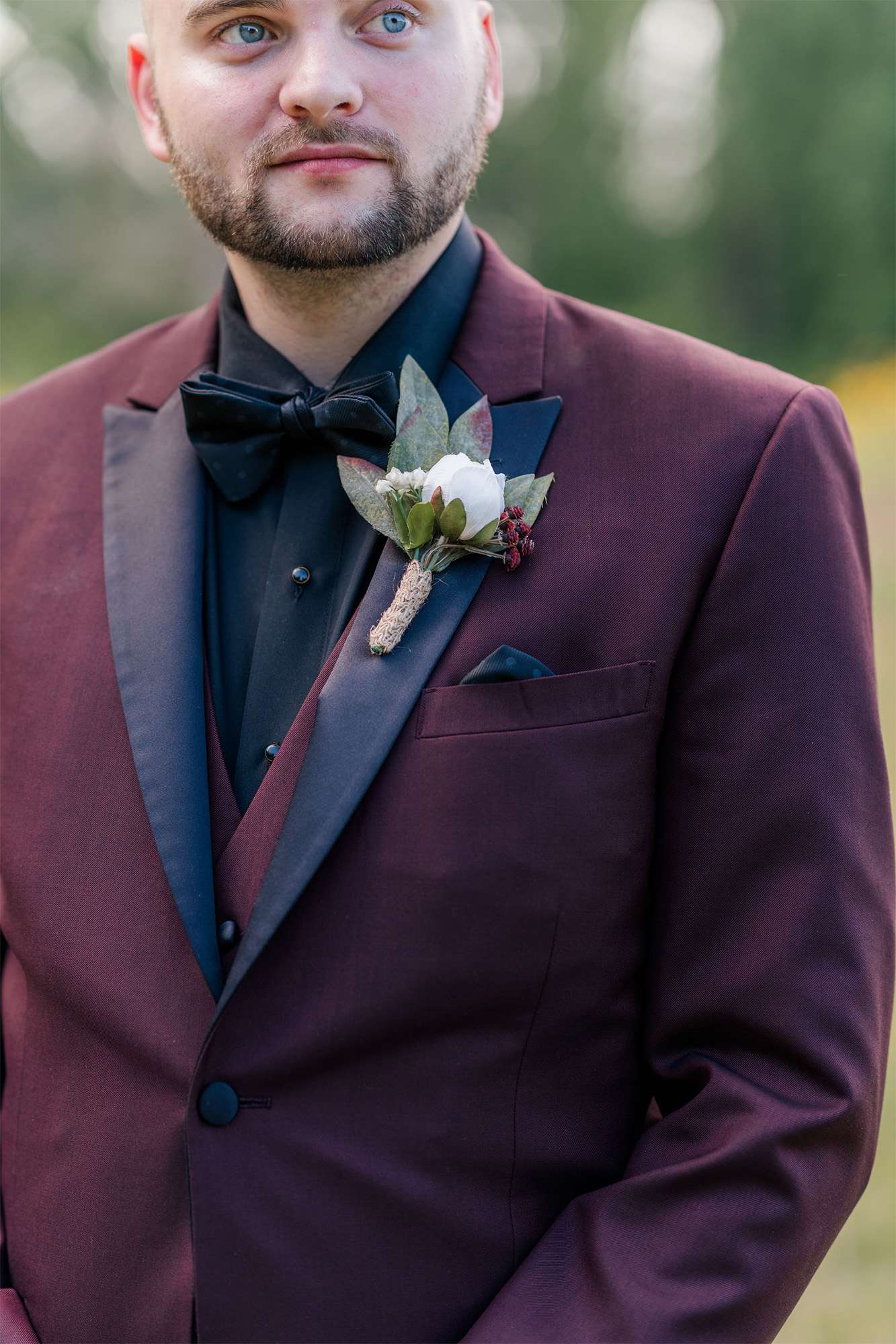 Jericho wore a burgundy Ike Behar suit with black satin lapel from Du Bois Formalwear. His groomsmen wore black suits with burgundy ties.
