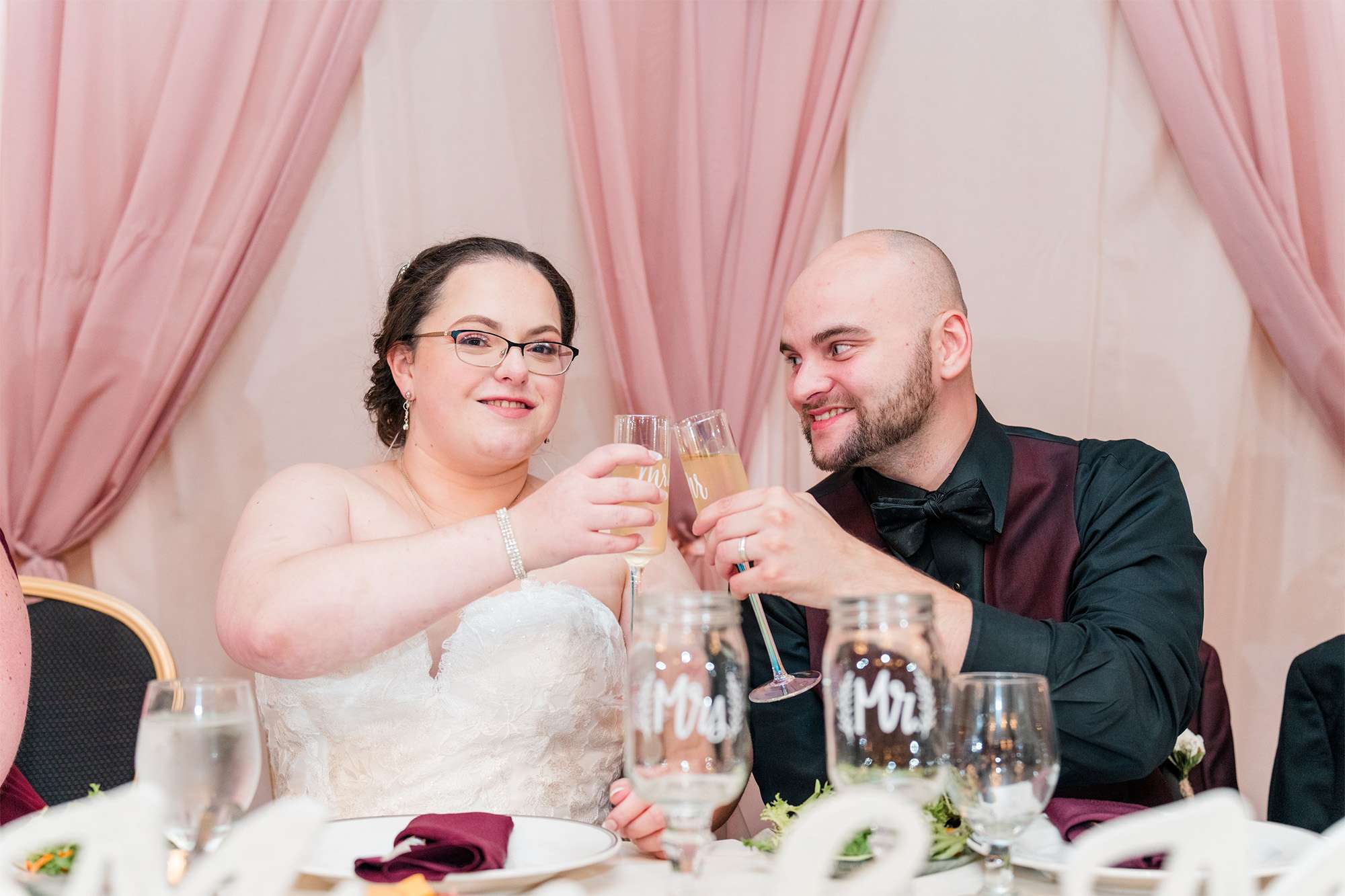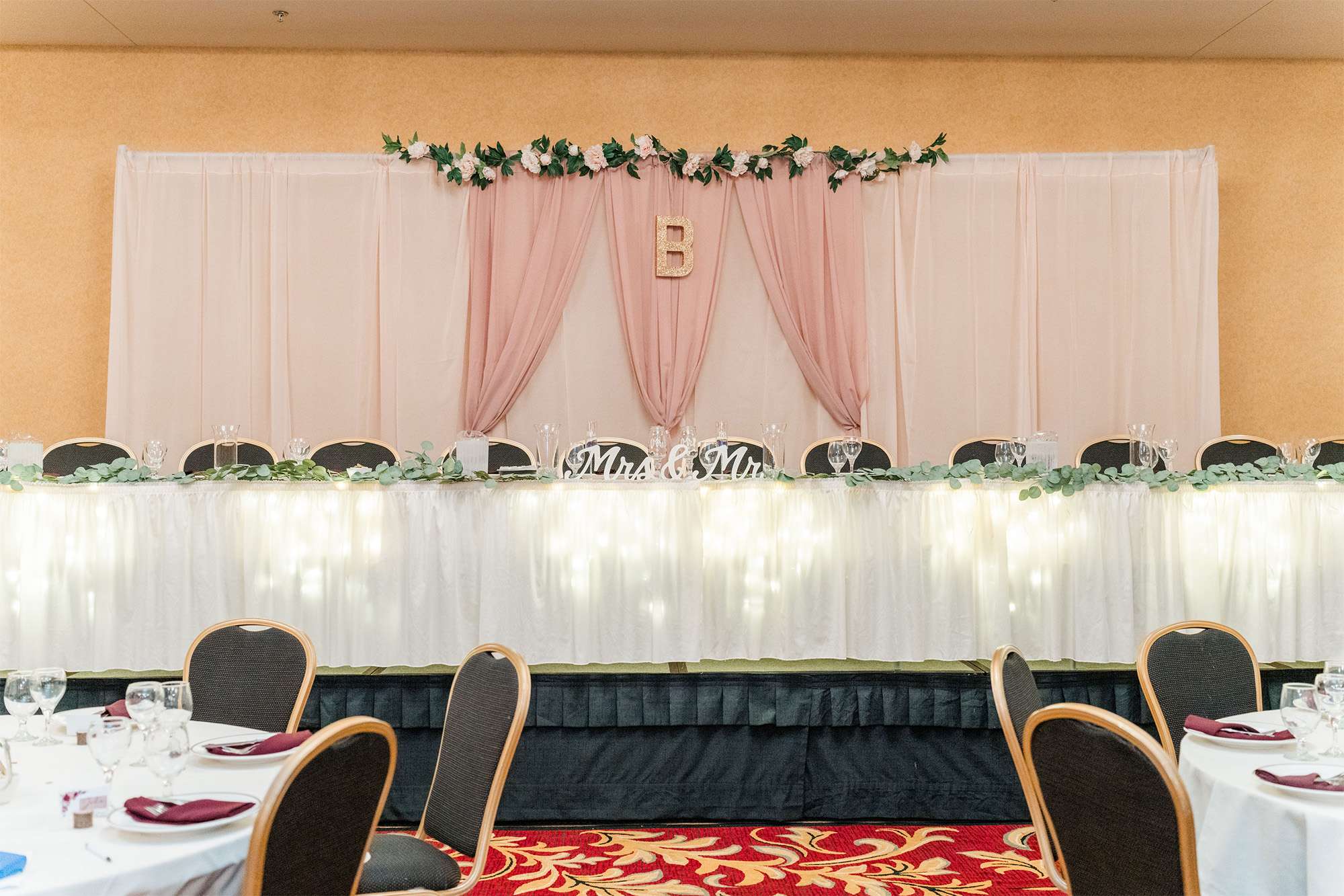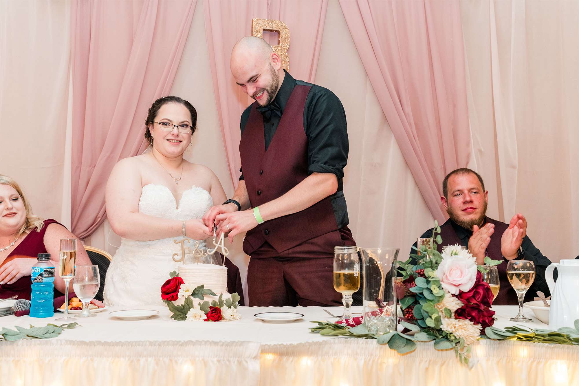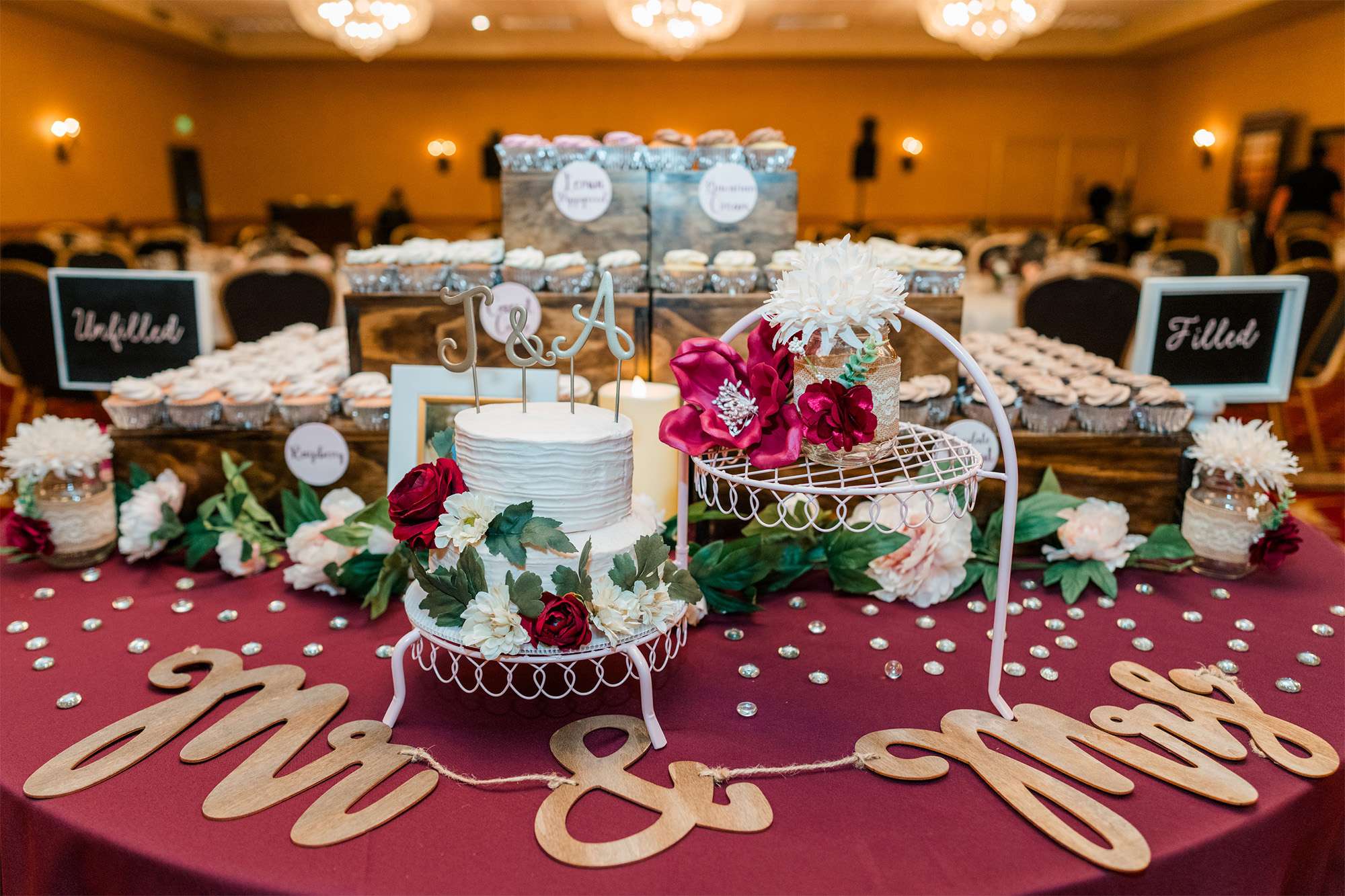 The wedding color palette consisted of stunning shades of burgundy, blush, gold, and ivory. The bride, groom, and their families crafted many of the decorations, including the personalized signage. Arianna, her mother, and her sister designed all of the floral arrangements. Jericho made all of the boutonnieres, and his sister made the bride’s bouquet and all the bridesmaids’ bouquets.