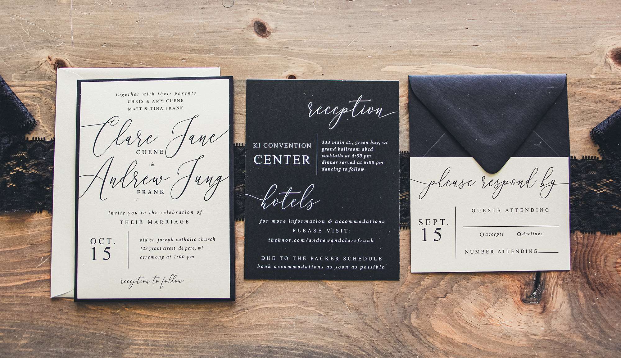 “Less is always more! Instead of trying to fill your entire invite with graphics and text, keep a good amount of free space. When your design incorporates open space, your guests will focus on the details without being overwhelmed and missing important information. If you have a lot of words to fit, break them up into multiple inserts to spread out the details. If you are looking for more ways to incorporate graphics, consider adding an envelope liner, vellum overlay, or printing double sided.”