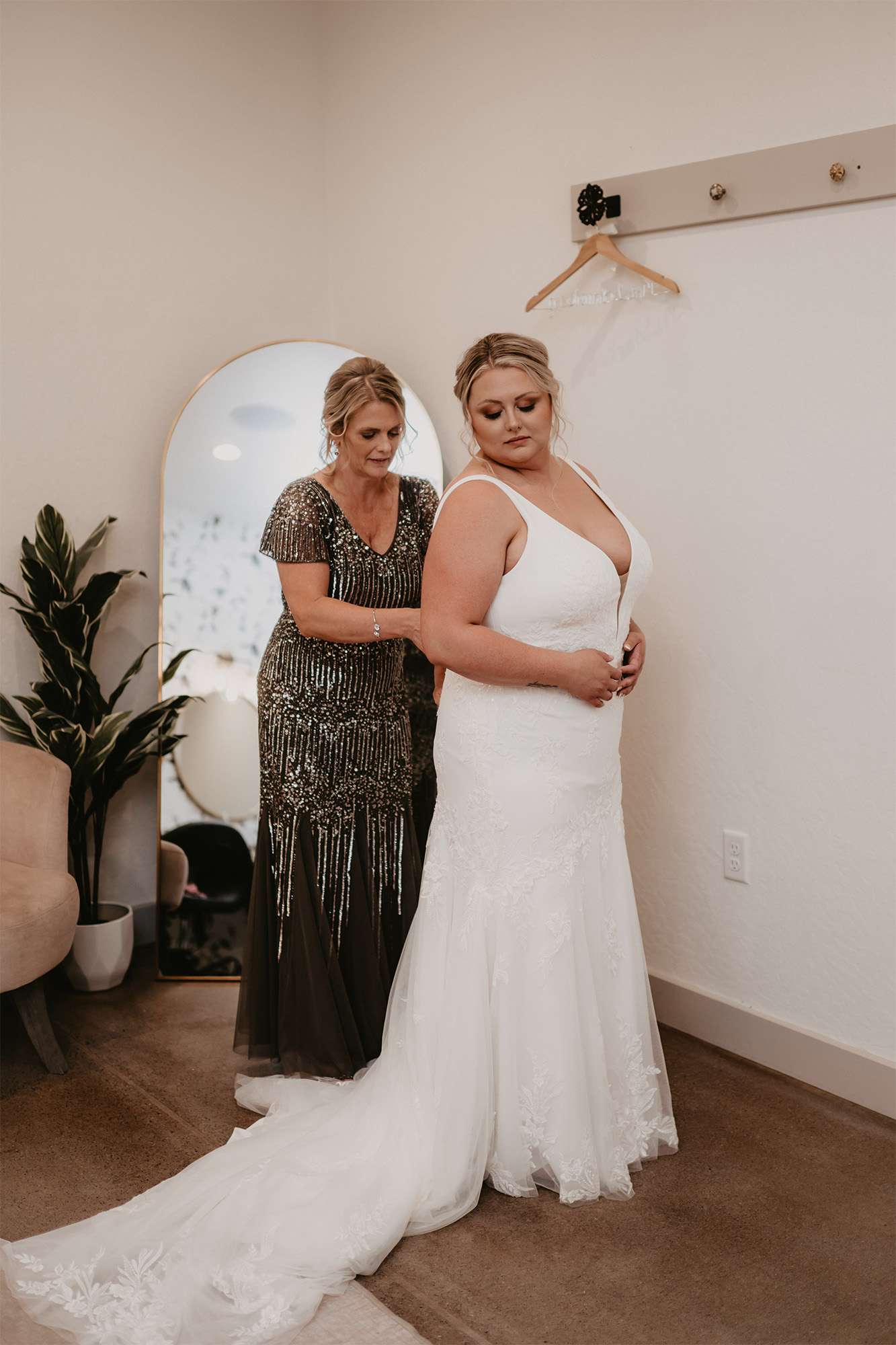 “I tried on maybe 10-15 dresses. We went to TTK (Tie The Knot) first and I was between two dresses I liked there. When I tried on ‘the dress’ that I ended up buying it was nothing that I thought I wanted! I loved it but it was too small so it was hard to picture what it would look like in the right size.” Jaden said she struggled with saying yes to the first place she went to but her dress was part of a trunk show and would only be there for one day. Nevertheless, she decided to leave and go to her second appointment of the day. But at this appointment, she just kept comparing everything to her dress. She actually cut that appointment short & called Tie The Knot back to see if they could come back in. Fortunately, they had a cancellation and Jaden was able to go back and, with the help of a different stylist, Jaden was able to envision the dress in her size and finally convince her to say “yes” to the dress.