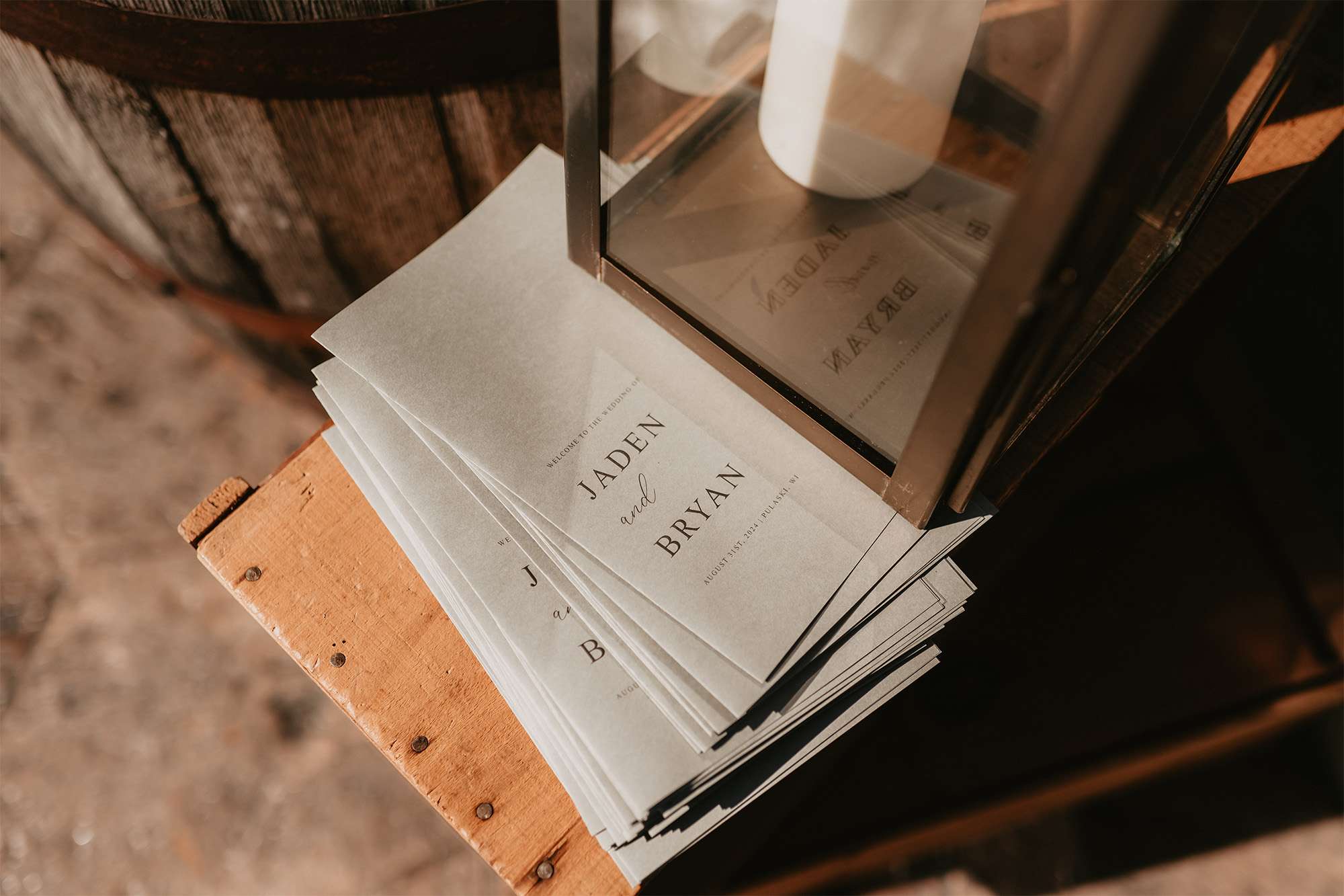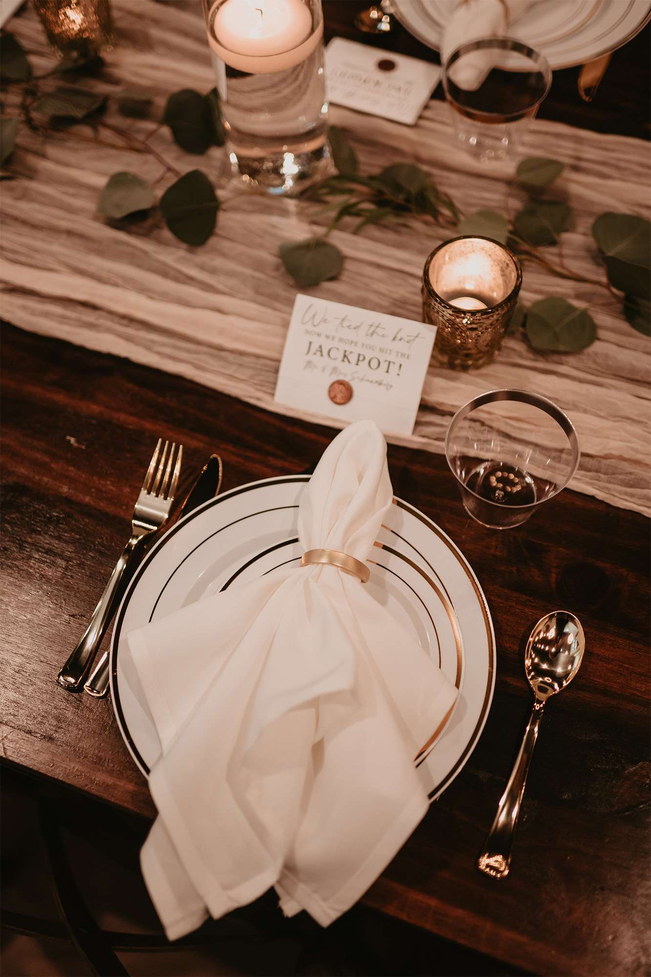 “The reception was so fun! We had AMAZING food and awesome speeches from our favorite people!” Jaden and Bryan decided to have their guests play Plinko instead of the traditional clinking of glasses to get the couple to kiss. Guests dropped their chip on the Plinko board and might land on kiss but could also “win” a selfie with the couple or have to dance back to their seat.