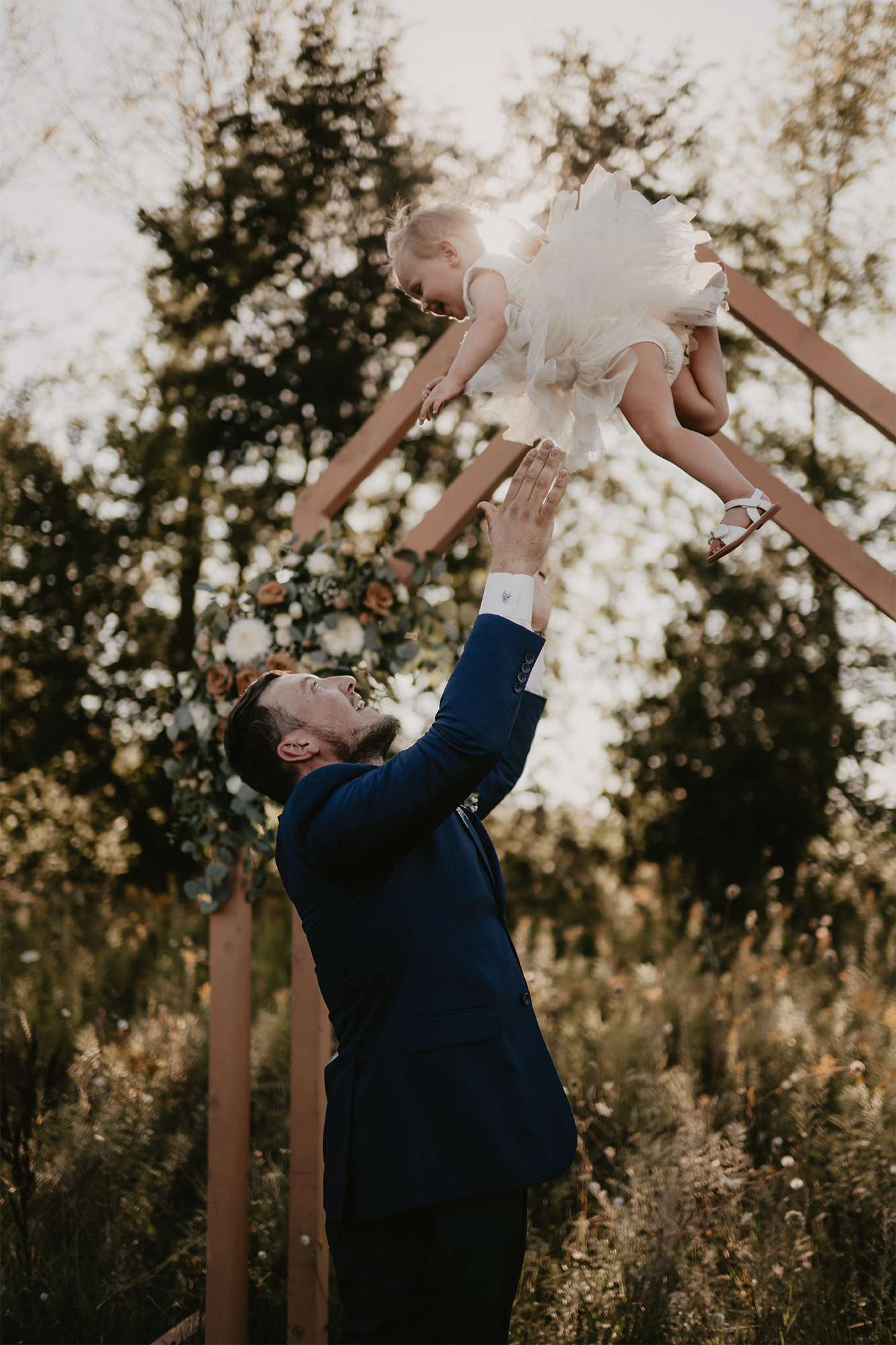 The ceremony took place outdoors at the Barn at Sunset Acres. Jaden says the best part of the ceremony was seeing her 18 month old daughter run down the aisle, by herself, to her daddy who scooped her up into a big hug. “I was peaking through the barn doors to watch her and I immediately started crying before the doors even opened! She definitely stole the show.”