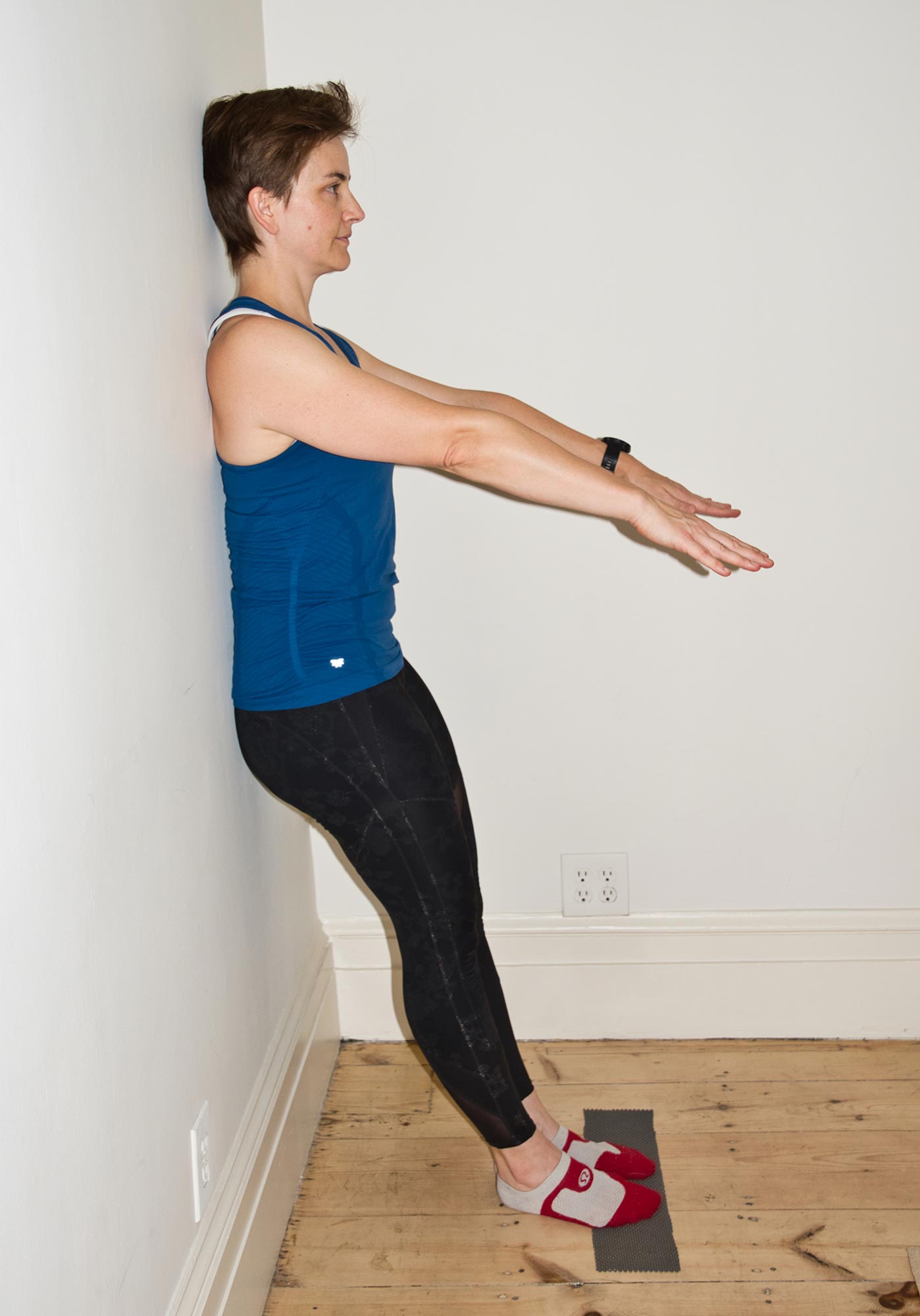 On mat or floor, rise up in to a side plank on your hand, with your feet flexed and stacked (modification: one foot in front of the other and/or be on your forearm.). Line up the back of your head with the arches of your feet. Imagine you have to keep your whole back body pressed in to a wall behind you (modification, do this with a wall behind you) and keep your shoulder blade well hugged on to your back. Stay up for five to eight breaths, rest for three breaths, three times on each side. Challenge level: lower hips to floor and back up three to five times.