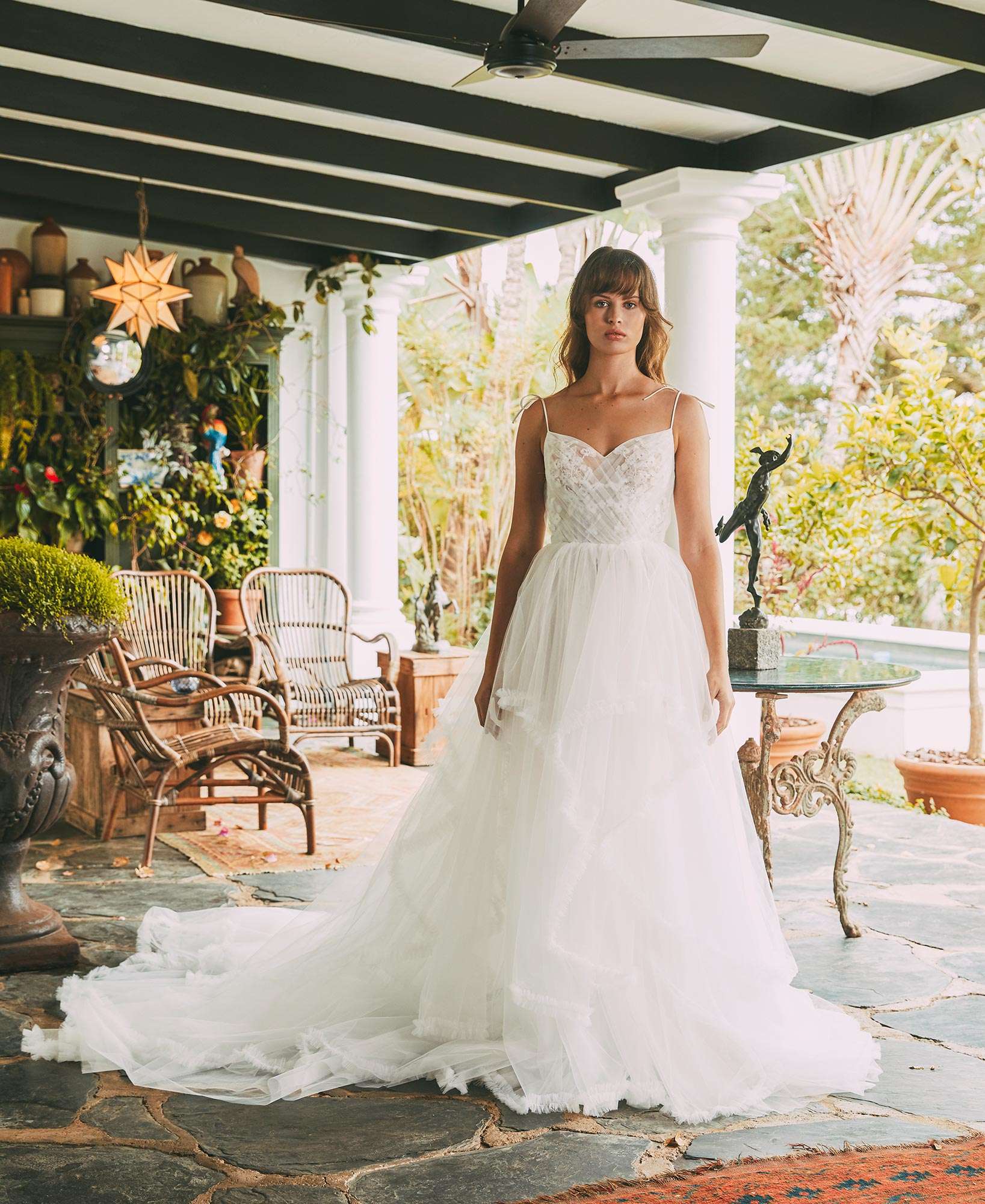 Anna Georgina’s Romance Collection materializes from a captivating fantasy in a dramatic lineup of heirloom bridal gowns set in a lush, South African Colonial garden. Signature silhouettes are embellished with decadent embroideries in luxurious fabrics in a palette of soft Blush and Ivory. Dotted jacquard, silk tulle, and chantilly laces transform classic silhouettes, creating an air of royalty, while draped Tulle adds an element of whimsey. Dramatic Feather capes, big straw hats, and hand-beaded bodices with wide-legged satin pants give versatility to the modern bride. Soft layers of tulle and embellished appliqués create depth and dimension.