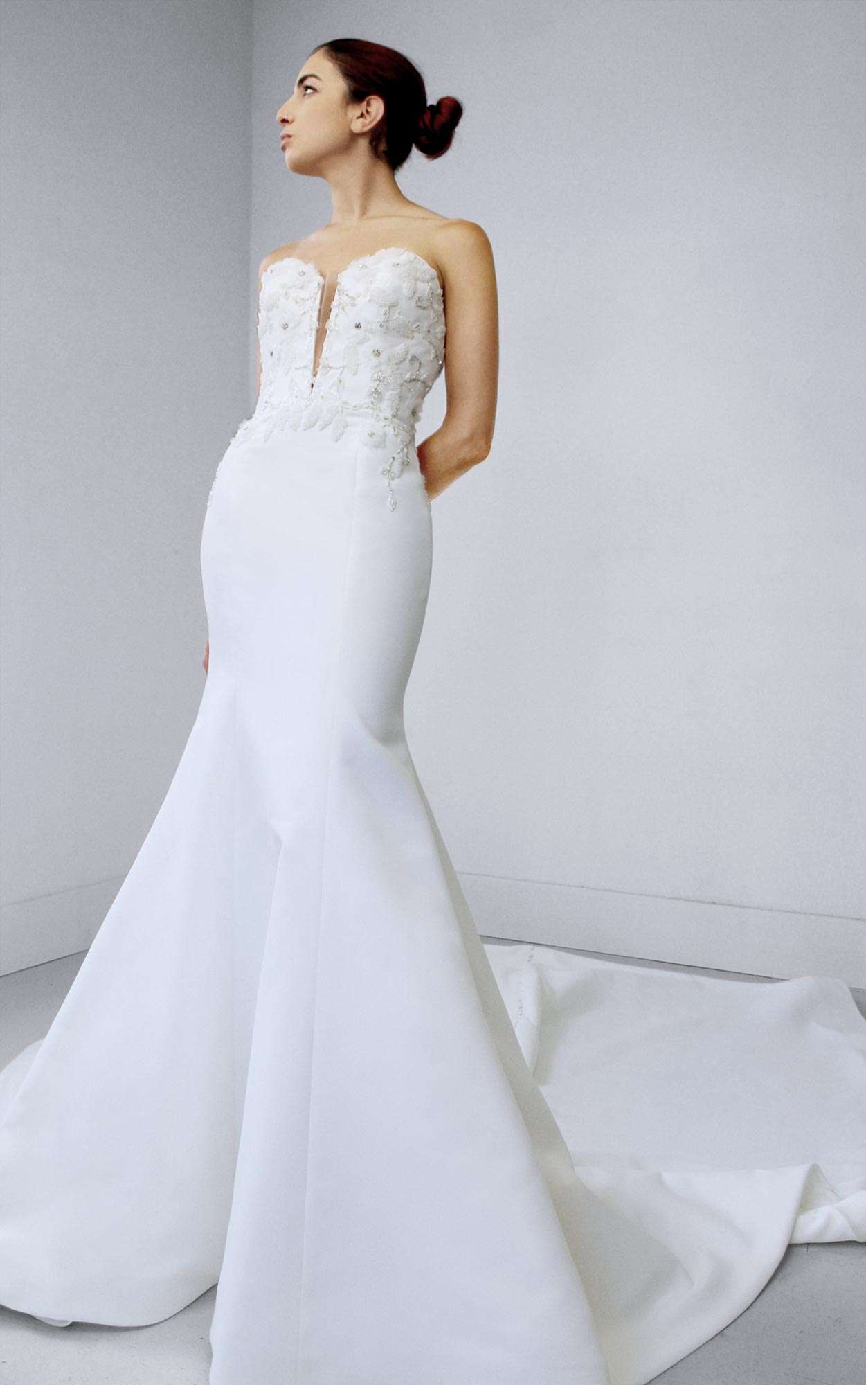 Driven by sophisticated simplification, the Jolie Bridal Venice Collection combines superb artisan work and pure edginess. The collection features sheer gowns, ruffled sleeves and empire waists designed exclusively for the bride who has impeccable taste and likes to stay up on the trends. Lace accents, as well as shimmering details, bring unique touches. Necklines show skin, either featuring a plunging v-shape or strapless design.