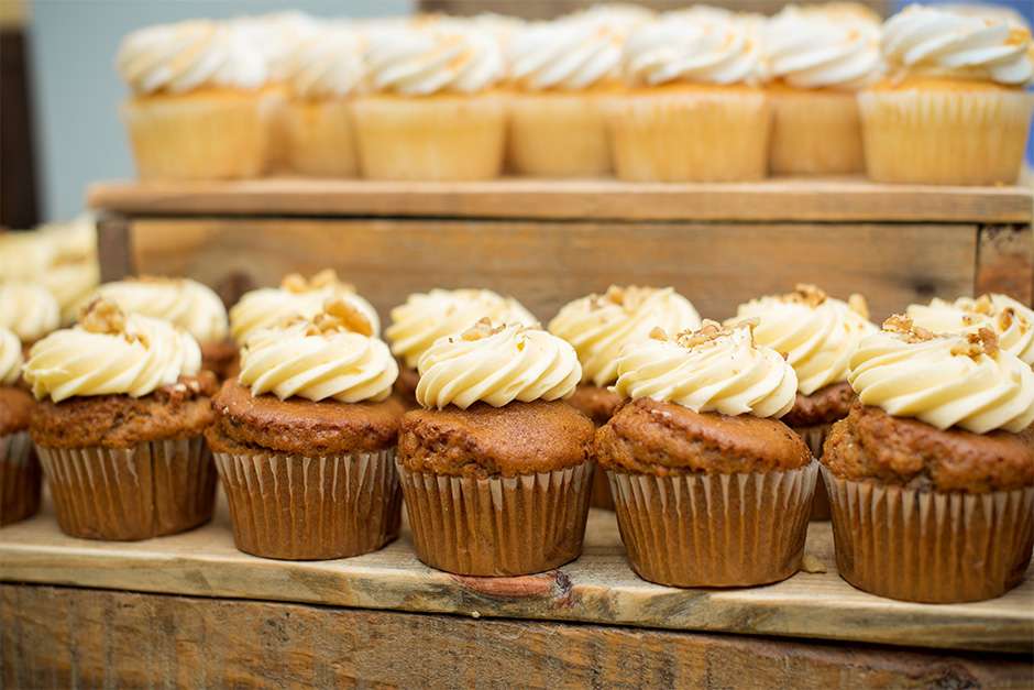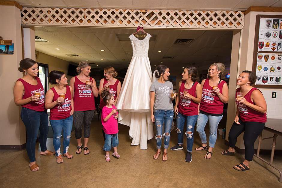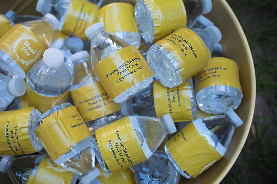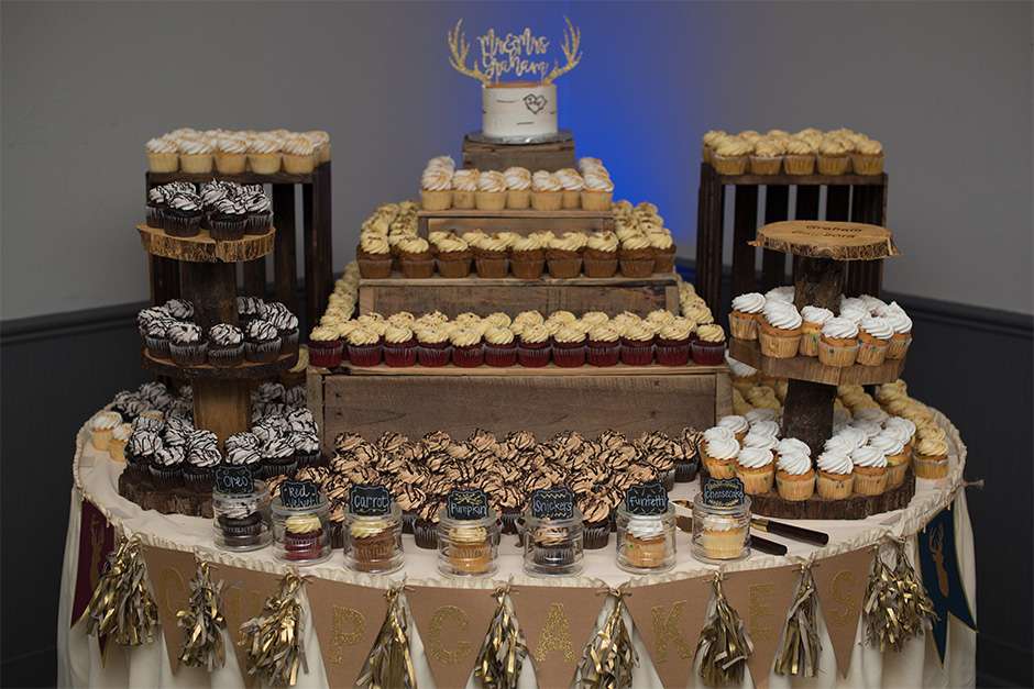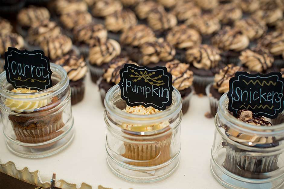 Traci and Joel placed a lot of importance on keeping their guests happy throughout the day. “It was all about having our guests and wedding party be well-fed and enjoy celebratory drinks!” There were bagels and mimosas for the getting-ready breakfast, sandwiches and chips on the party bus, and appetizers and signature drinks at the pre-cocktail pub party. “At the reception during cocktail hour, catered by Stadium View, we had an open bar and appetizers for our guests. Our dinner was family-style with broasted chicken, beef tips, mashed potatoes, gravy, coleslaw, and buns.” Dessert was a spread of seven flavors of cupcakes, and at 10pm, Joel and Traci treated their guests to pizza as a late-night snack.