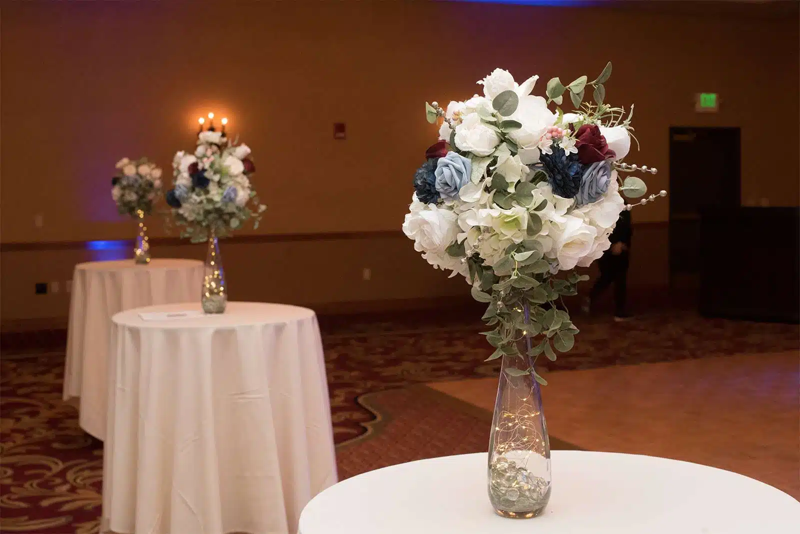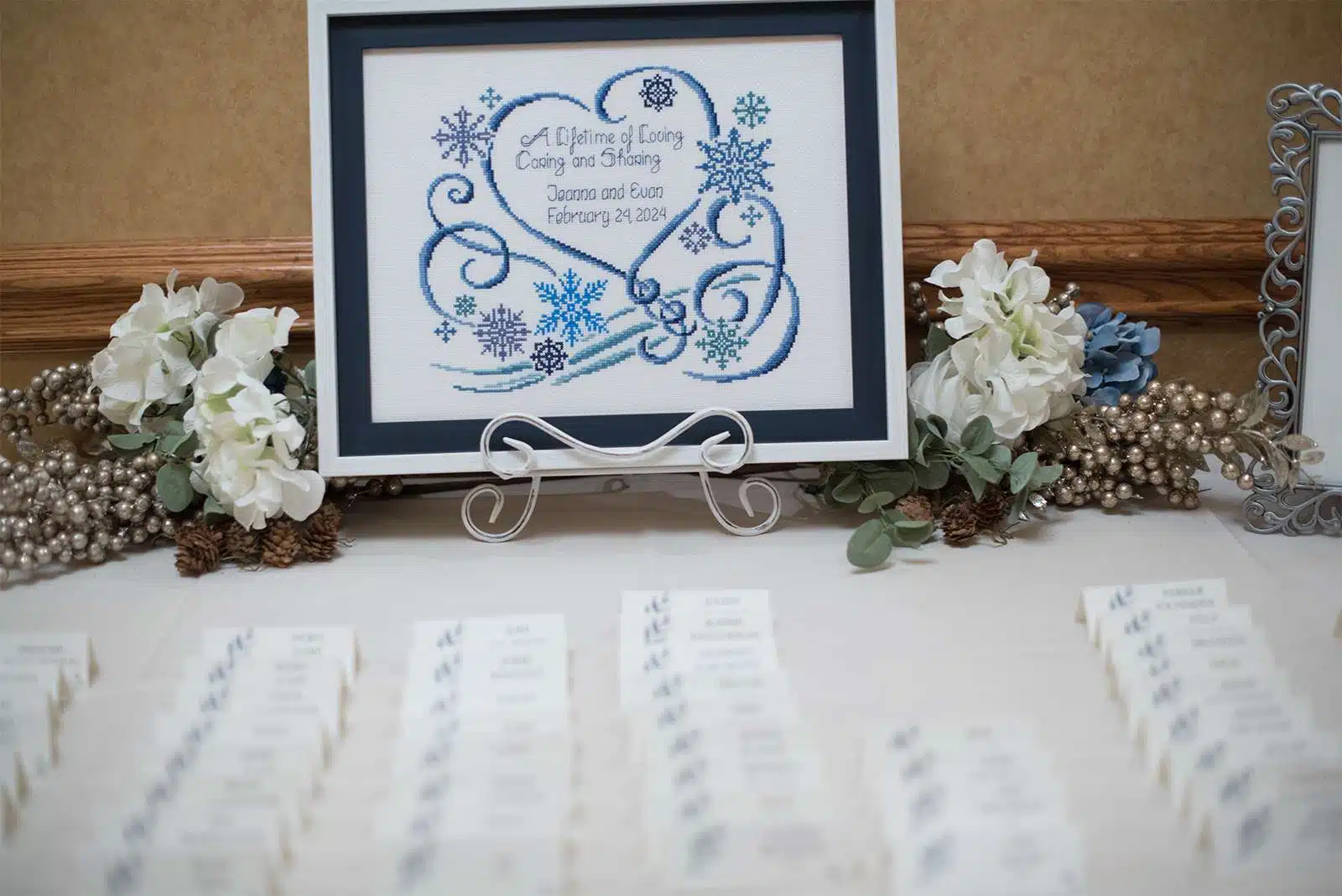 The sophisticated color palette of Jeanna and Evan’s wedding included navy blue and emerald green. Embracing a theme of quiet elegance, the wedding featured silk flowers sourced from Facebook Marketplace. The bouquets from Ling’s Moment were carefully chosen to reflect the couple’s personalities and style. The décor was beautiful and meaningful, with tributes to Jeanna’s mother prominently displayed, a touching reminder of her presence.