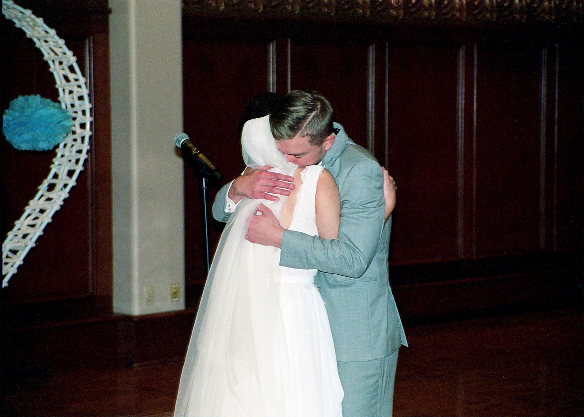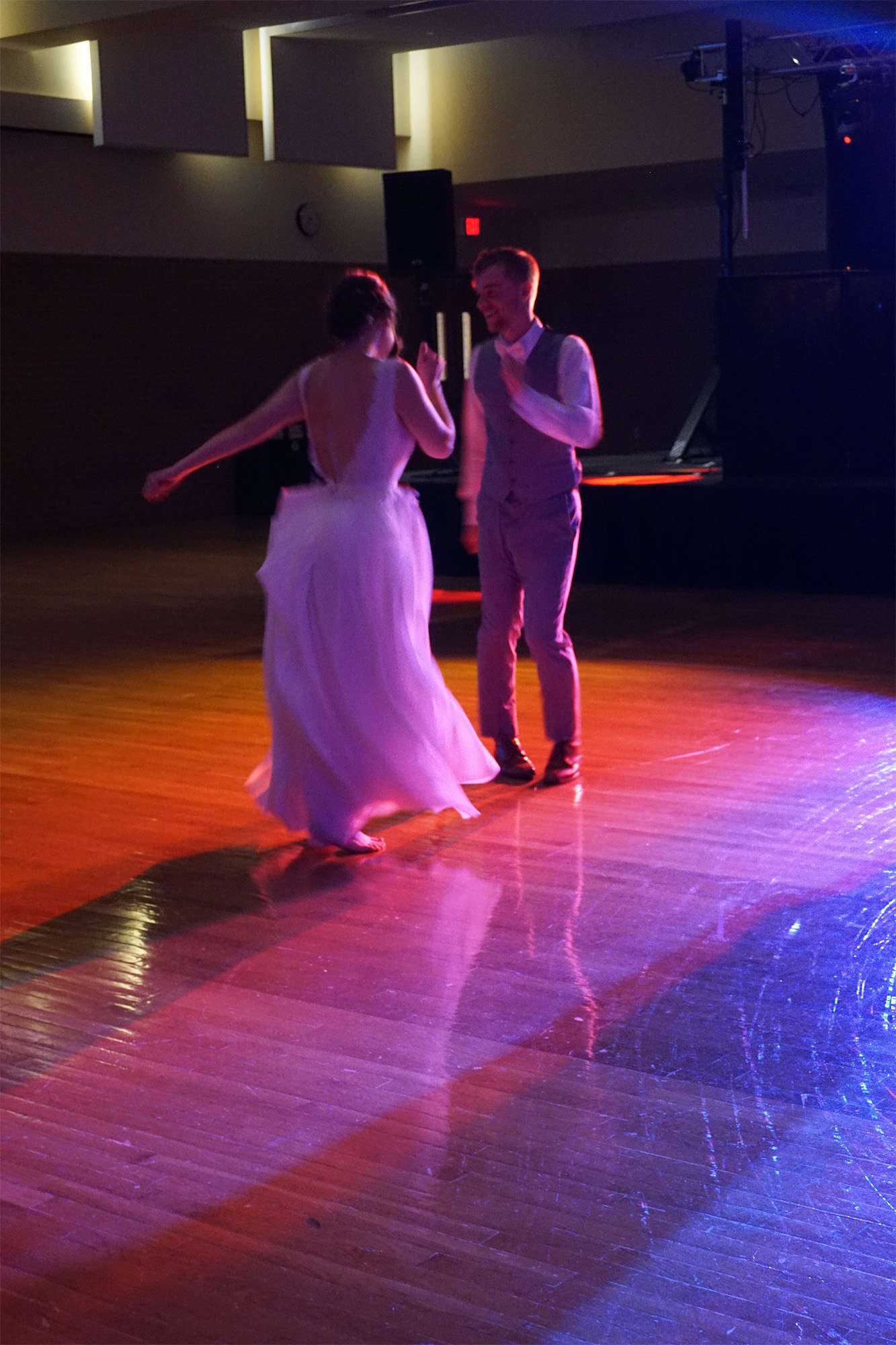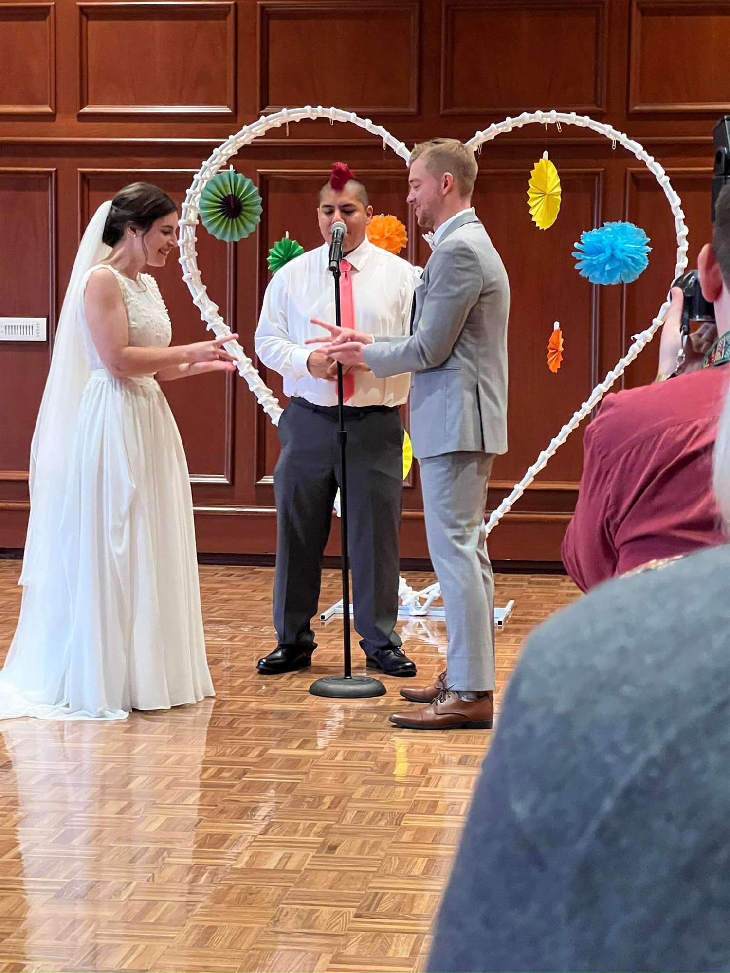 Briah and Matt got married at their alma mater, UW–Stevens Point. Their close friend Ben served as the officiant, and another friend Sam was their photographer. In lieu of walking down the aisle to a traditional song, “Honeybody” by Kishi Bashi played over the speakers. The bridesmaids and groomsmen grooved down the aisle one by one, and the mothers of the bride and groom were the “flower girls” with bubble wands.