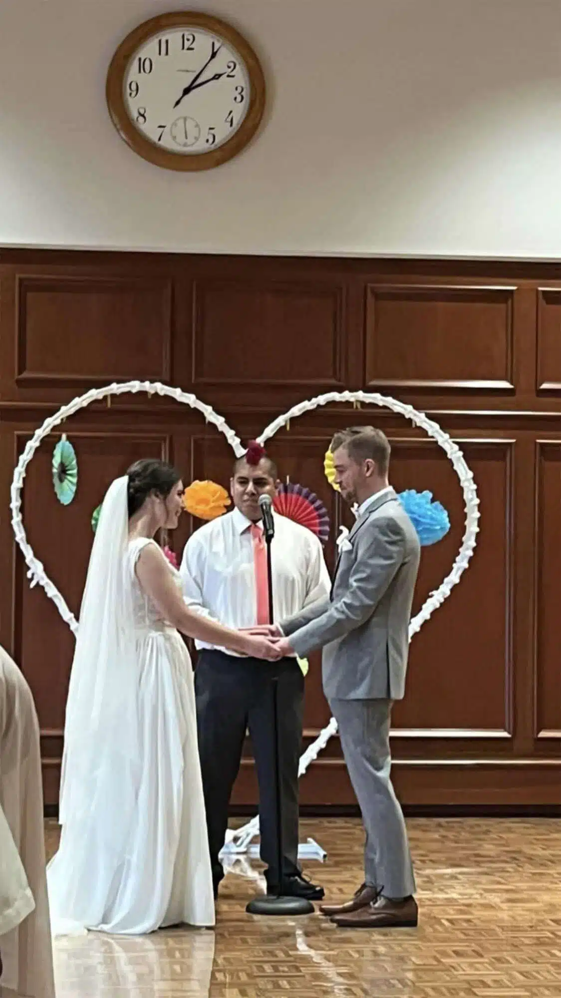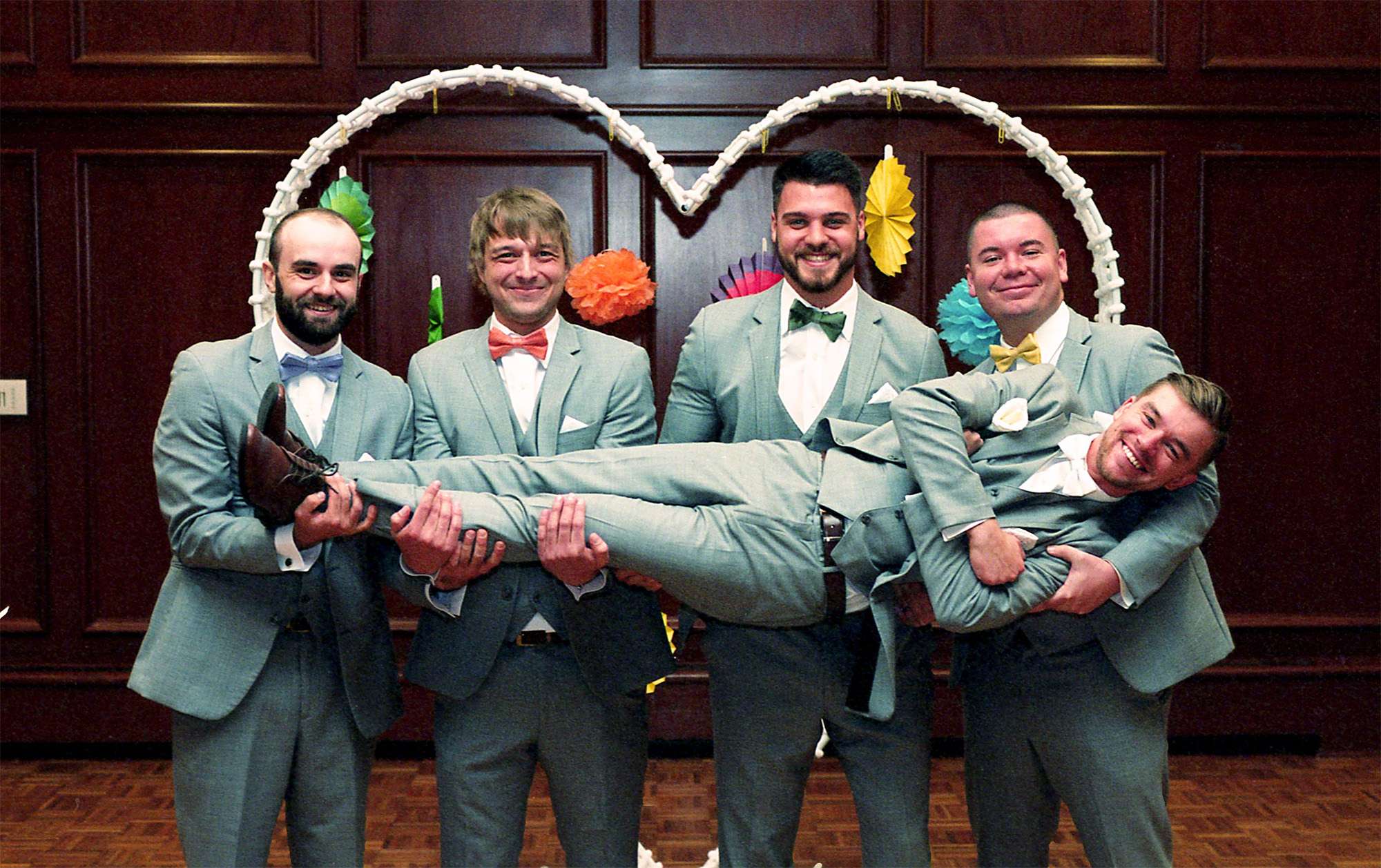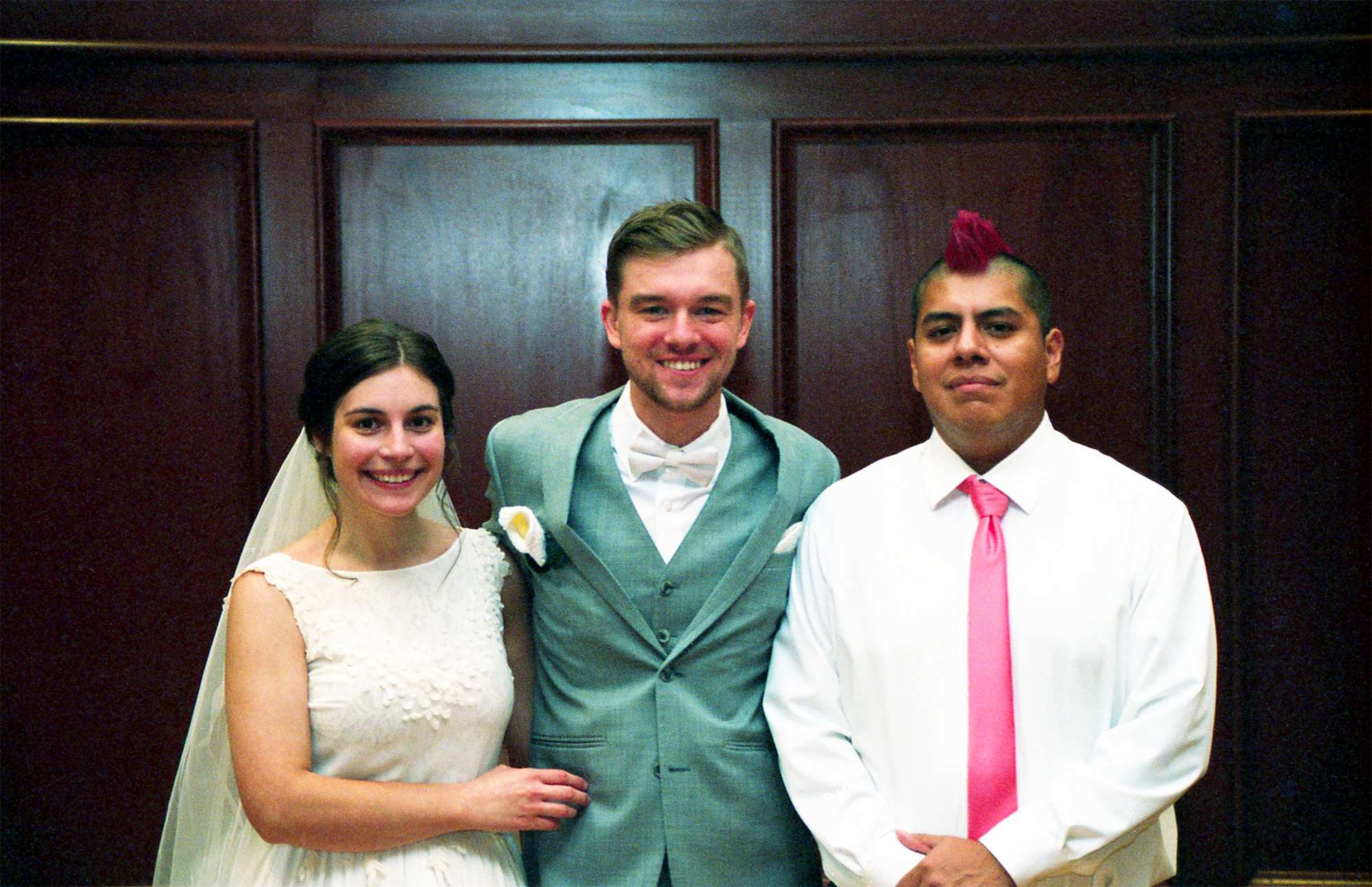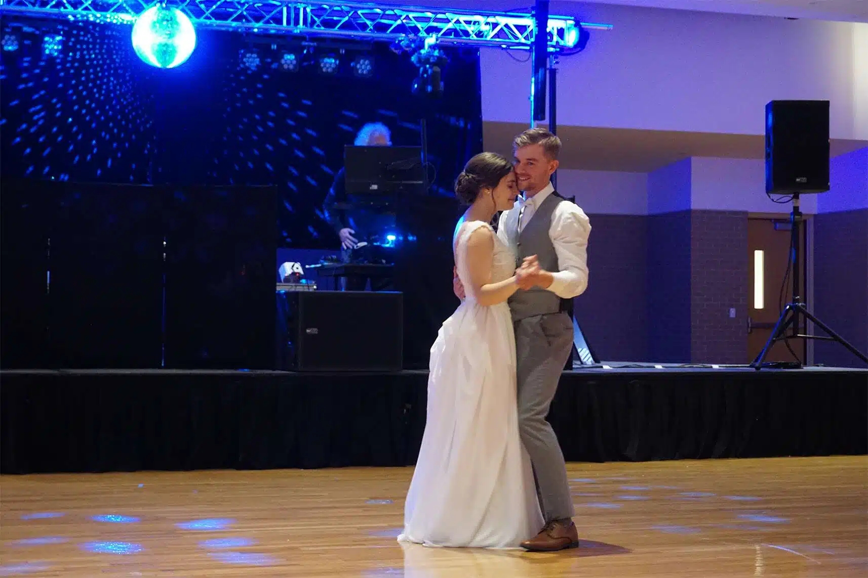 Briah and Matt got married at their alma mater, UW–Stevens Point. Their close friend Ben served as the officiant, and another friend Sam was their photographer. In lieu of walking down the aisle to a traditional song, “Honeybody” by Kishi Bashi played over the speakers. The bridesmaids and groomsmen grooved down the aisle one by one, and the mothers of the bride and groom were the “flower girls” with bubble wands.