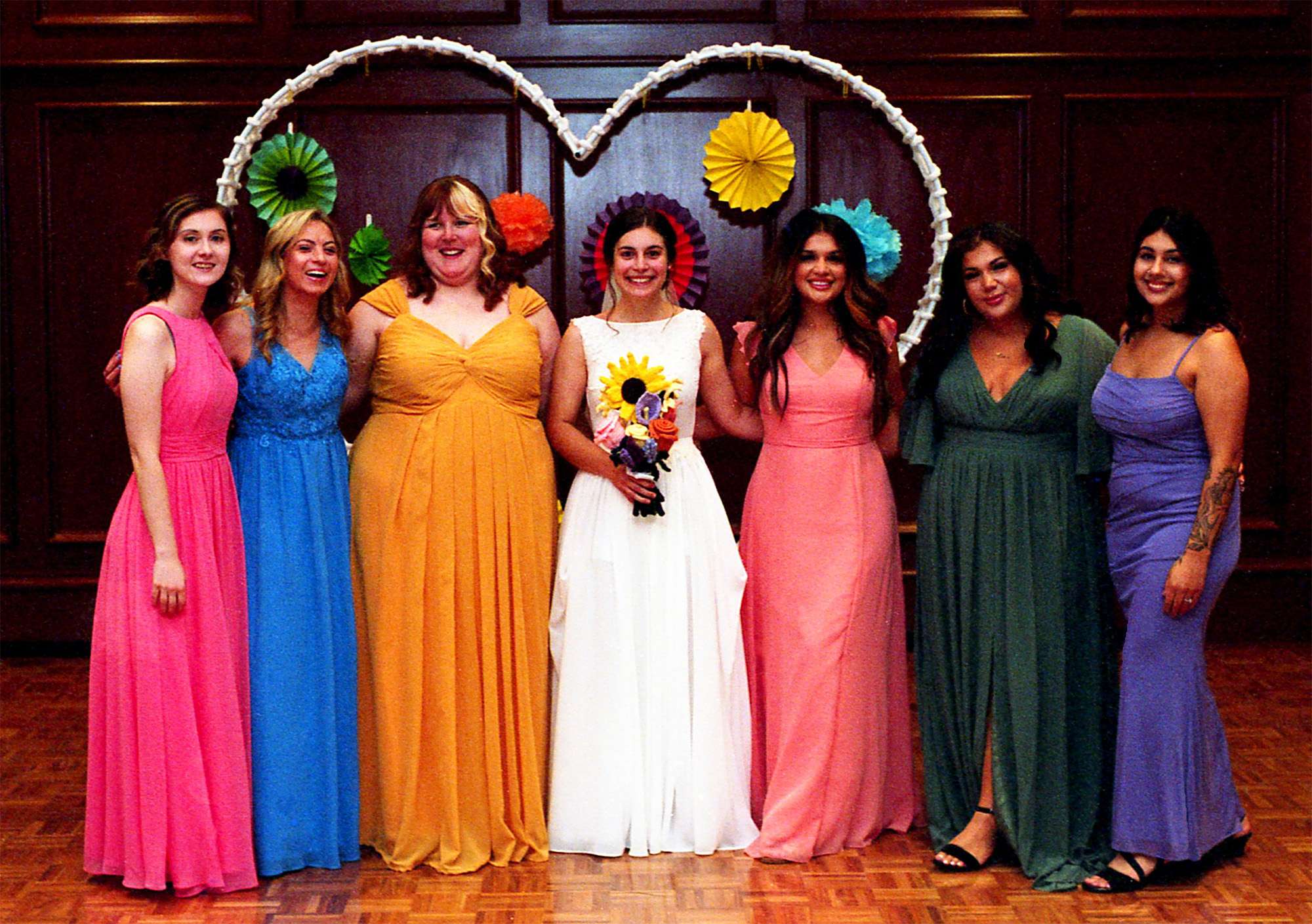 Briah found her dream wedding dress at I Do Too Consignment and Discount Bridal ( now closed) in Stevens Point. “I’m a thrifty girl at heart, and when I heard that my town had a secondhand wedding dress store, I was all in!” Her bridesmaids, sister (and maid of honor) Sierra, mom, mother-in-law, aunt, and grandma accompanied her as she found the perfect gown. “When I had it on, it felt like it represented my personality and my own aesthetic. It was timeless and classic, but it held character and detail.” The bridal party wore all the colors of the rainbow.