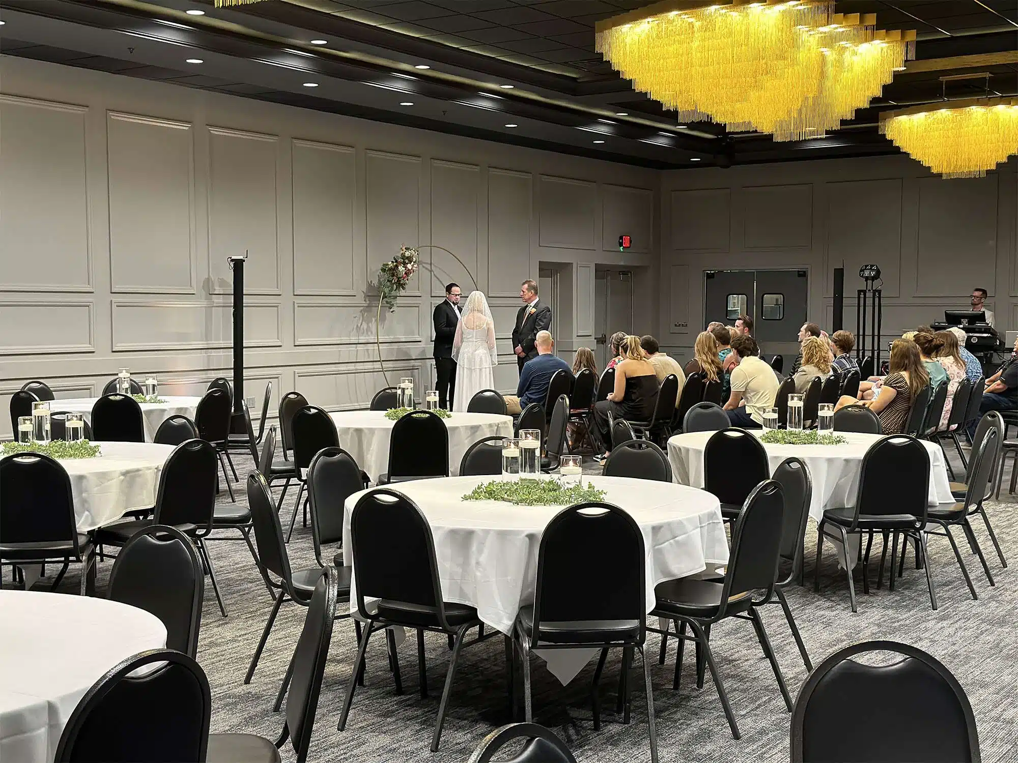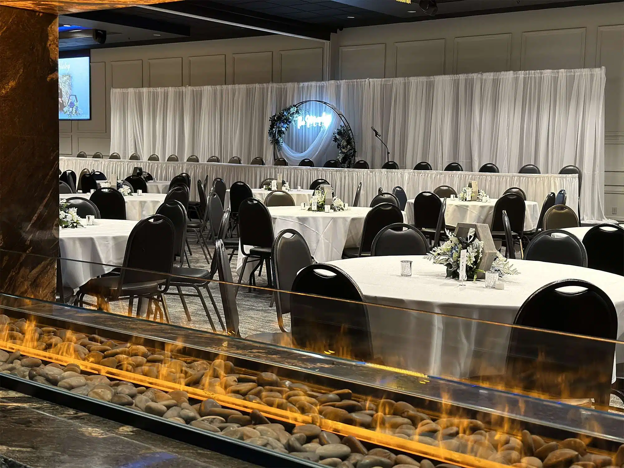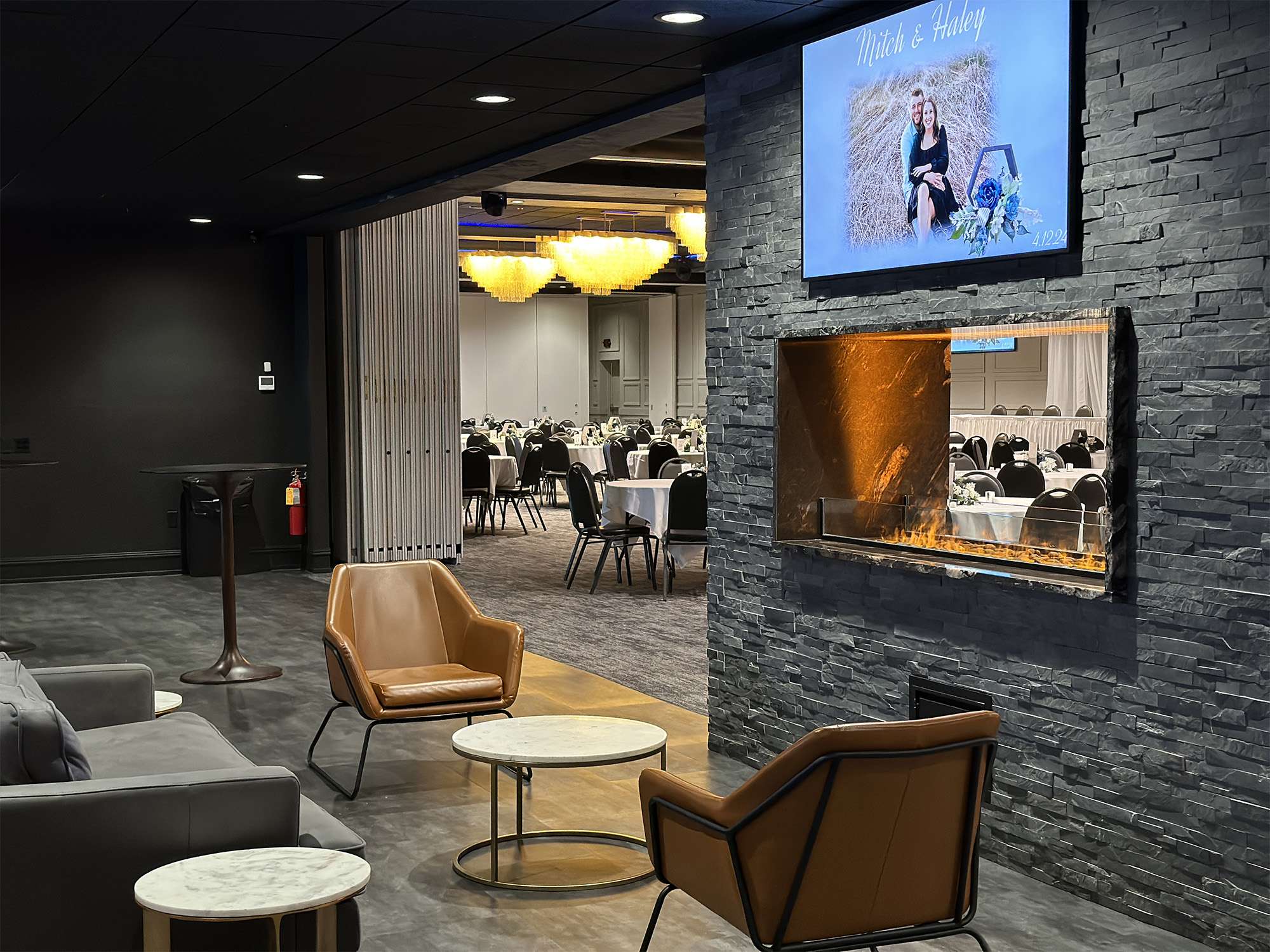 Enjoy two full-service bars, fireplace features, customizable lighting, private restrooms, chandeliers, and projector screens that can be used to feature special photos & videos on your special day.