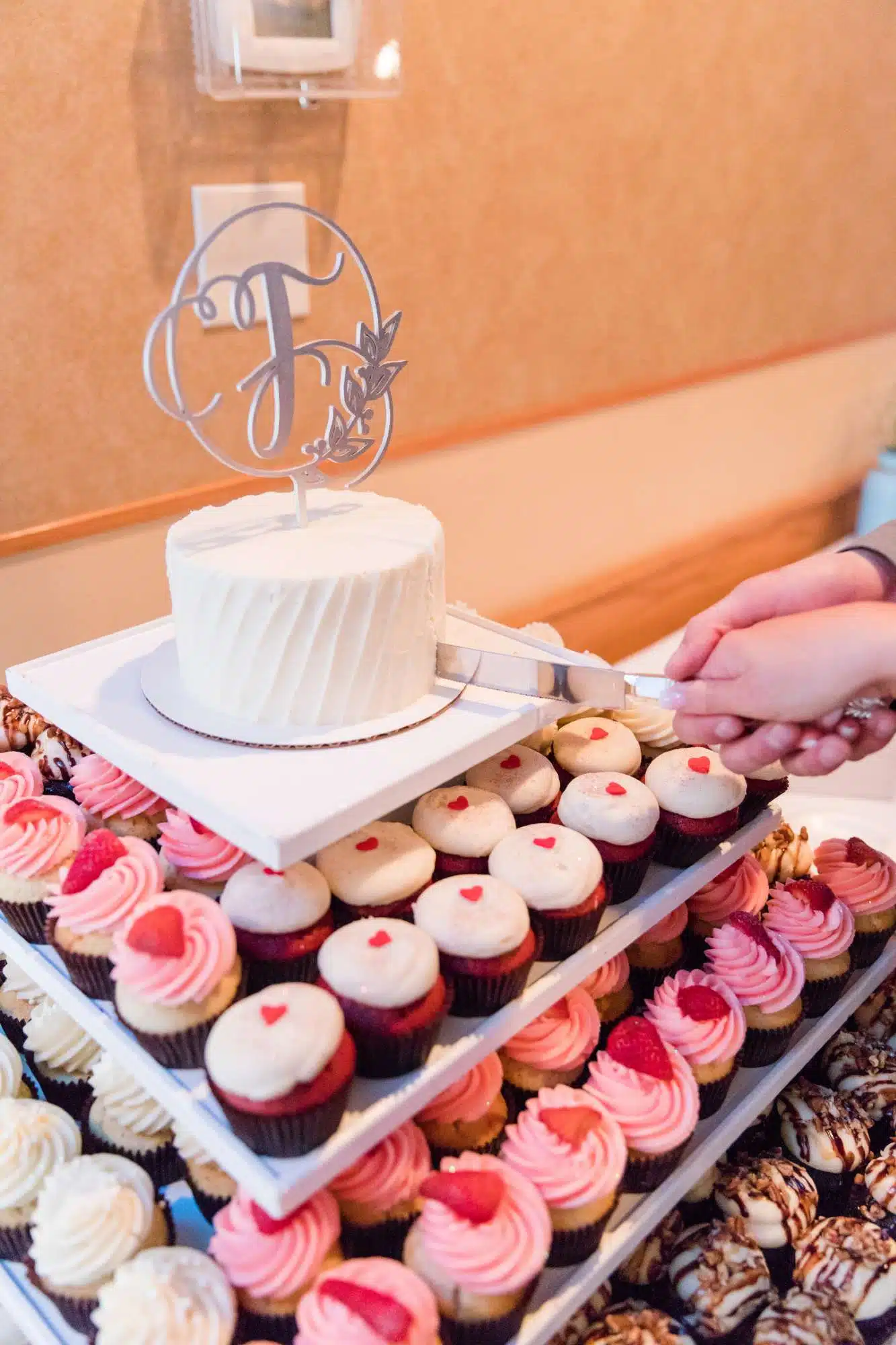 Schedule a complimentary tasting! Choose from up to four different flavors from our daily menu. For your wedding you can choose any flavors of regular size and/ or mini size cupcakes, 6” and 8” cutting cakes of your choosing, tiered wedding cakes, other desserts; brownies, macrons, and cookies.