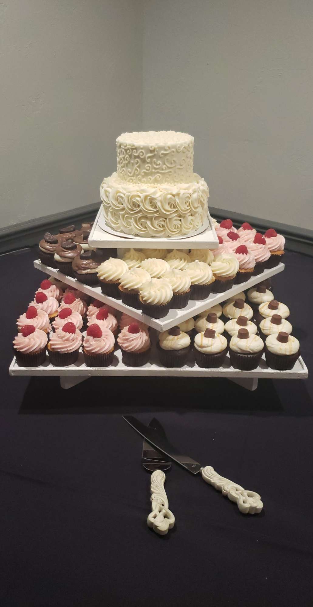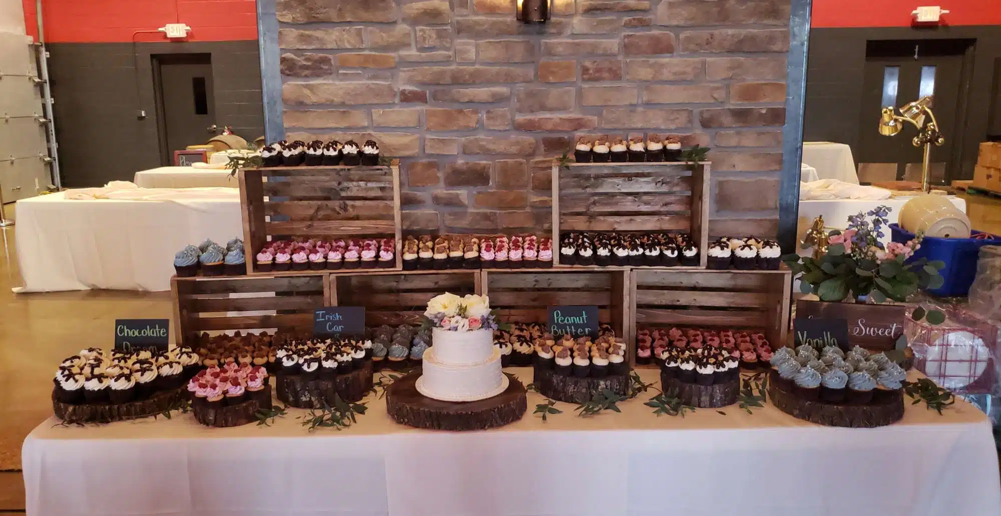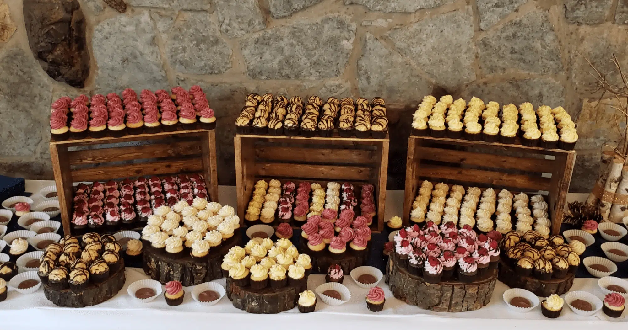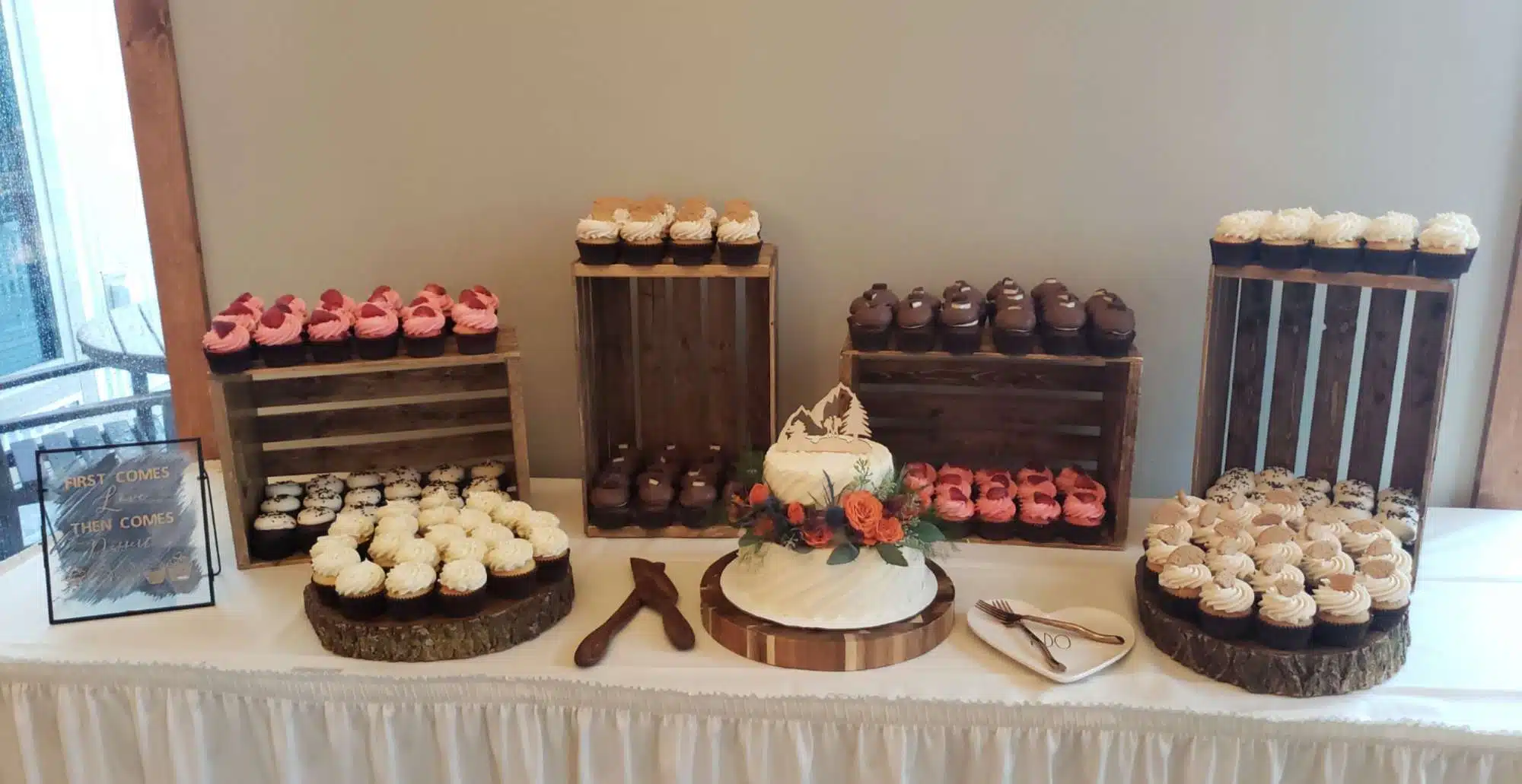 White and rustic cupcake tower or white and rustic stumps and crates are available to rent. We do offer complimentary delivery and set up within 10 miles from our bakery.
