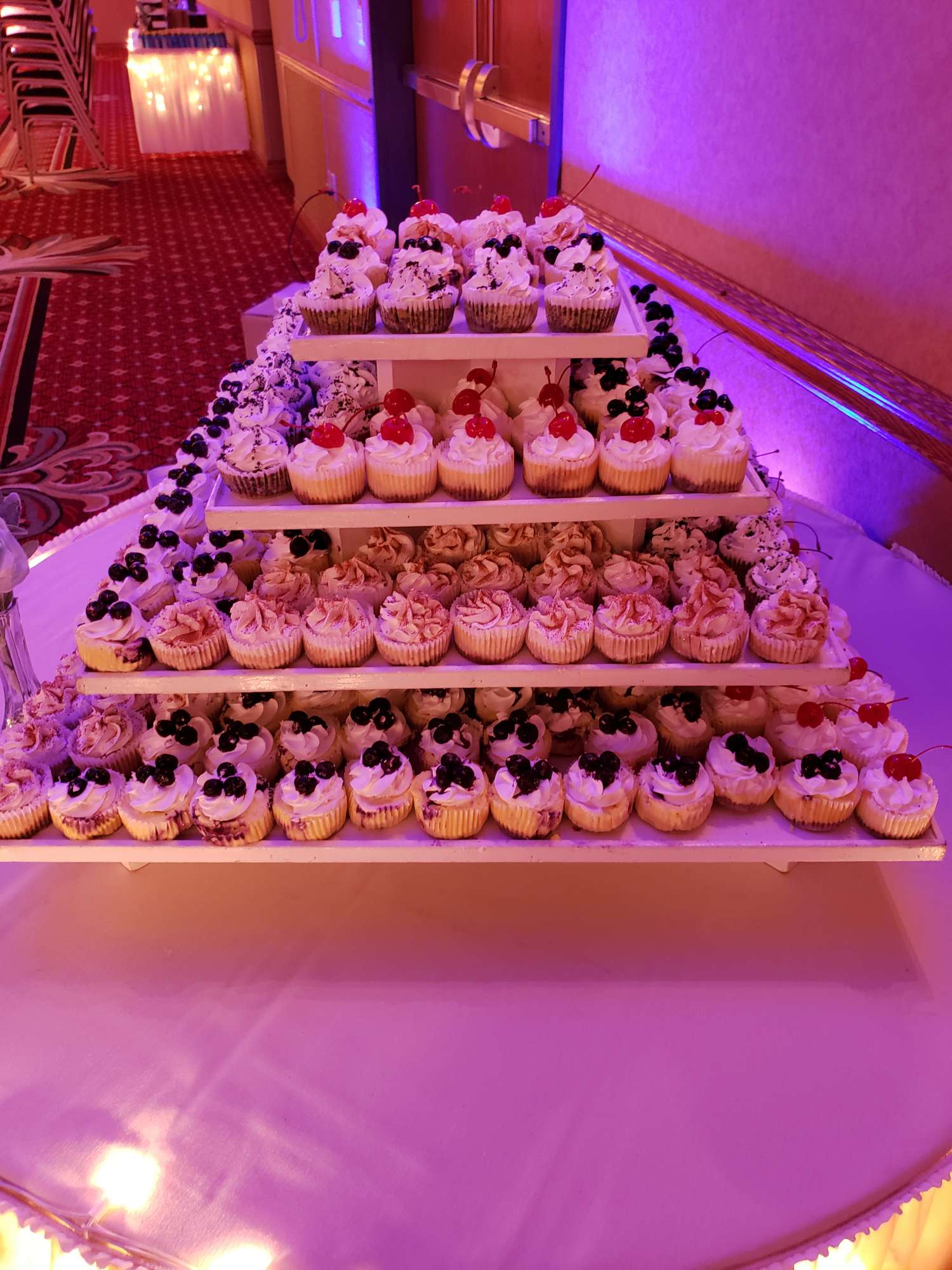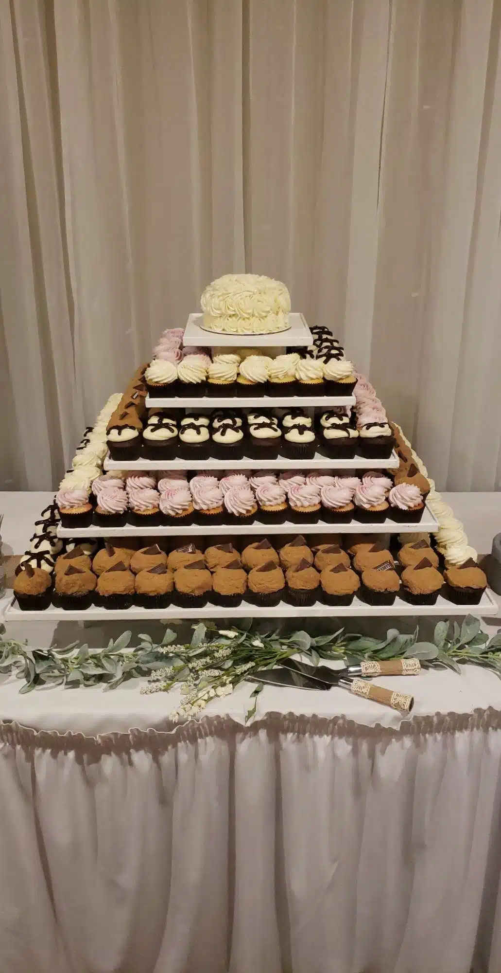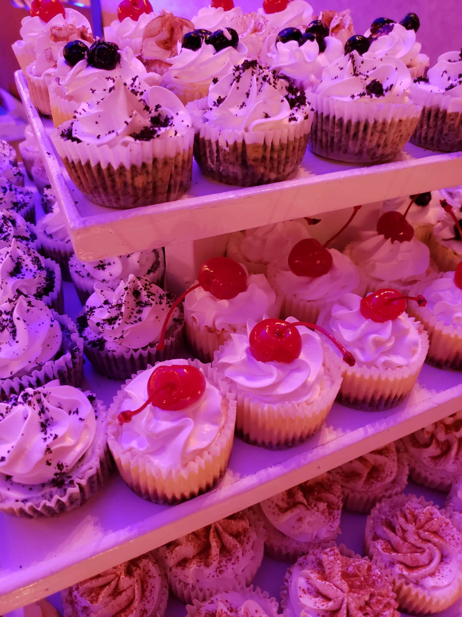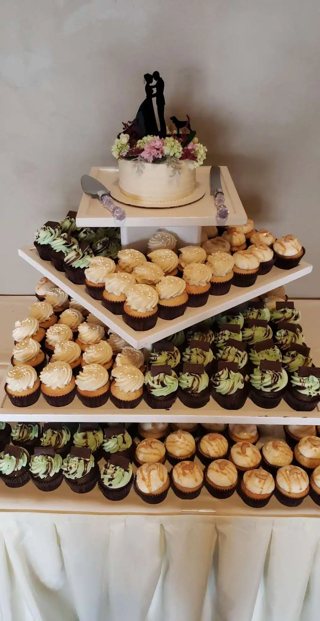 White and rustic cupcake tower or white and rustic stumps and crates are available to rent. We do offer complimentary delivery and set up within 10 miles from our bakery.