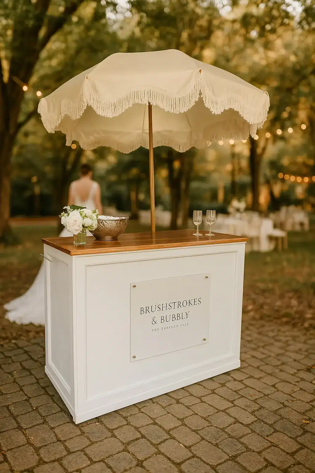 In addition to live watercolor art, Brushstrokes and Bubbly offers the Paint and Pour Bubbly Bar—a vintage-inspired champagne station complete with antique glassware, styled table décor, and a curated pour experience. While we do not provide or sell alcohol, our service adds a whimsical, elegant touch to cocktail hours, receptions, and bridal showers.