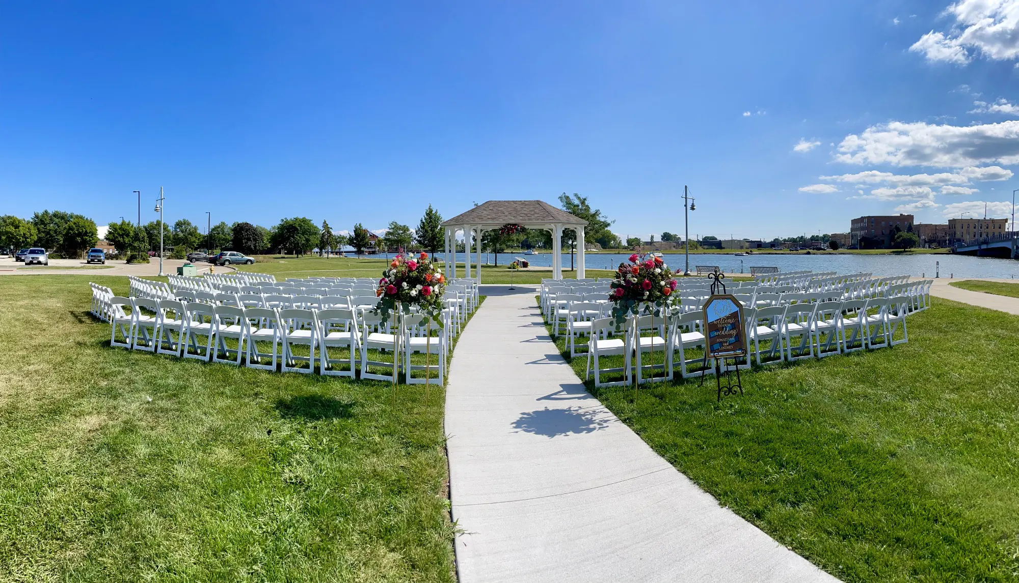 Nestled along the scenic Fox River, the hotel offers a serene setting with breathtaking views. Outdoor ceremonies can accommodate up to 250 guests at Riverside Park, a beautifully landscaped lawn overlooking the river. Elegant white garden chairs and the soothing waters with the newly added gazebo create the perfect backdrop for your vows.
