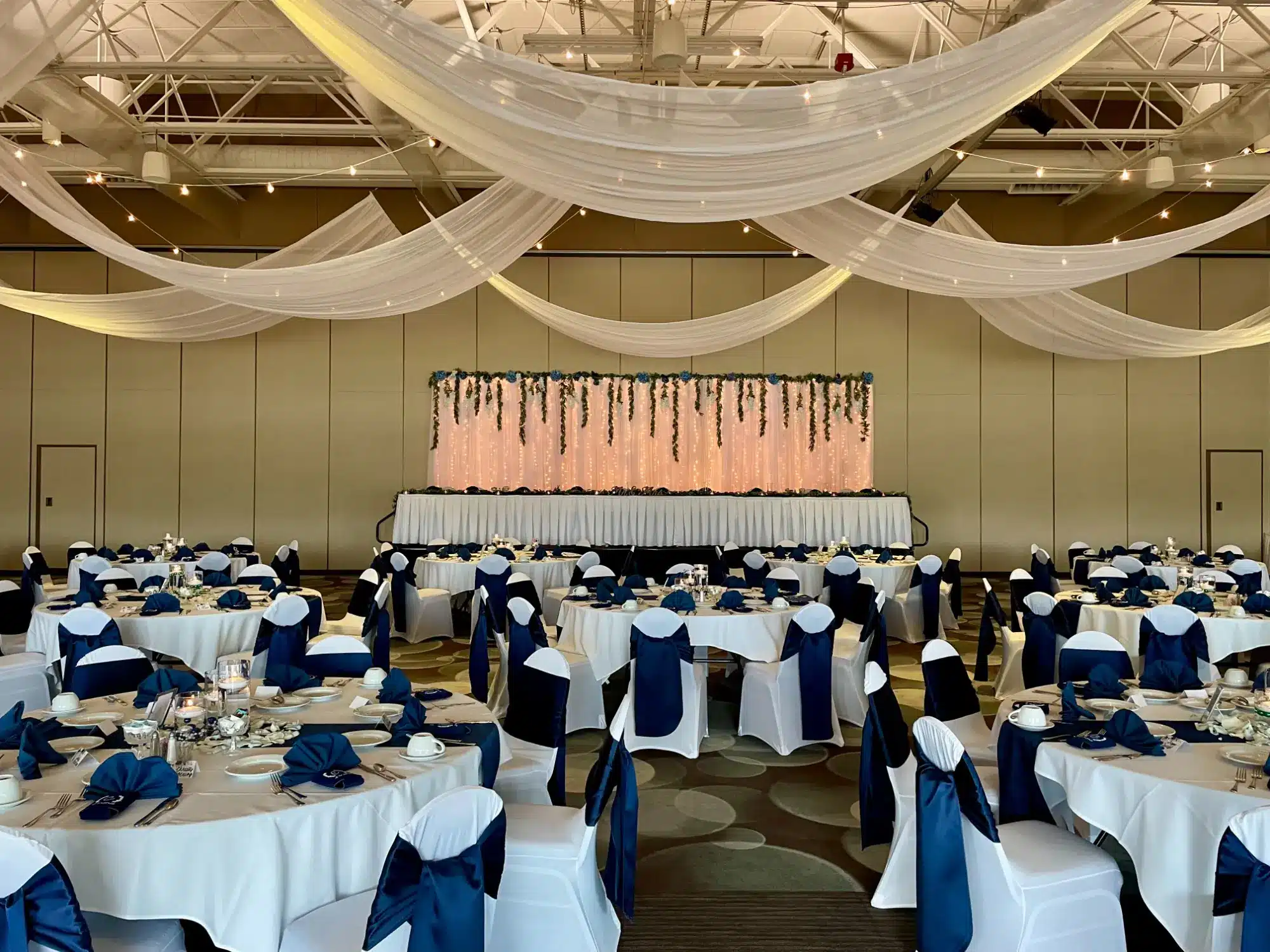 Receptions take place in one of several spectacular event spaces. The renovated Athearn Ballroom hosts up to 200 guests, providing a sophisticated setting with modern chandeliers for dining and dancing. For larger celebrations, the spacious convention center accommodates up to 800 guests. After the festivities, couples and their guests can relax in comfortable, modern, and newly renovated hotel rooms, available at special wedding rates.