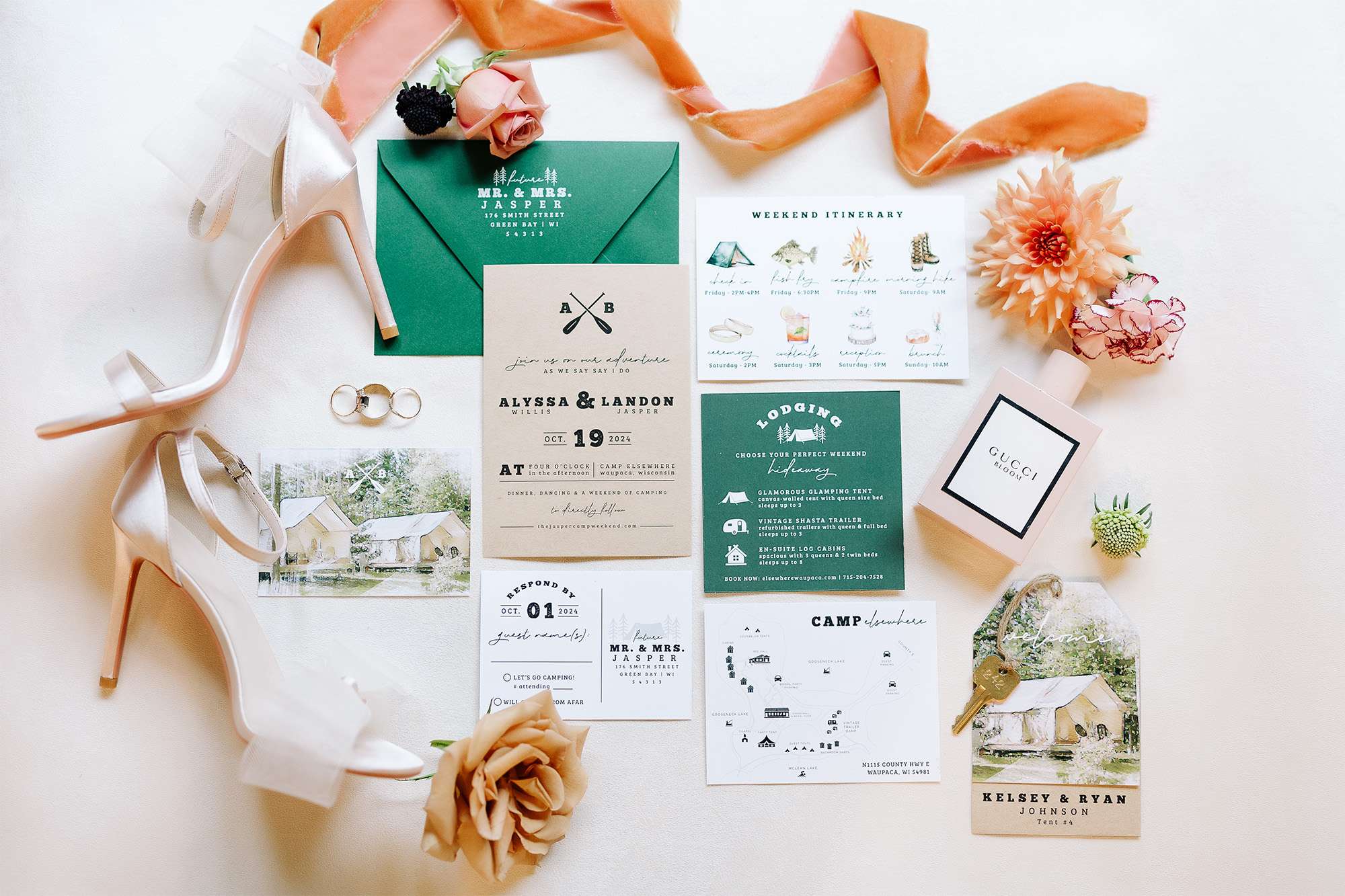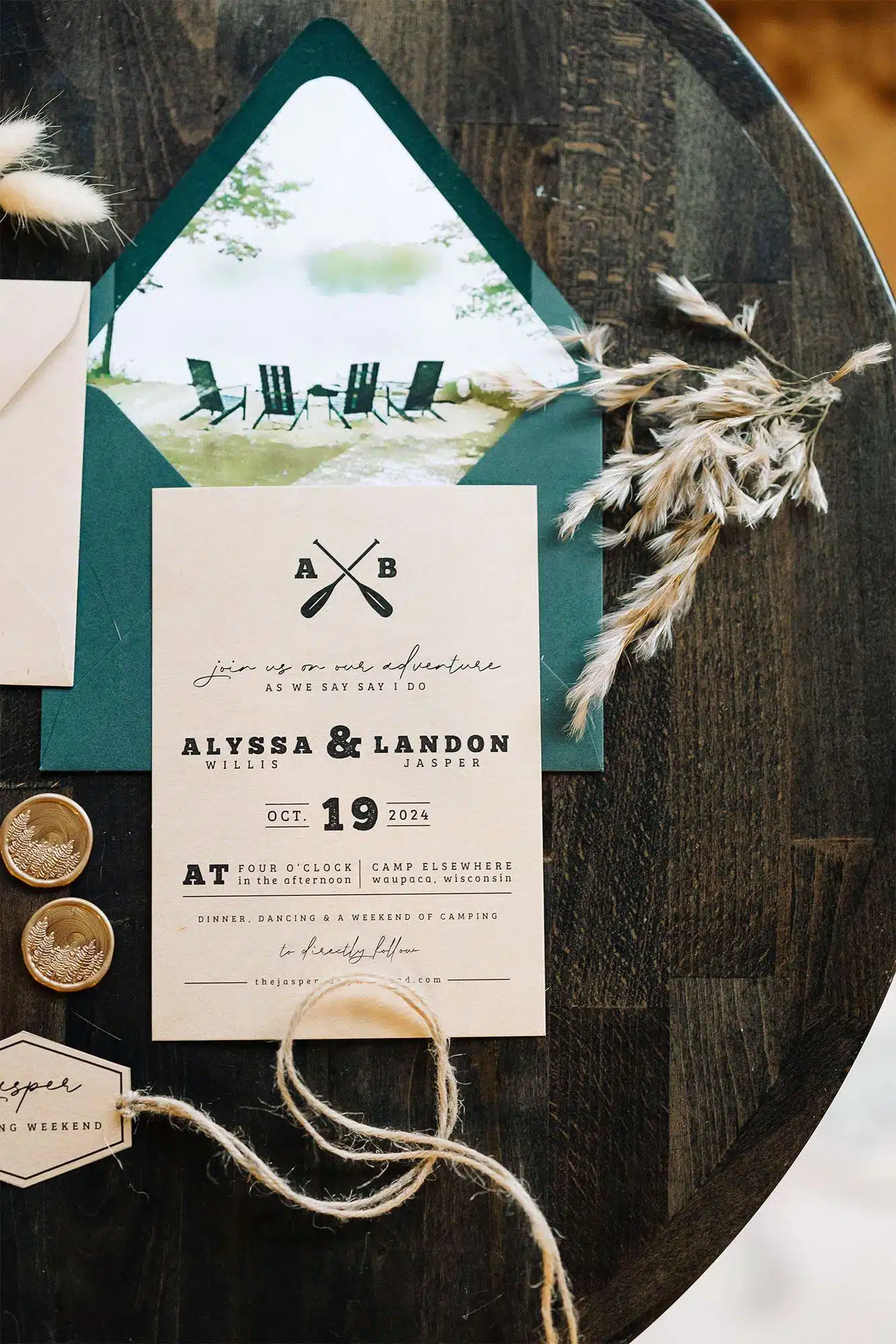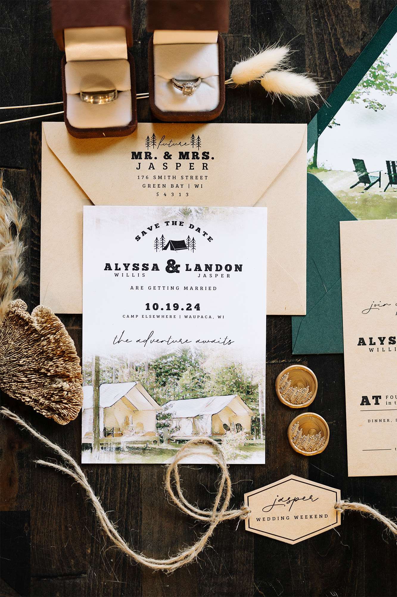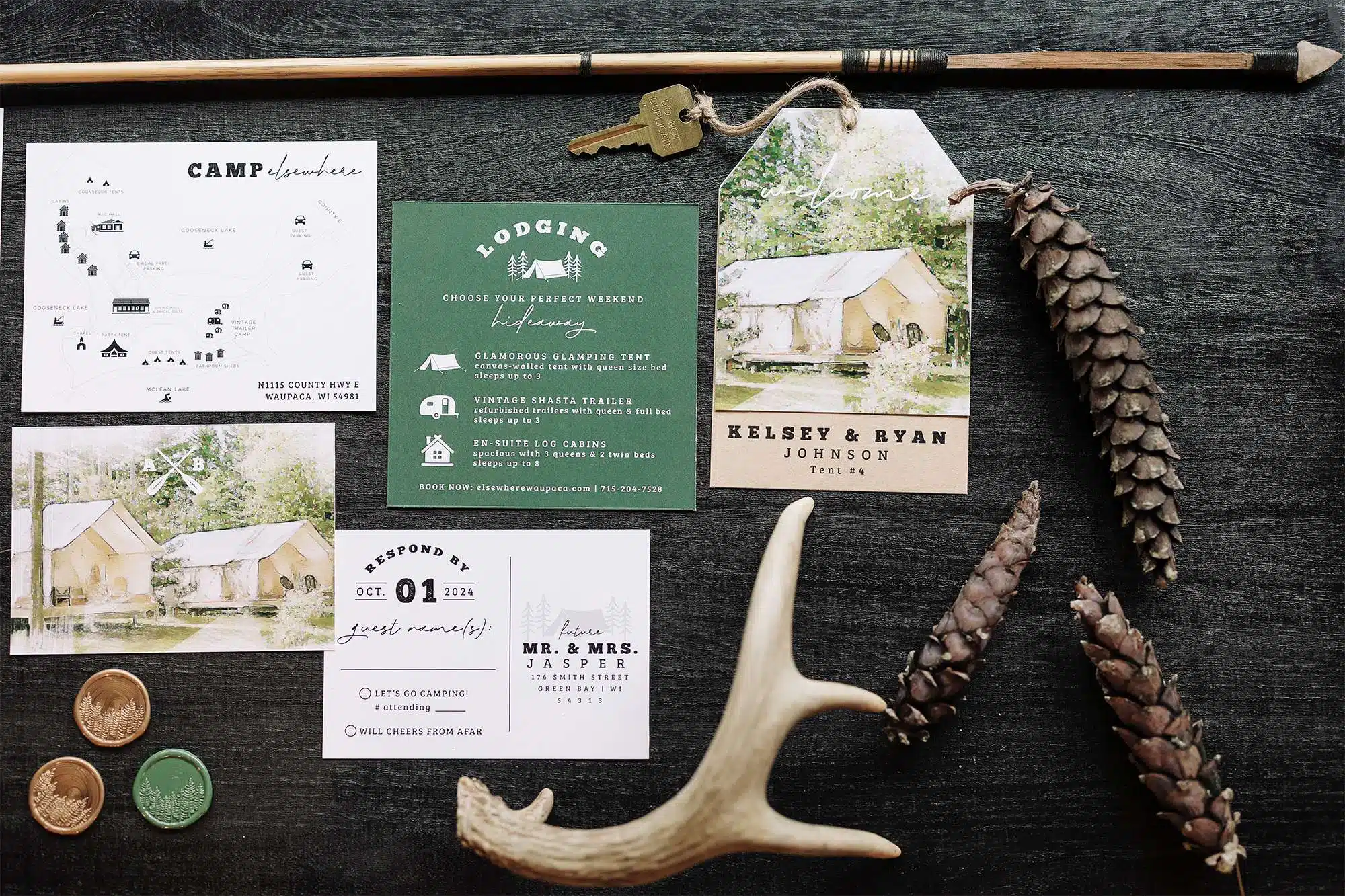 The wedding invitation suite featured in a recent issue of Premier Bride, created by L. Designs, set the tone perfectly for the rustic serene beauty that is Camp Elsewhere.