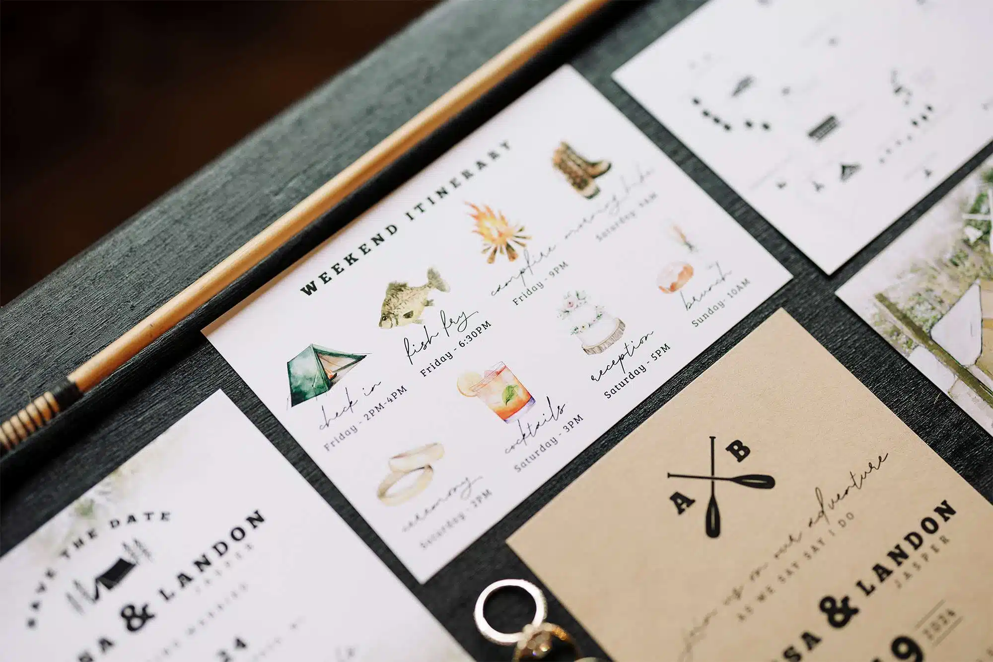 With the venue being a weekend retreat, I was able to create unique guest key tags. The key tags featured the images of the glamping tents that are on-site, along with the guests’ names. This was a fun add-on that you typically do not see with regular venues.